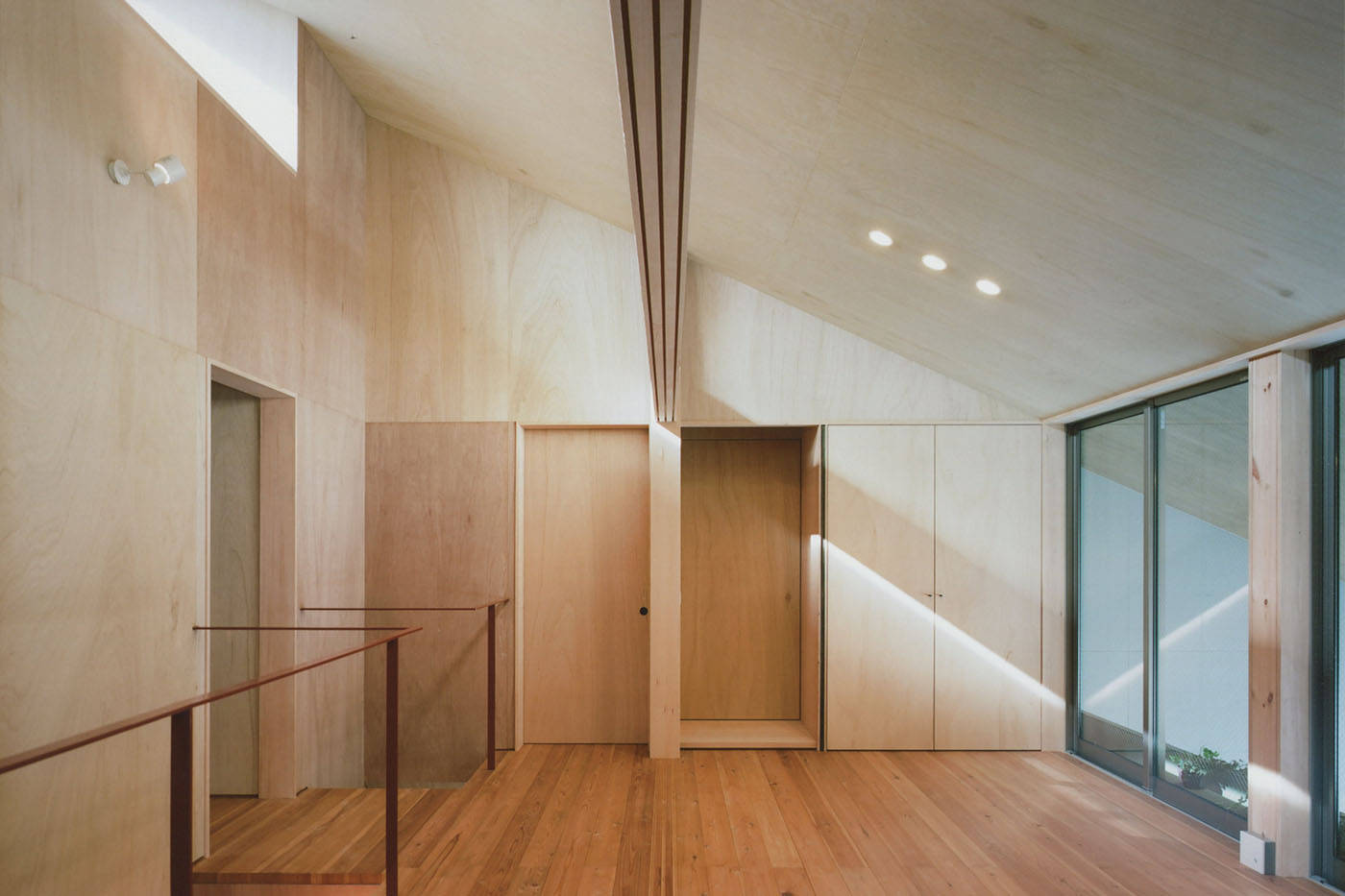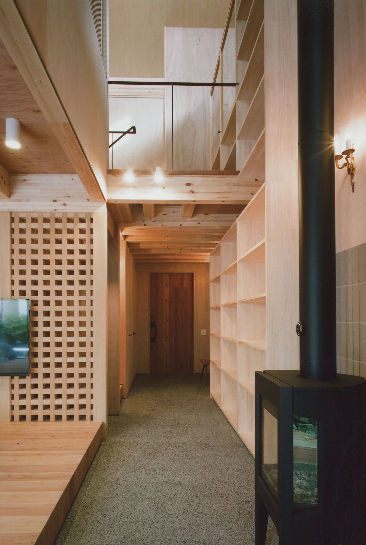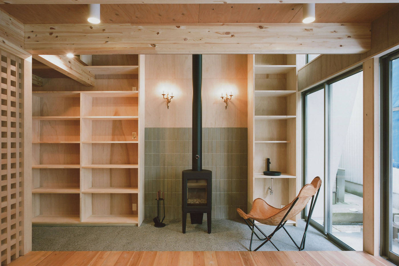 これは、蓄熱暖房機+燃焼系ストーブ+上部ファン+一室空間によって確保した。北陸の厳しい冬の環境下でのシェルターのような役割を果たすこの大屋根の家は、冬場のみならず、その形状から、夏場も風が通り、大変涼しく、自然環境と時には共存し、又対峙する、そんな住宅である。