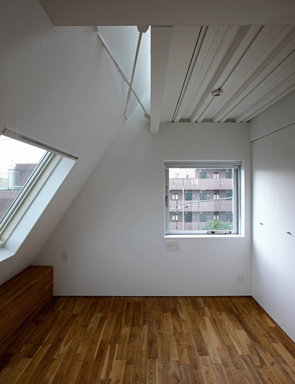 5人+1匹家族の生活の場が積層された、建坪10坪の『2世帯住宅』。 雑然として将来の状況をイメージしにくい周辺環境のなか、周りと柔らかく関係を取り結ぶ住宅を目指しました。 地下の親世帯LDKにバウンドする光、街路の延長のような玄関空間、障子で濾過された光、光・風・音を輸送する階段、周辺環境を水平のパノラマに切り取る横長連続窓、屋根裏部屋のような個室・・・様々な距離感で外部を感じられる住宅です。