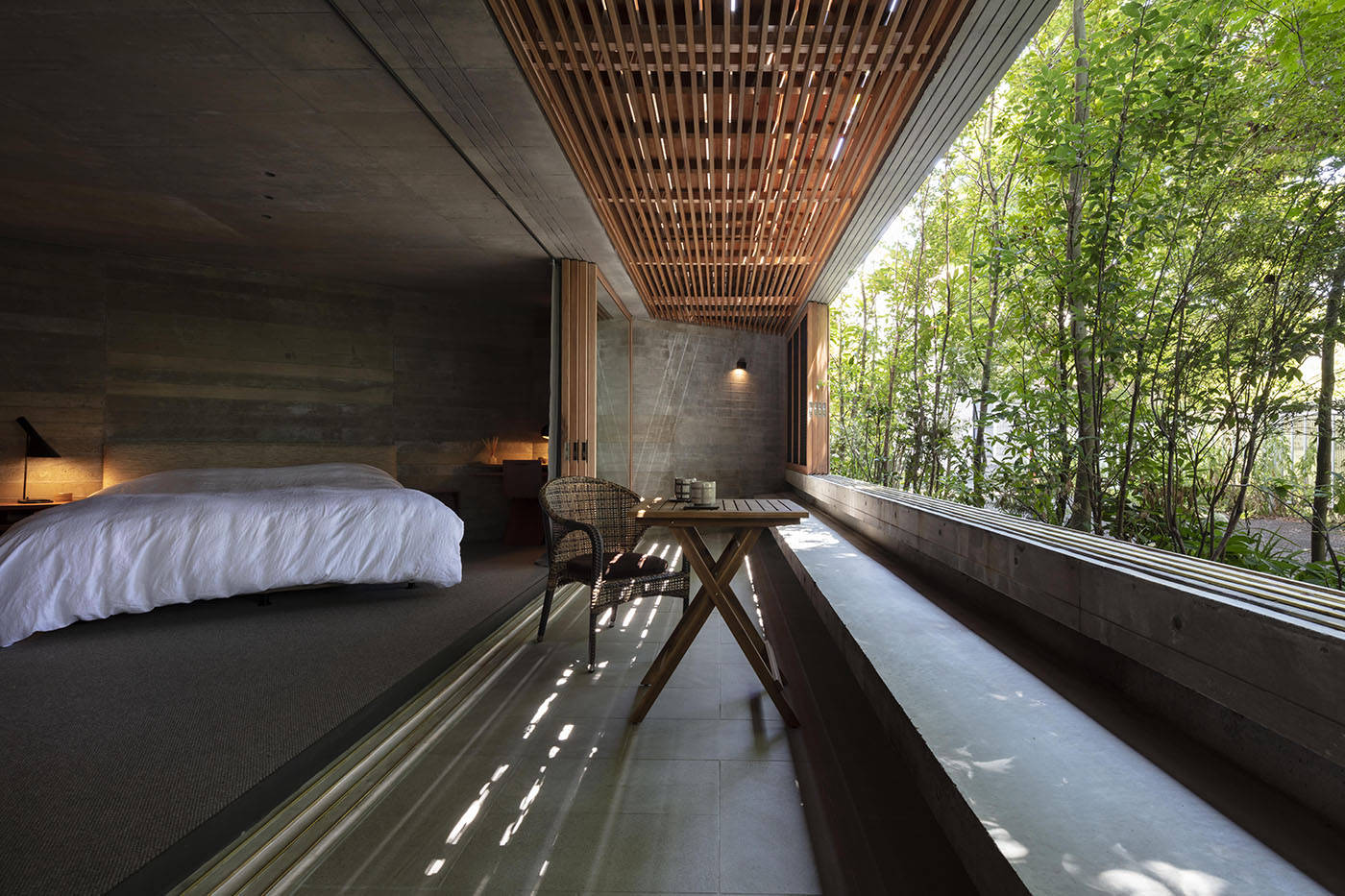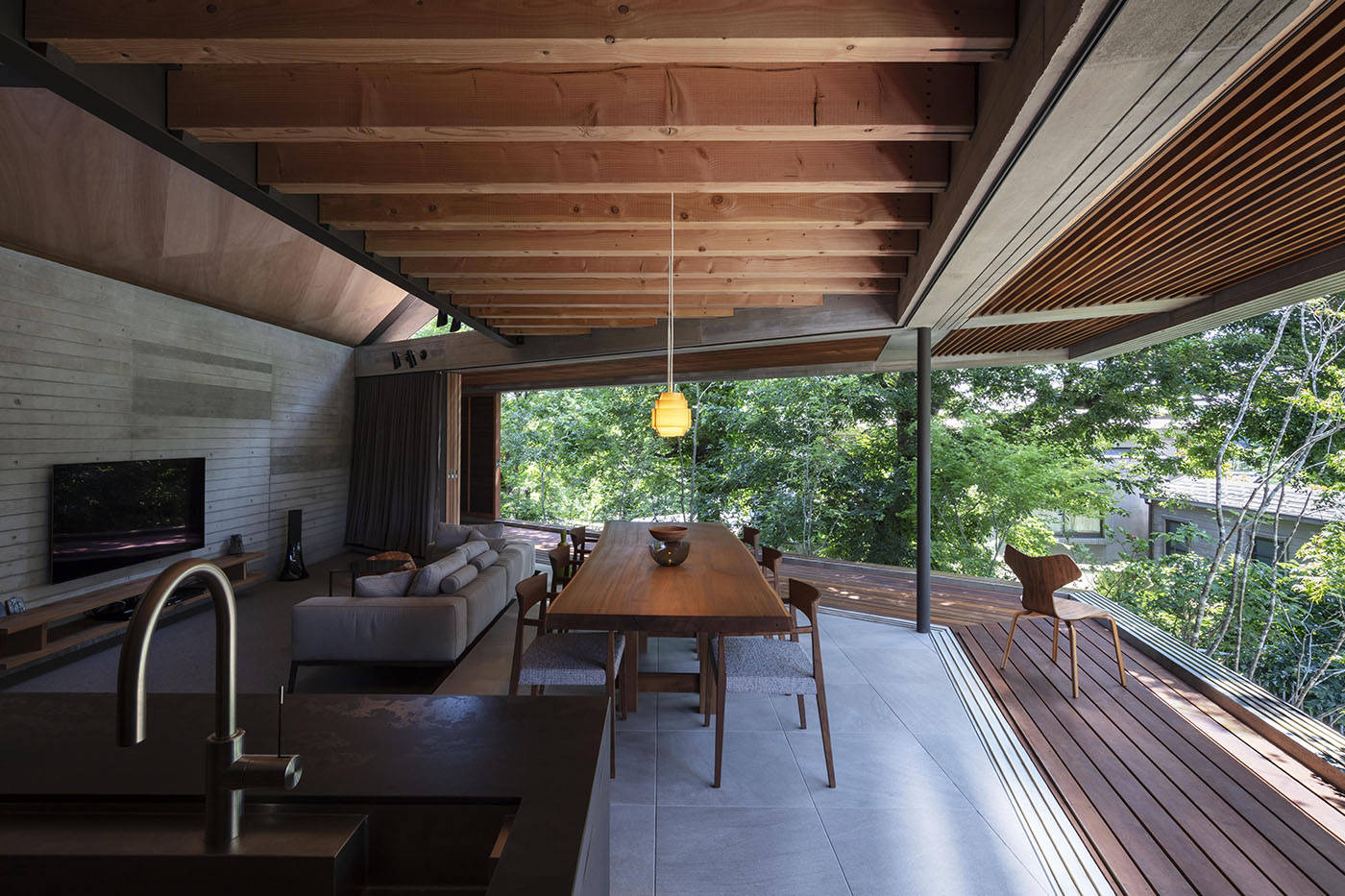 そして、これを可能にしているのが、緑地帯と室内を曖昧に繋ぐ中間領域である。この中間領域は2重の建具により仕切られ、それらを開け閉めすることで自然環境をコントロールし、エアコンのない生活を実現させている。このように季節に応じて室内環境が日々変化する建築はまるで生き物のようであり、「もの」とは対極にある存在となる。