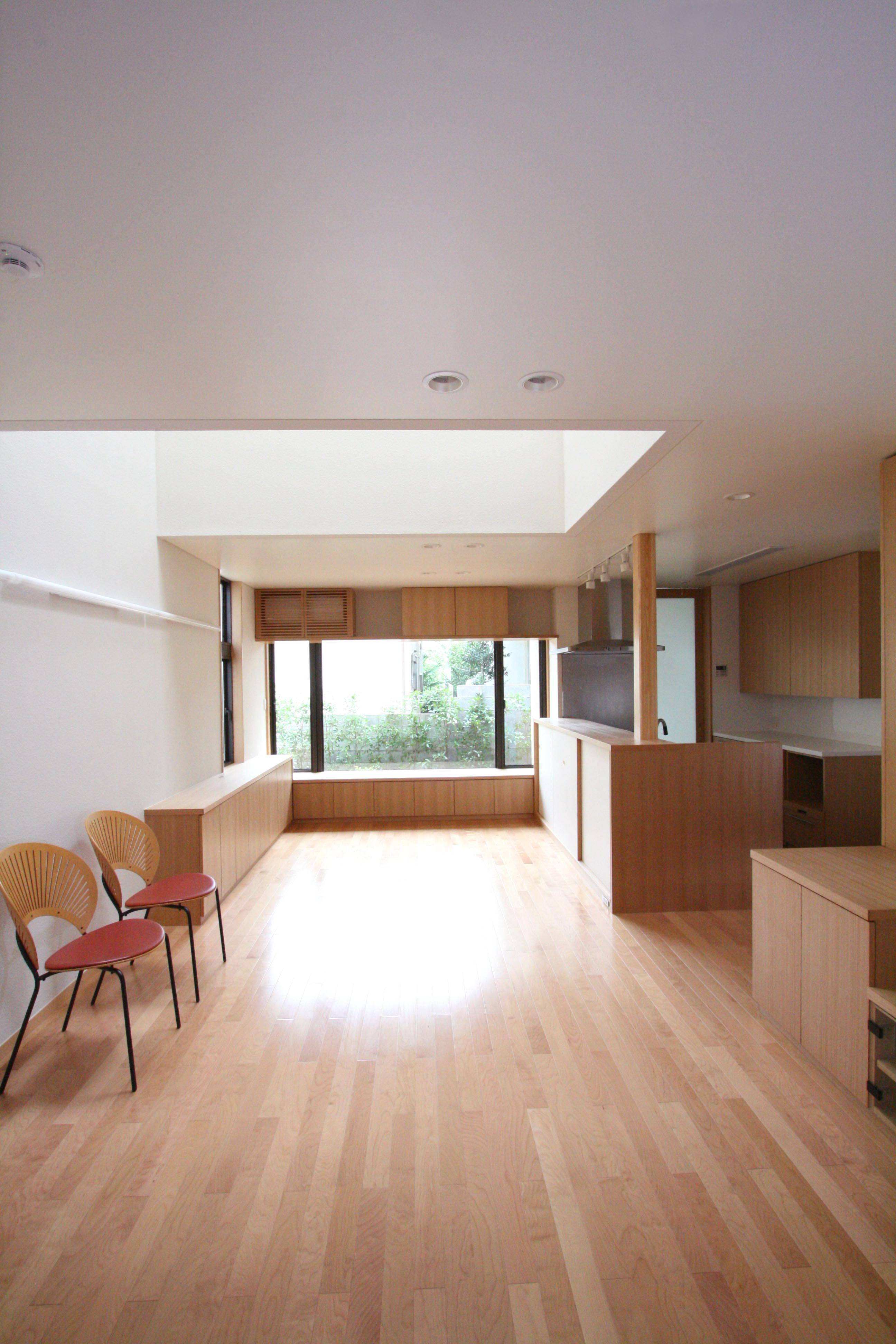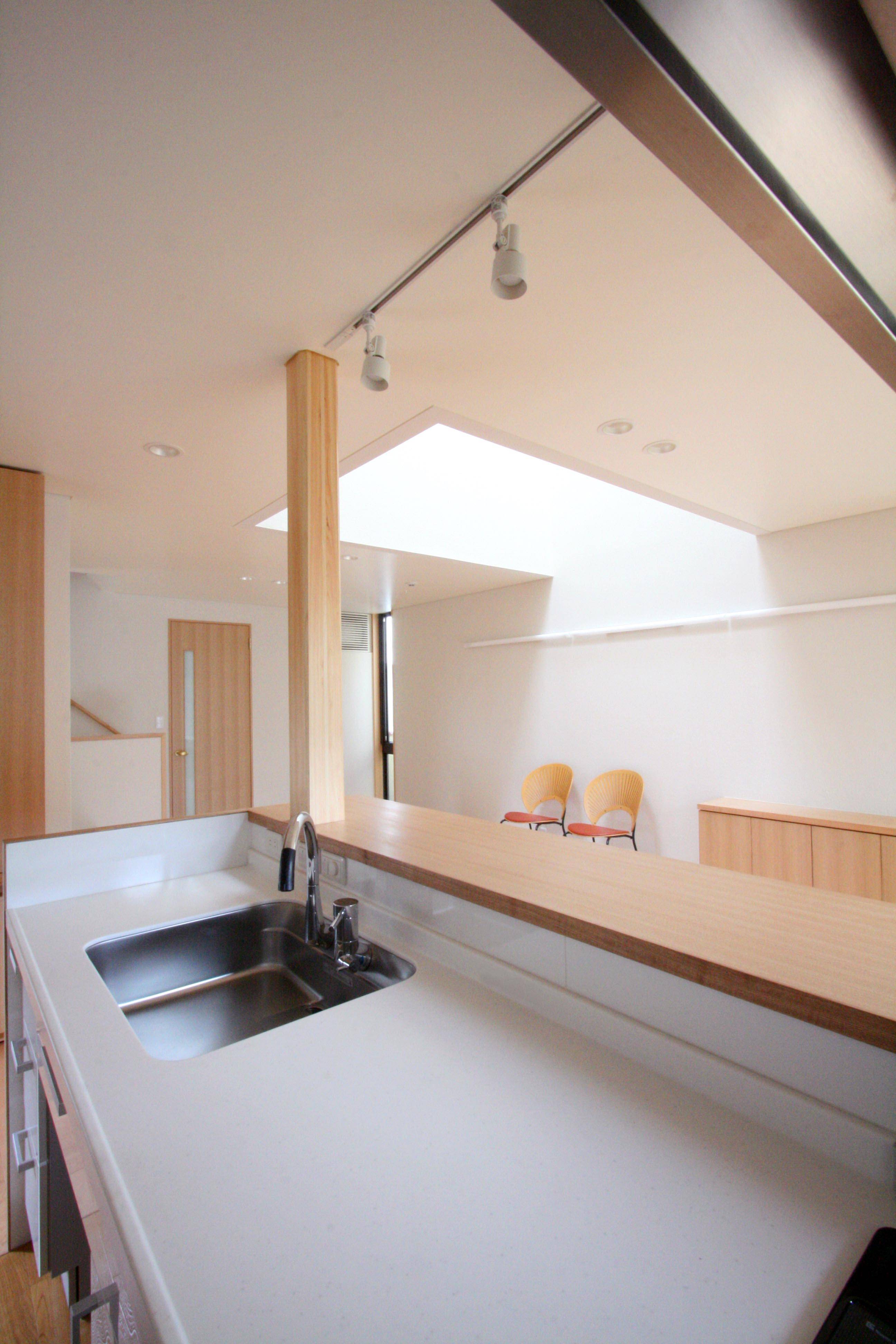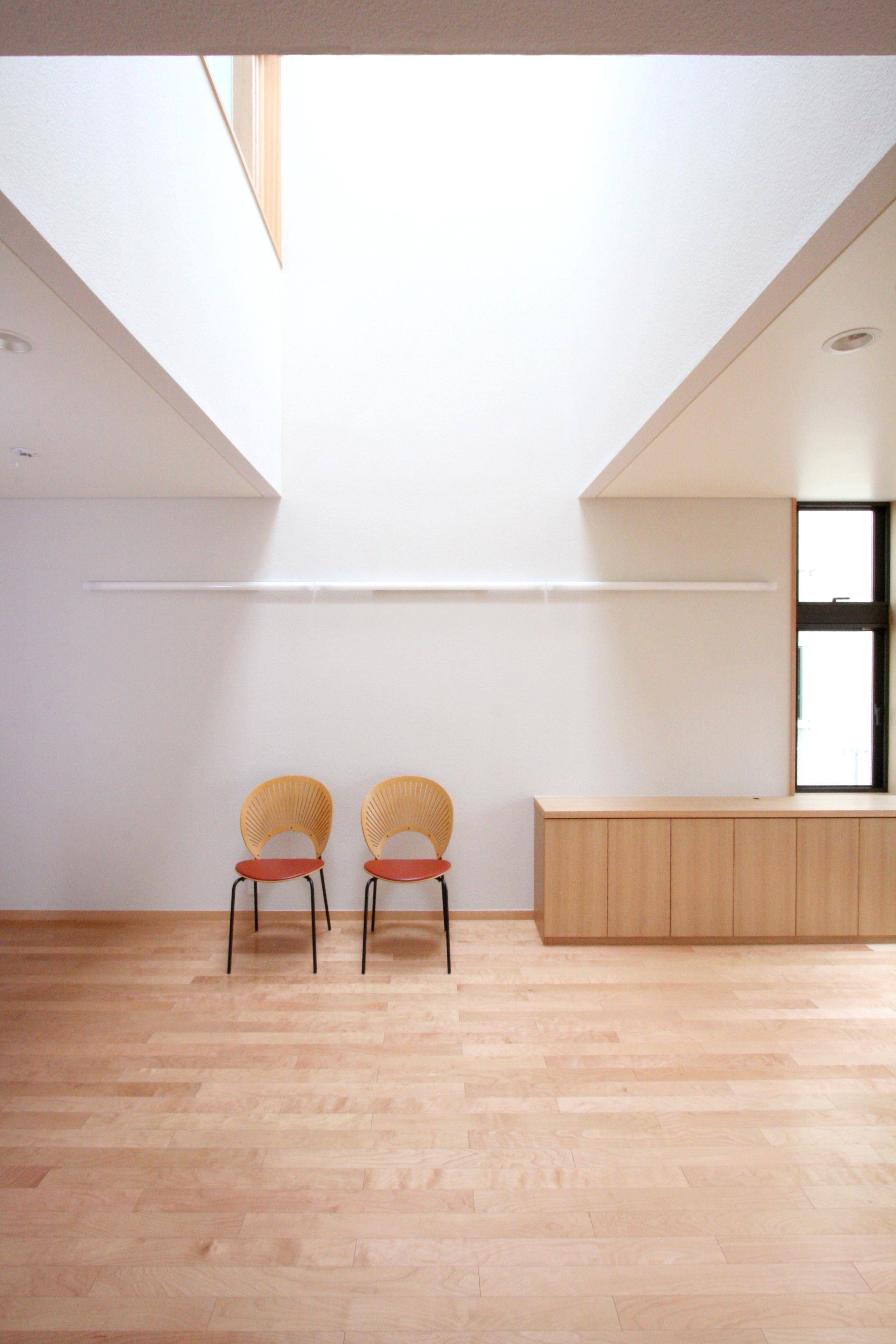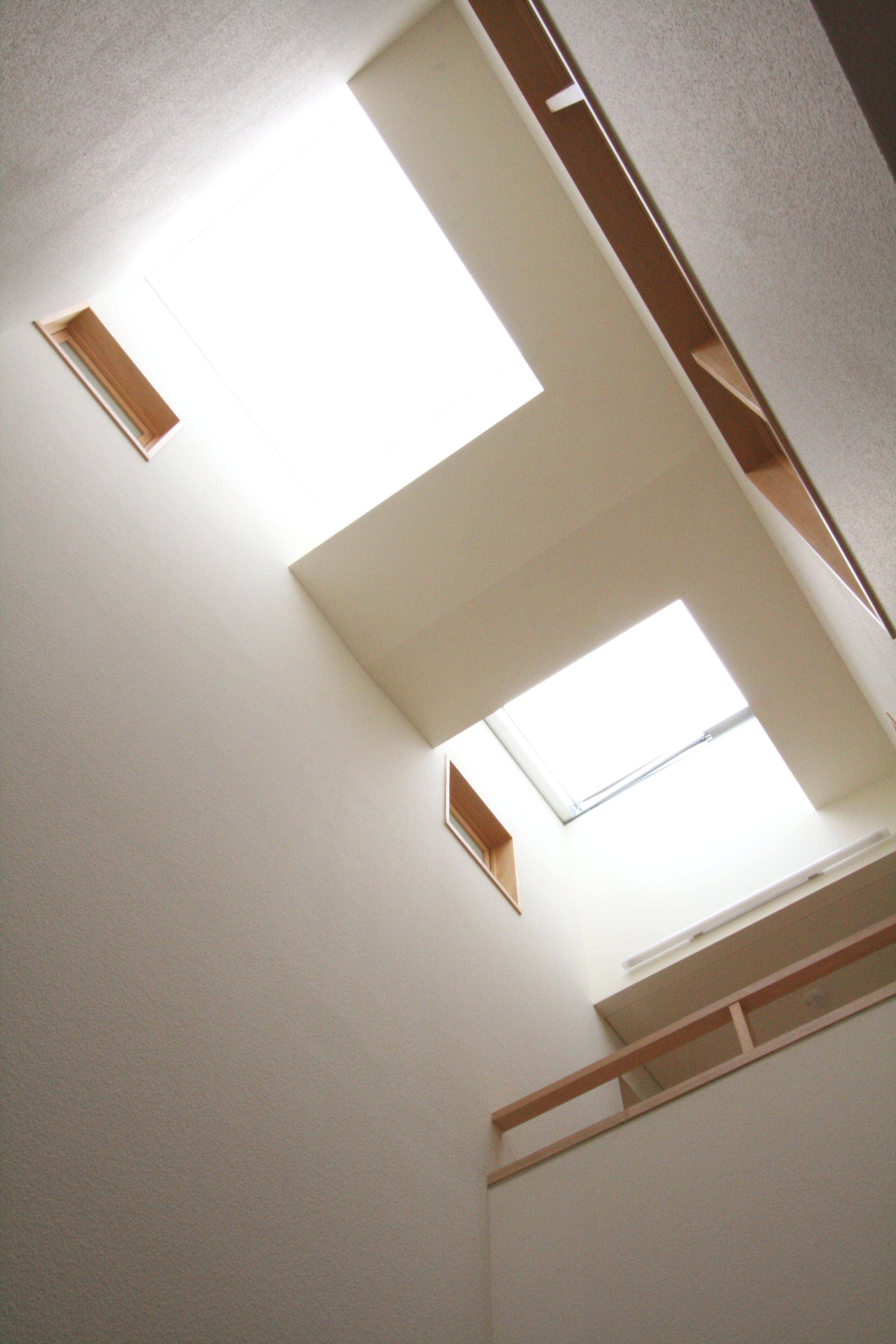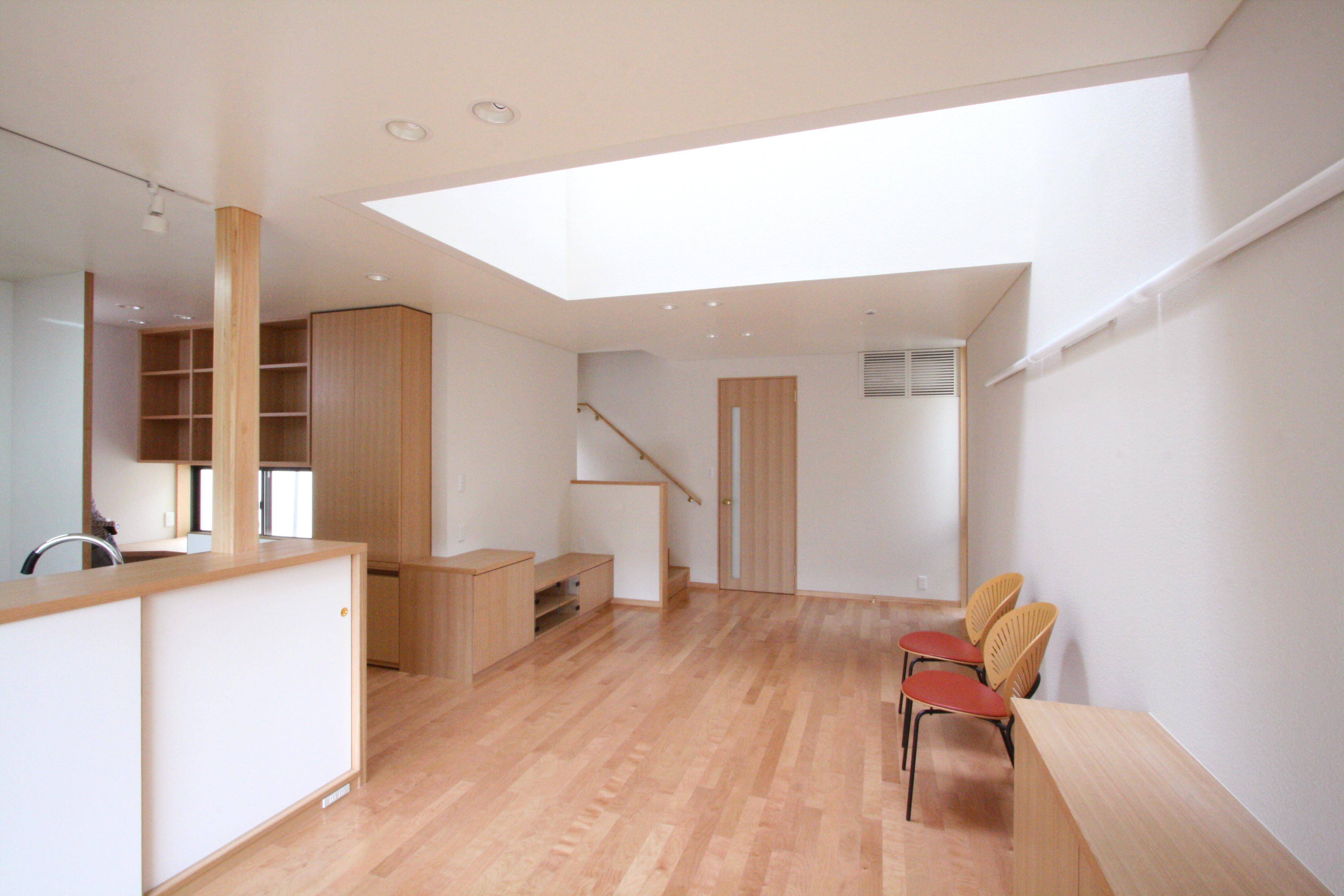 そこで、南側に向いた家ではなく空を意識した家とし、家の中央部に2坪分程度の吹抜(トップライト)を設け、ここから全ての部屋に光を採り入れ、風が抜け、各室の自然な換気がとれる家としました。