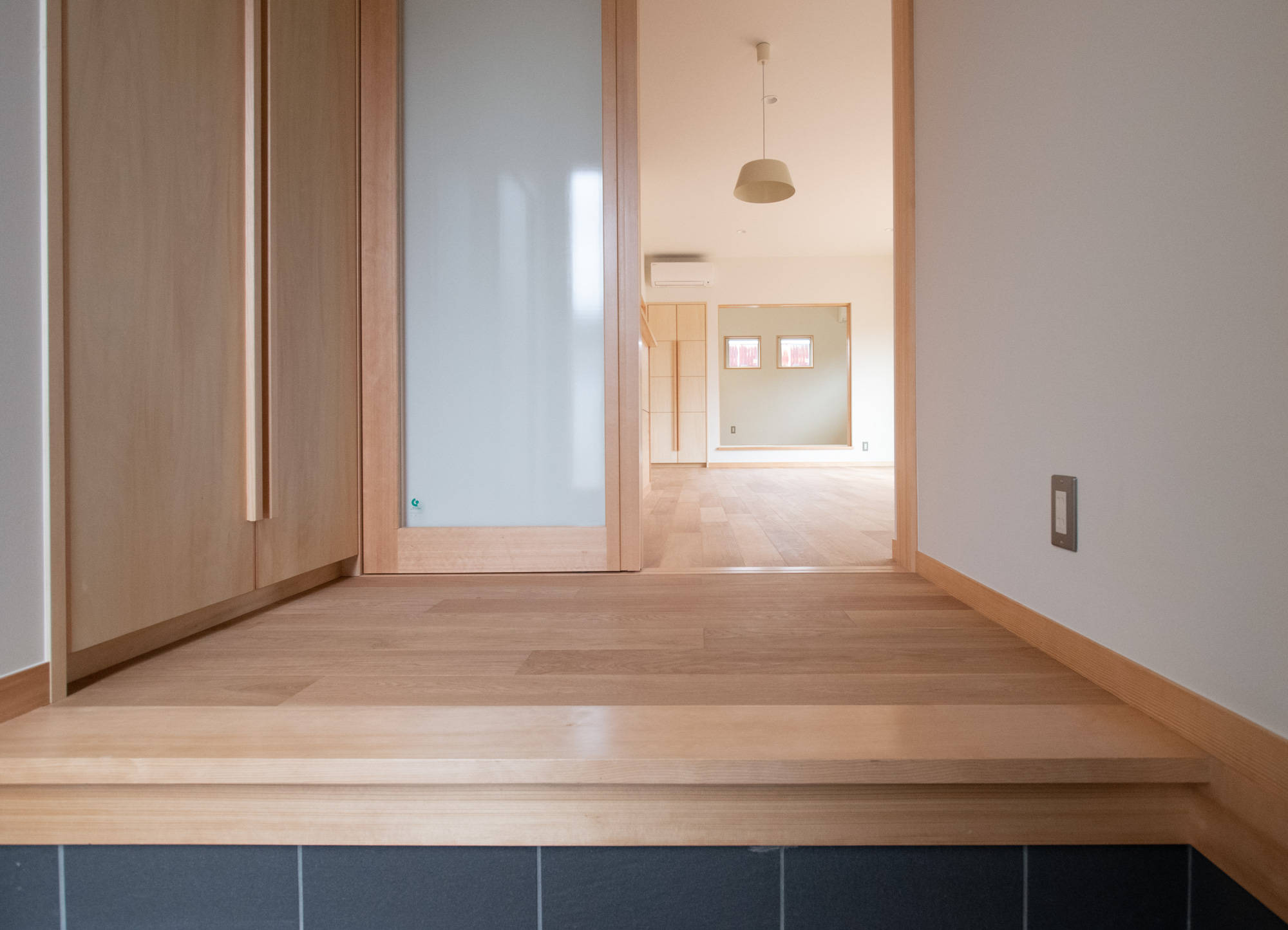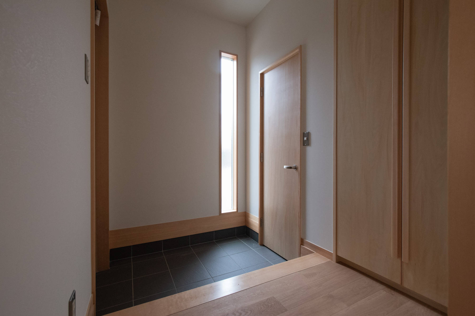 リビングと同じように、乱雑になりがちな玄関。この家は、玄関部分もすっきりとさせるために、別室のシューズクロークと作りつけのコート、バック置き場を作りました。