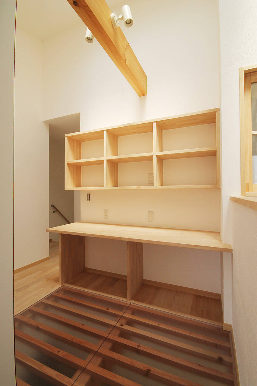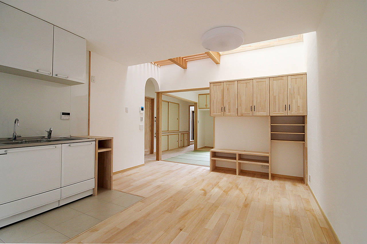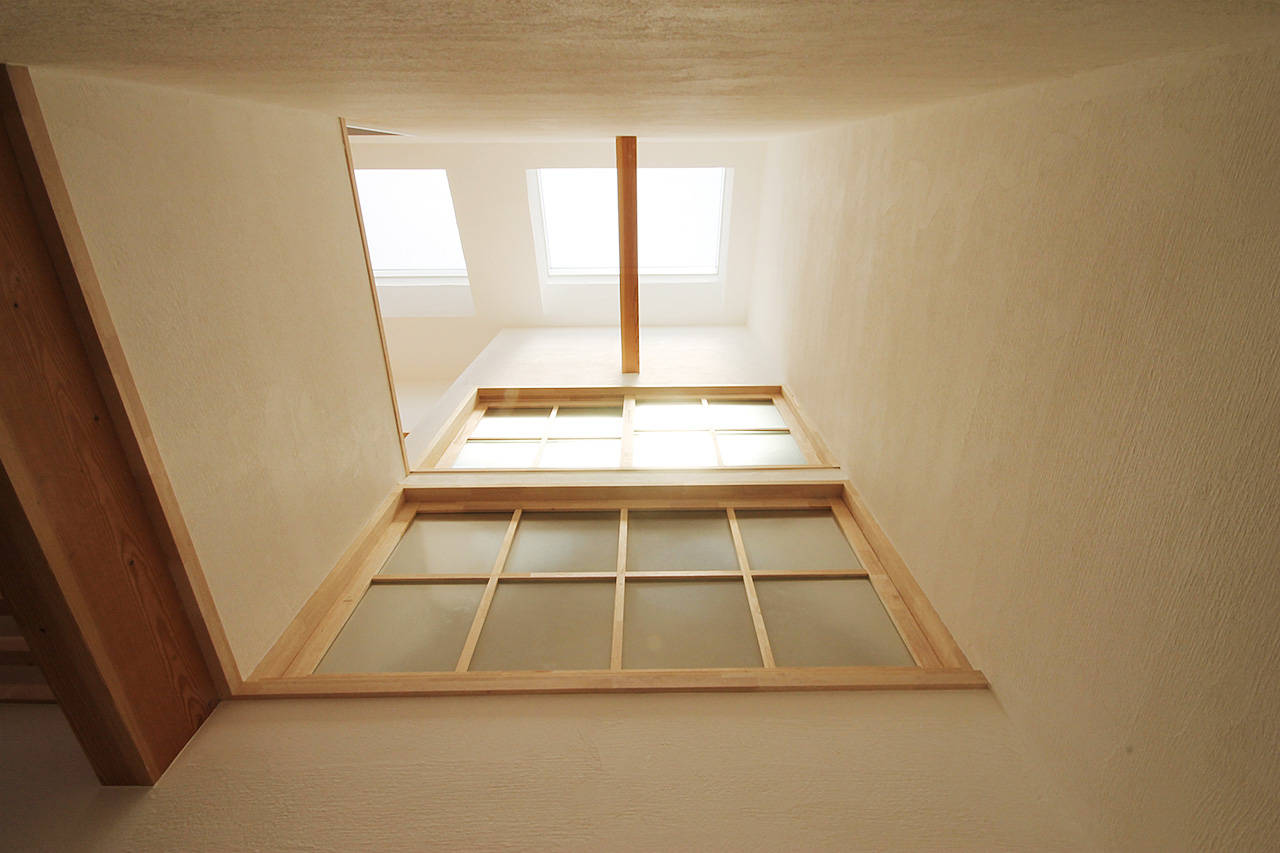 京都市山科区のうなぎの寝床の細長い土地にご夫婦とお子さん、お父さん、お母さんの三世帯が暮らすための家が完成した。光を1階に取り入れるため、天窓、光廊下、吹抜などを計画した。