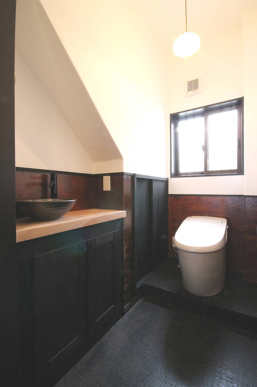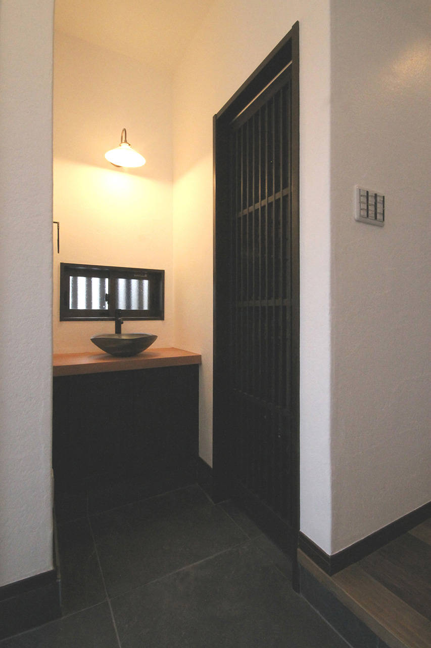 洗面、キッチンのカウンターには重厚間のあるみずめ桜の一枚板を採用した。
