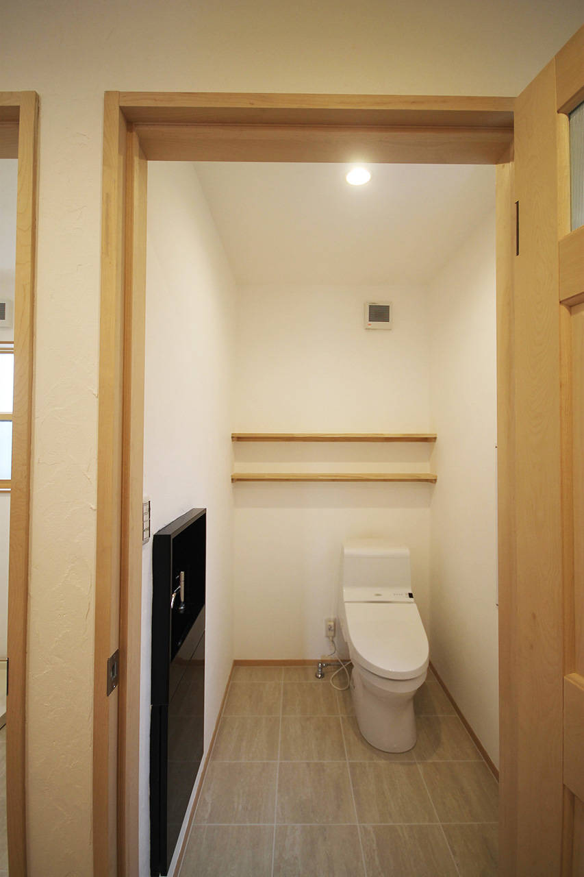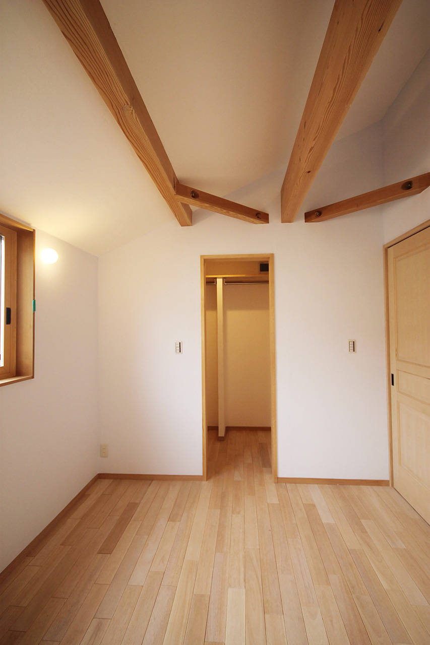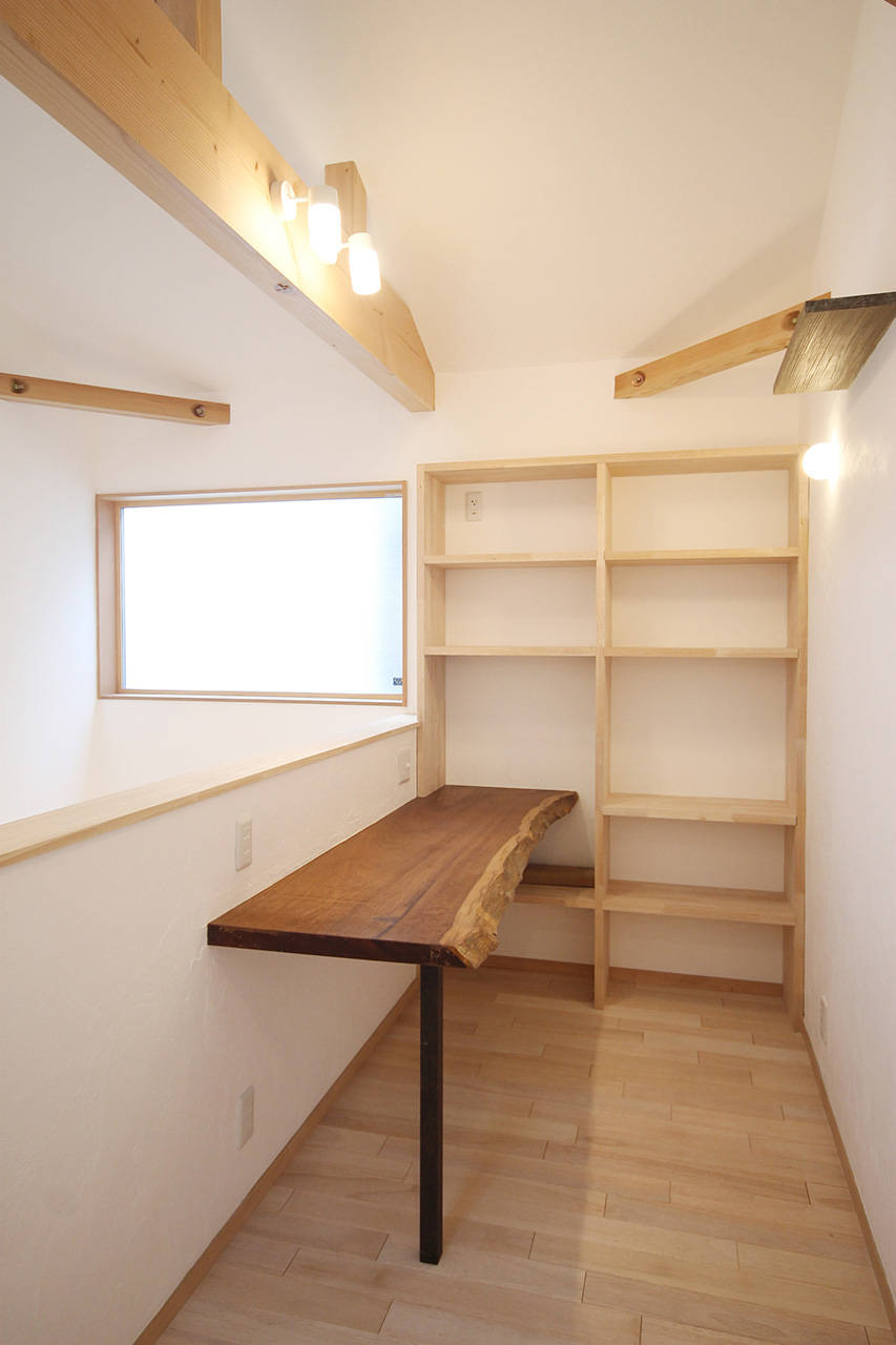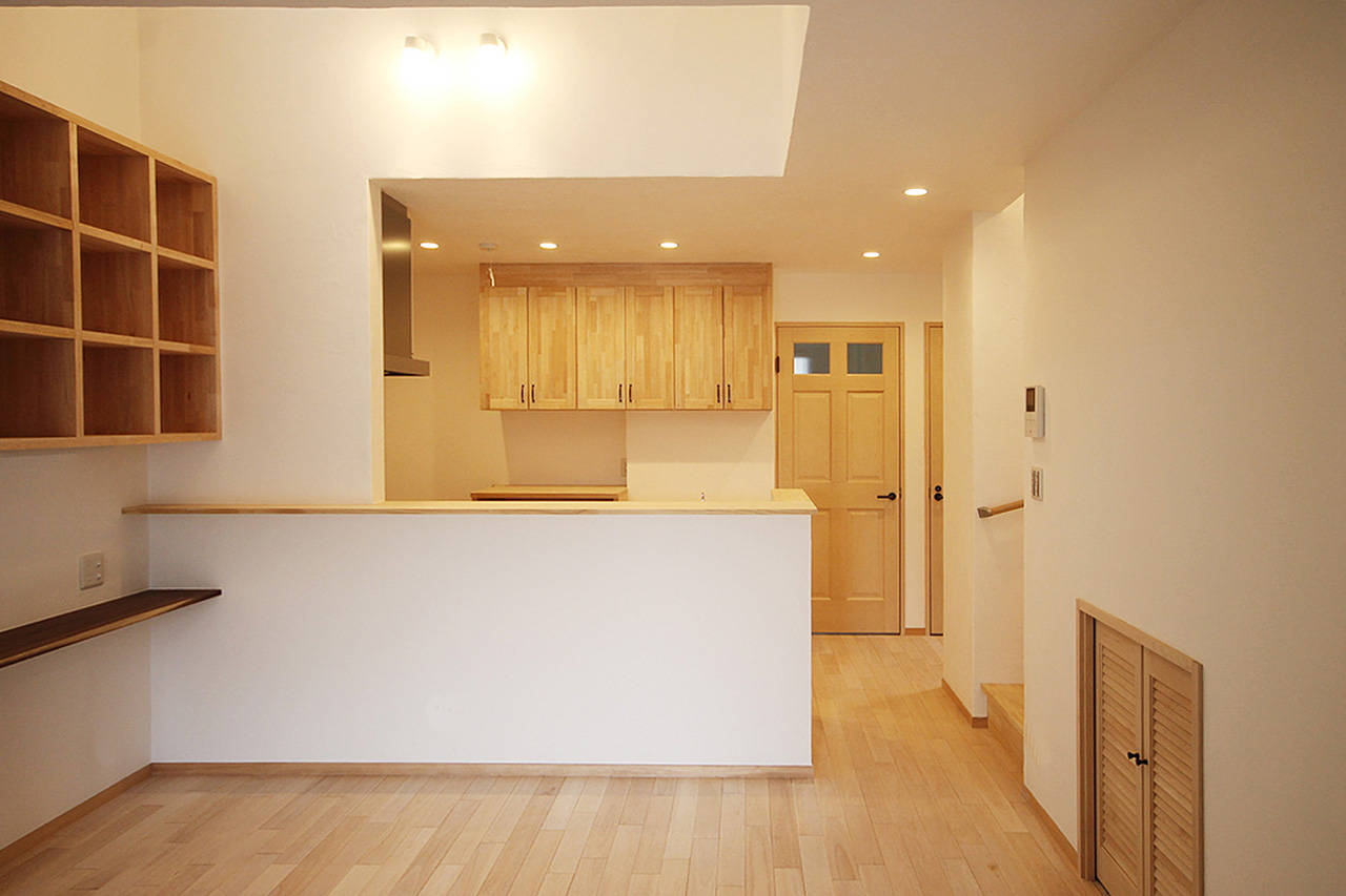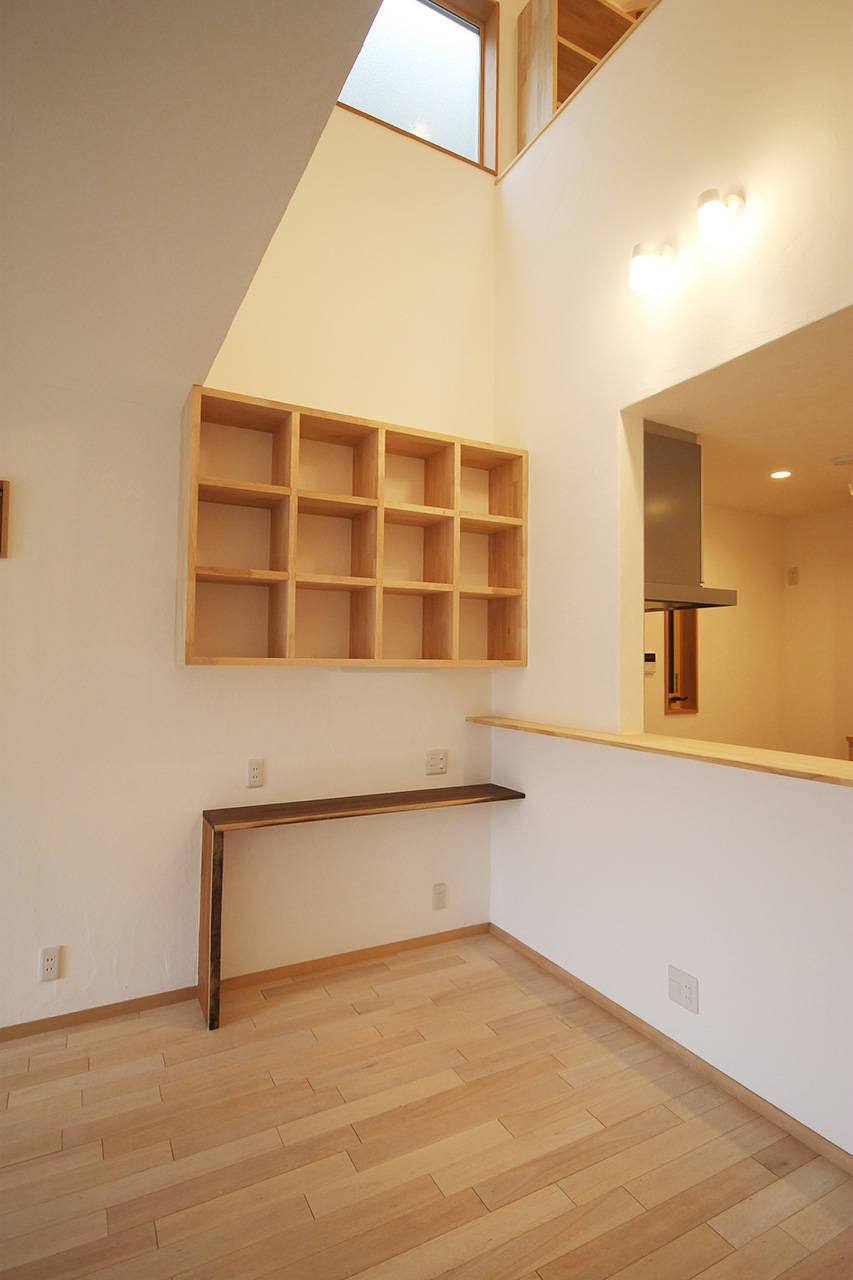 吹抜けや屋上を設けることにより間口の狭い土地に明かりを取り込むよう工夫した。リビングと二階のつながらりを重視して開放的な空間としている。そのため断熱にはしっかり施した。構造、断熱材、仕上げすべての素材に極力接着剤等を用いないようにして、室内の空気環境にこだわった。