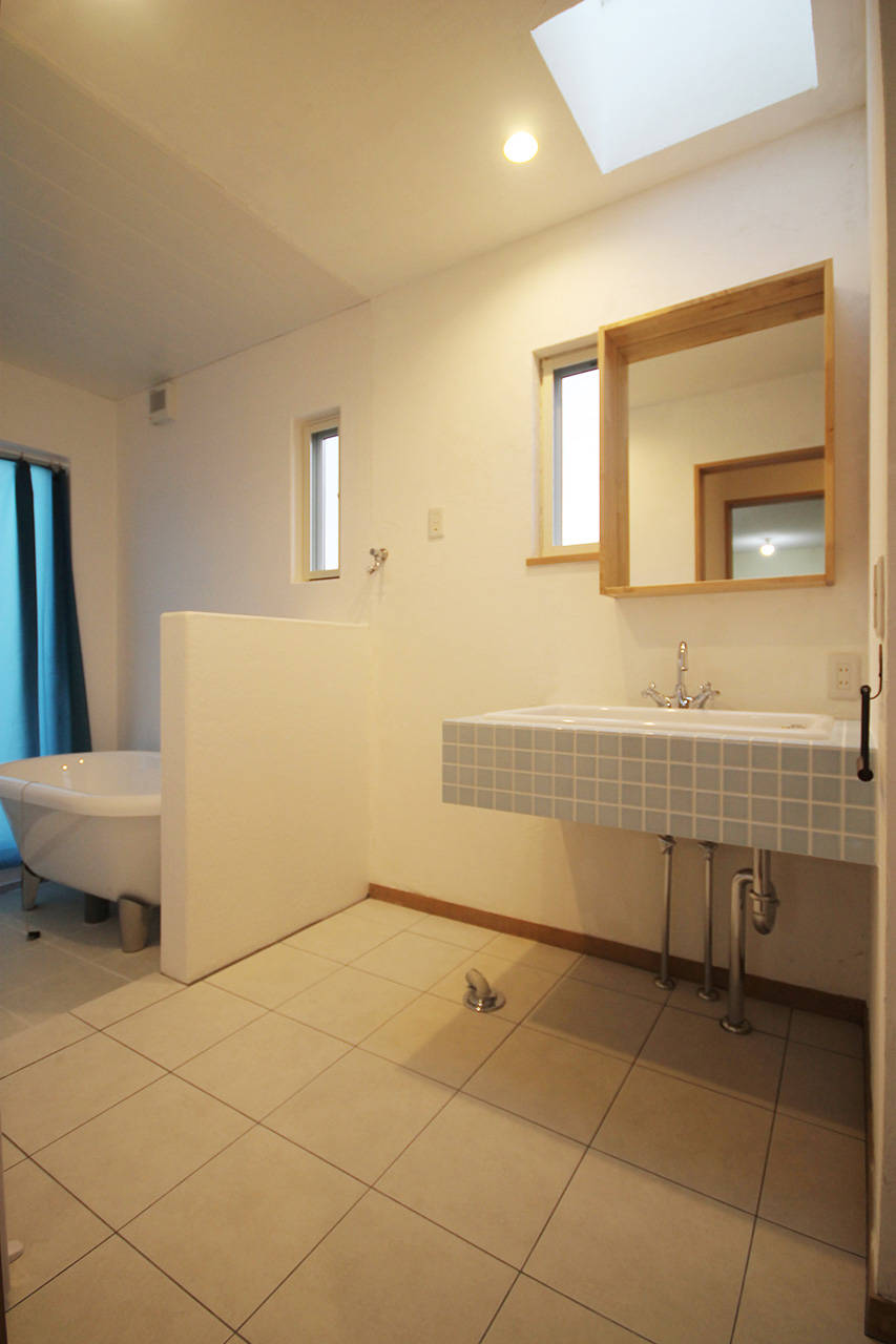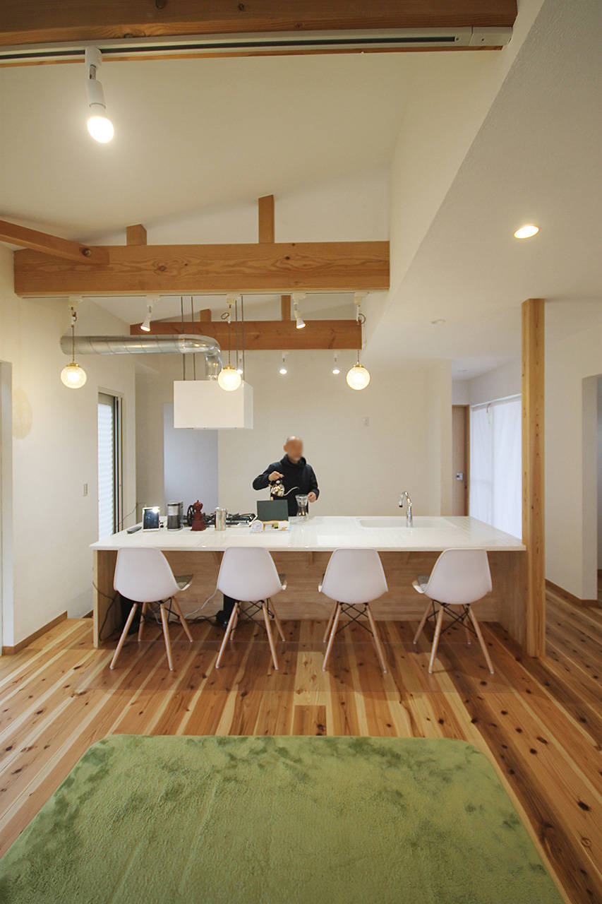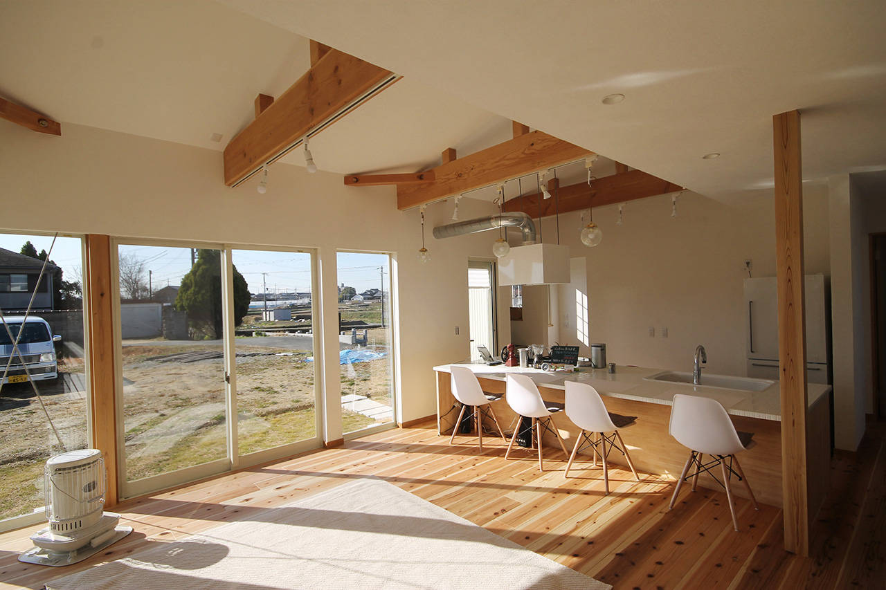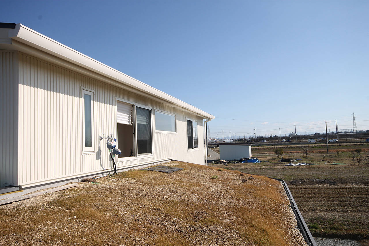 明石市に完成したご夫婦とお母様、お子さんの4人家族のための家。開放的なリビングは屋根付きのデッキとつながっている。その先にははなれご主人の趣味室がある。浴室も外部に植栽を施し露天風呂風に仕上がる予定。内と外が緩やかにつながり広がりを感じる。屋根は草屋根を採用。周りの風景と溶け込み丘の上に座っているような間隔が楽しい。仕上げはお施主様自ら施工。漆喰やタイルの素材感が空間を優しく彩っている。