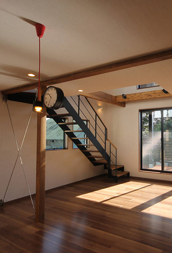 リビングは大きな吹抜から空が見えて開放的。