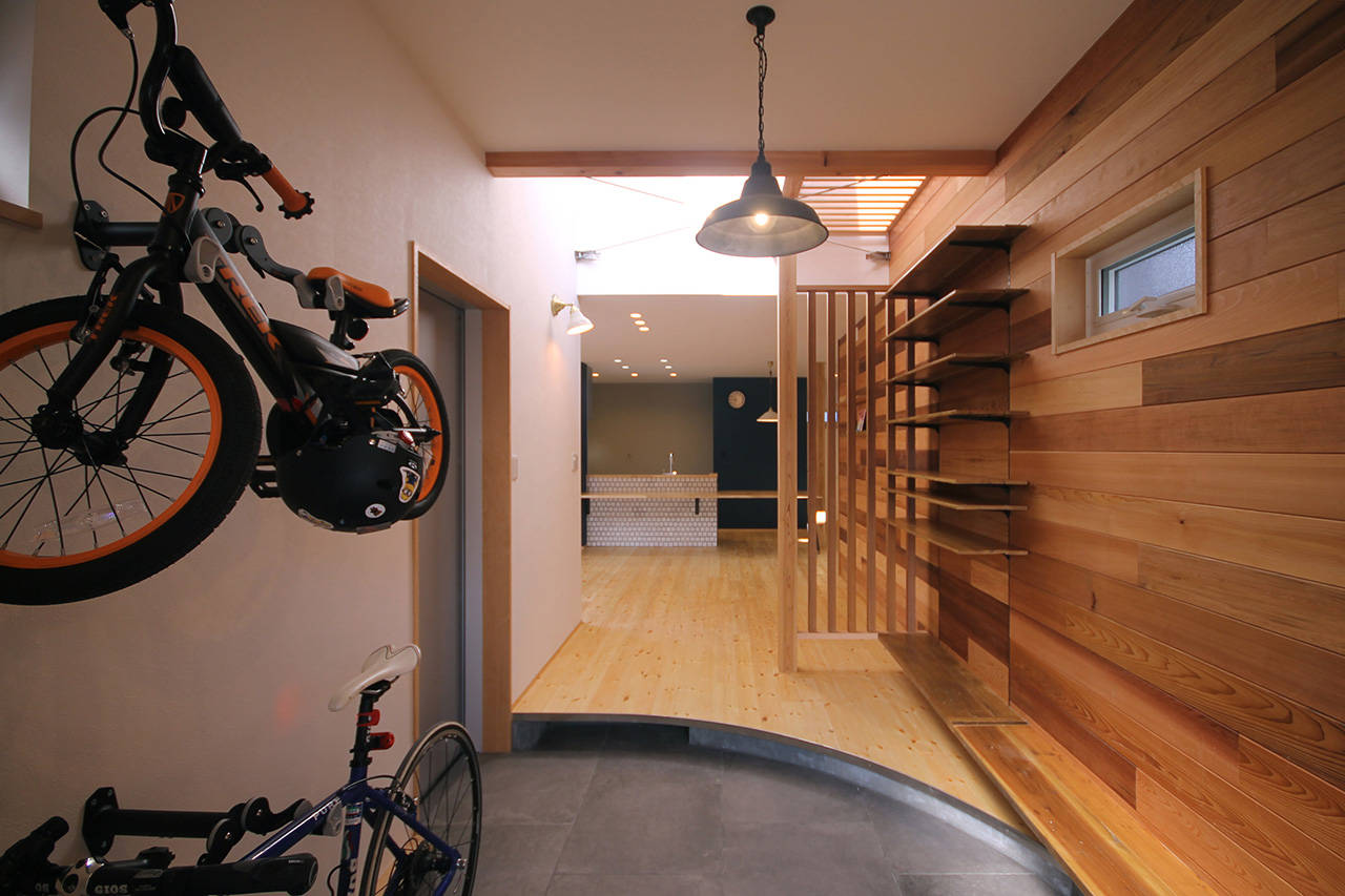 リビングから続く土間には趣味の自転車を置けるスペースを設けている。