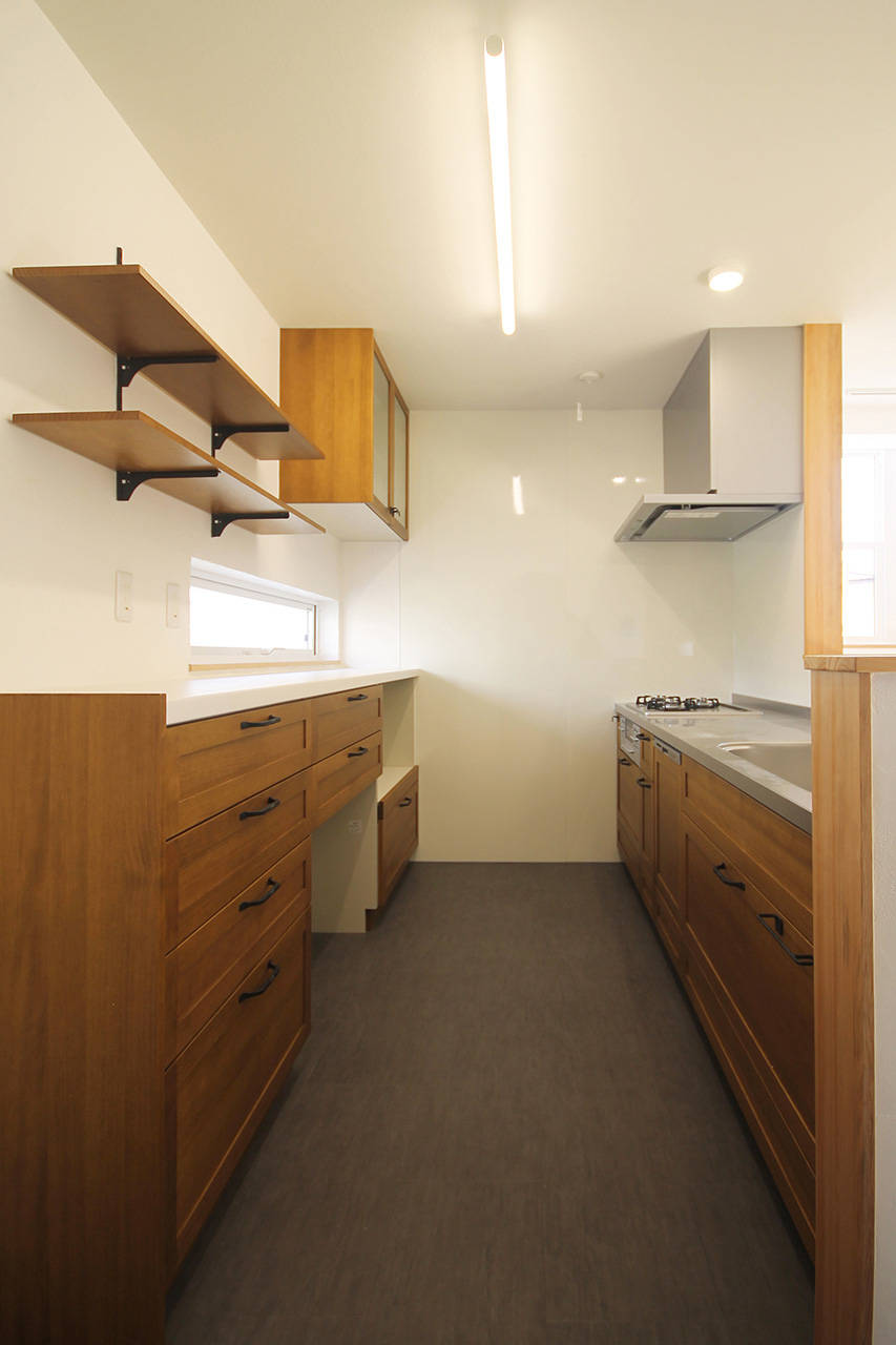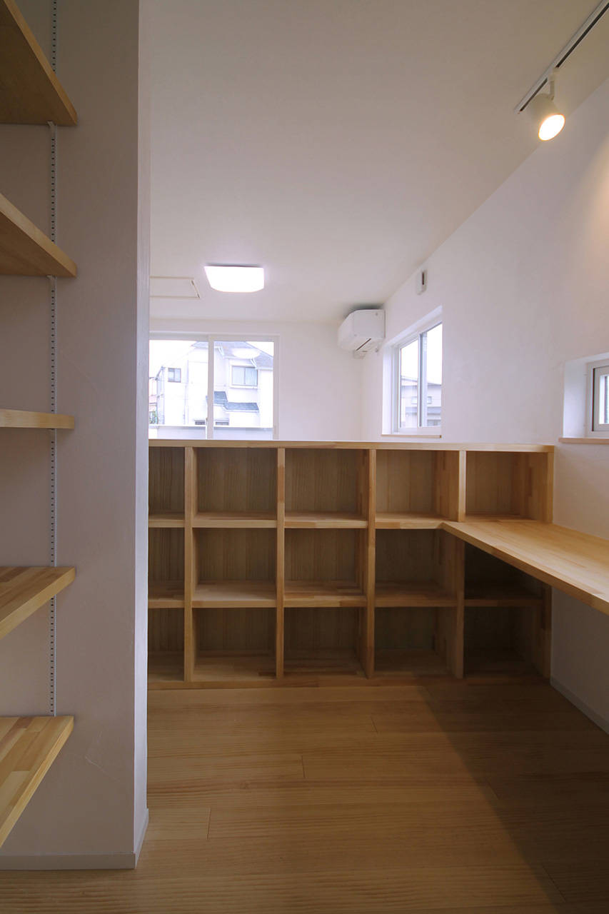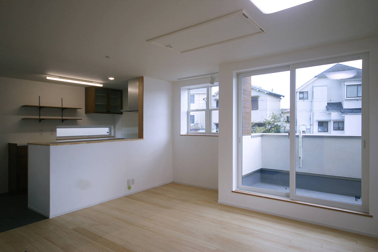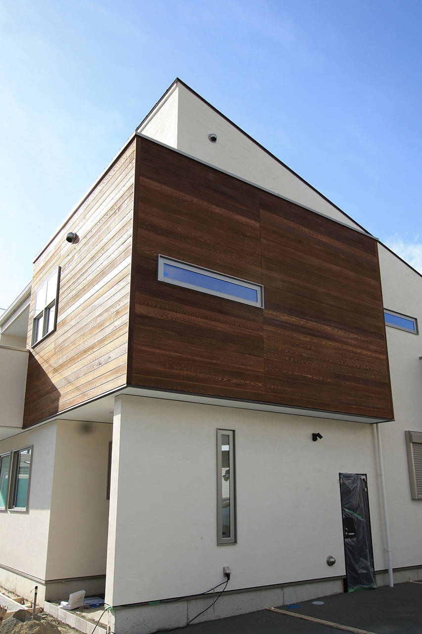 西宮市に完成した家族4人のための住宅。日当たりのいい二階をリビングとし、スタディーコーナーや水廻りを動線良く配置して広々と見渡せる明るい空間とした。外観は漆喰と木とし、シンプルで素材感のある雰囲気となった。