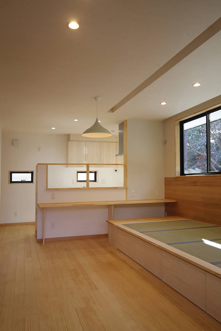 限られた敷地の条件の中、収納を確保しつつゆっくりくつろげるリビングにするため畳の小上がりを設けた。