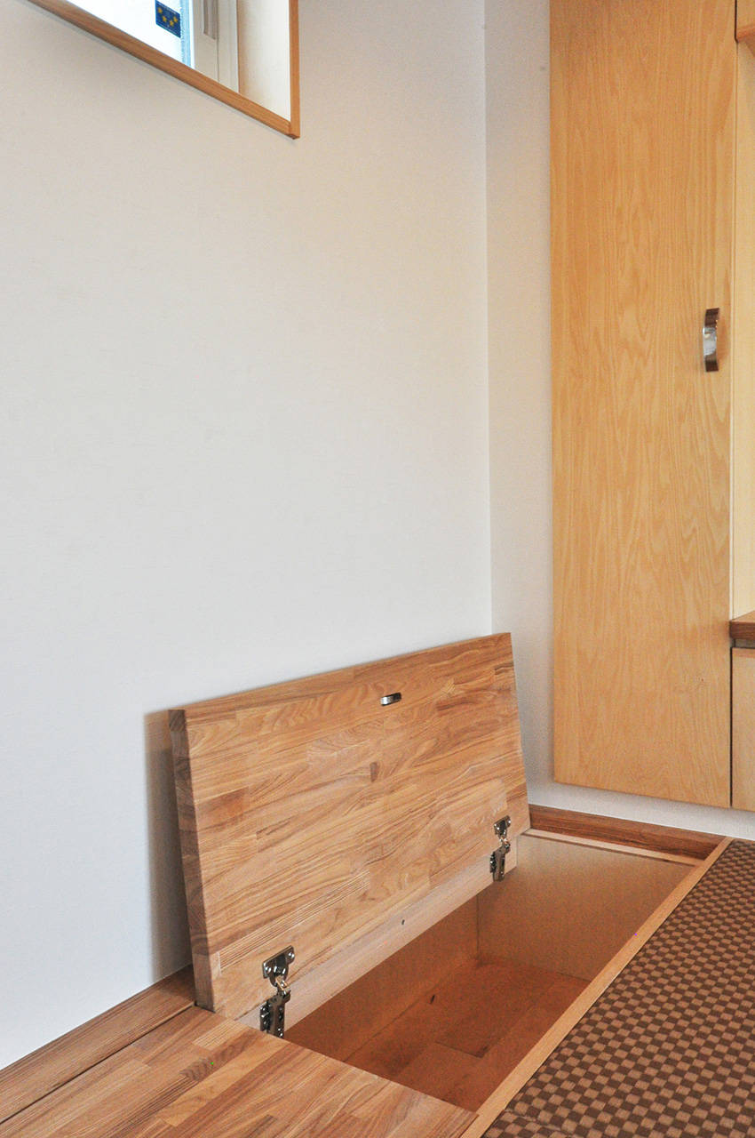 圧迫感のない階段や、小上がり部分の物入れ、三角に切り取られた扉など狭小地ならではの工夫やデザインがたくさんつまった家。