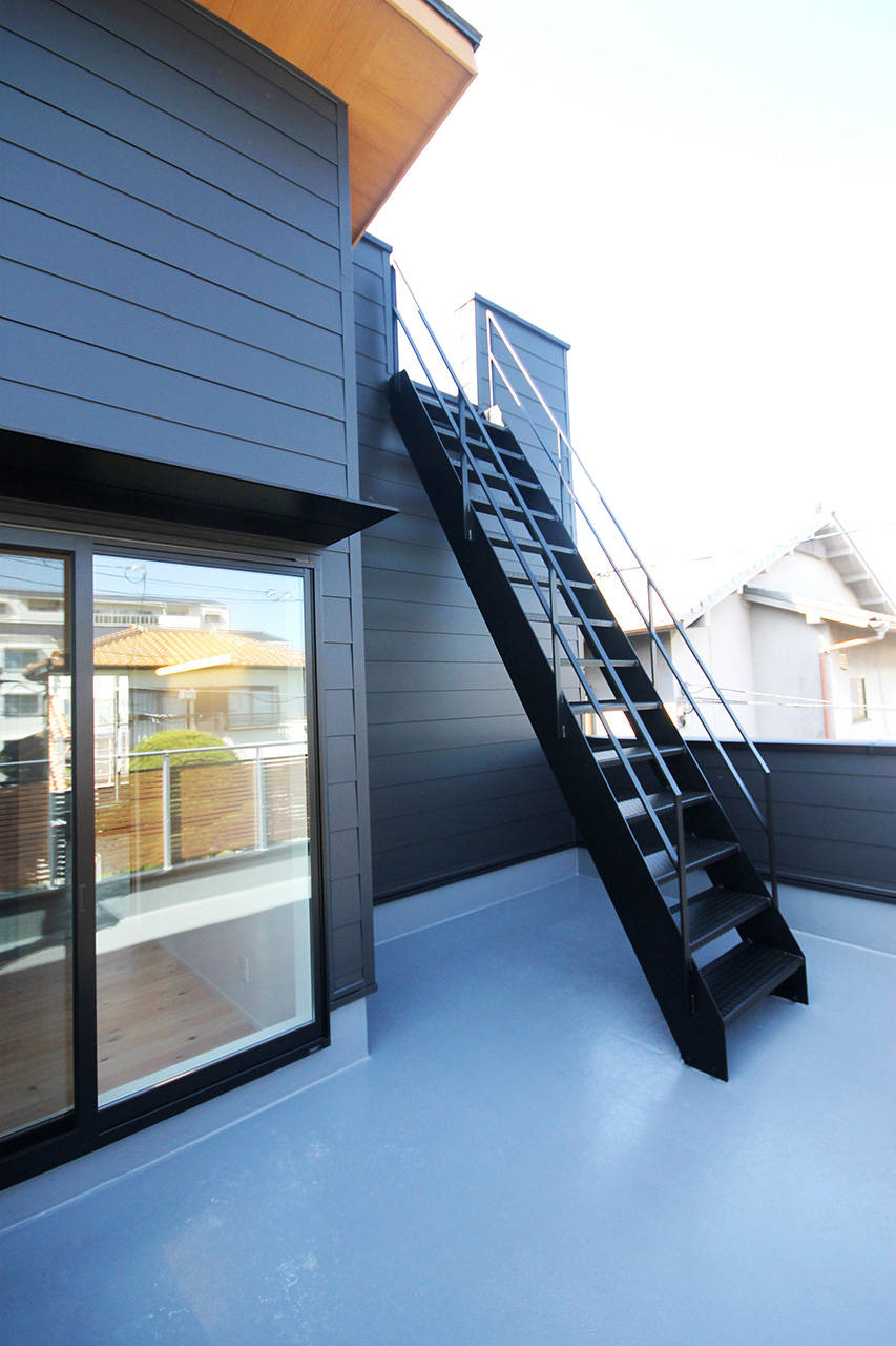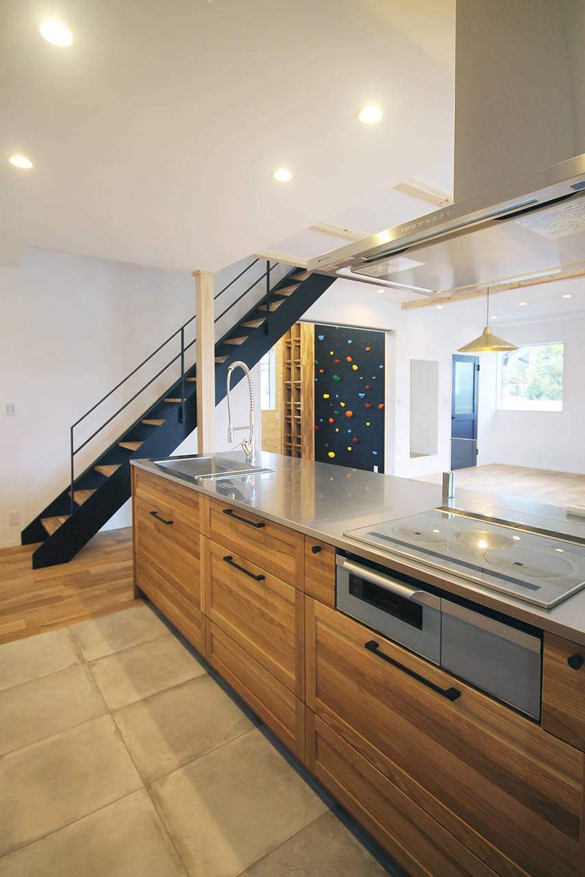 ご主人のご趣味やトレーニングが思う存分室内でできるように、壁にはロッククライミング、天井にはうんていを設置した。ロフト収納に上るカラフルなスチールはしごや花火を楽しめる屋上バルコニーなど楽しい仕掛けがいっぱいの家。