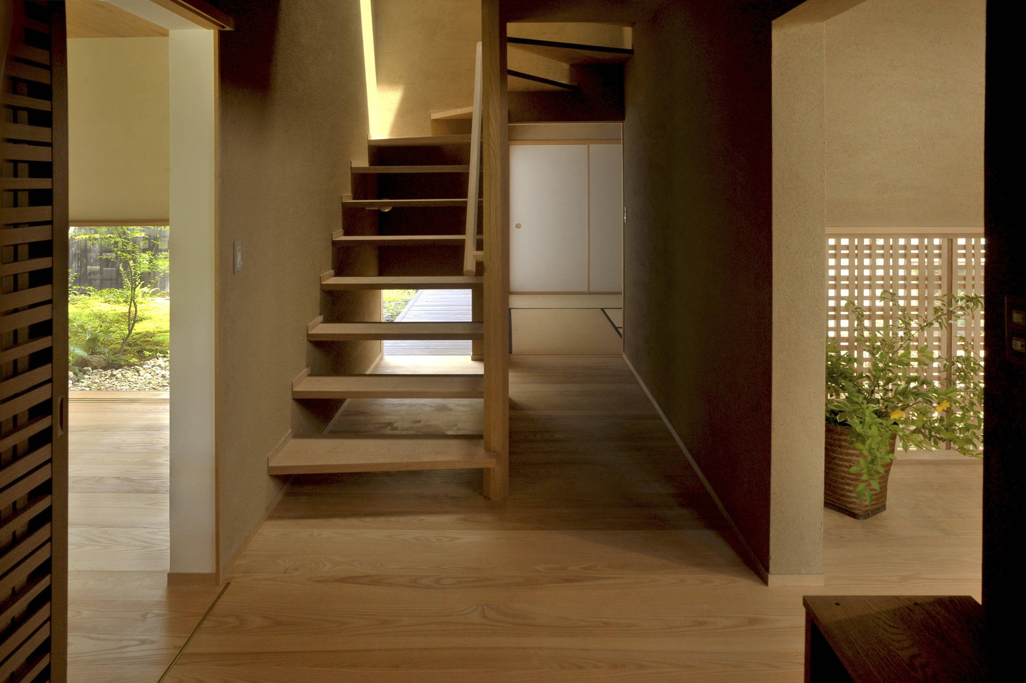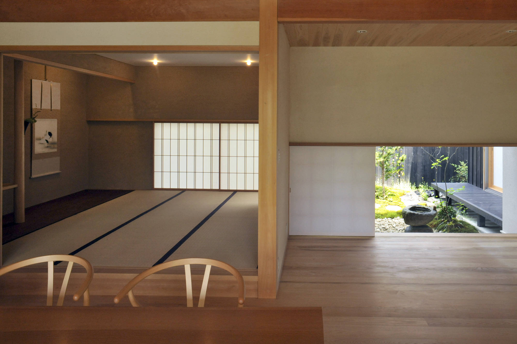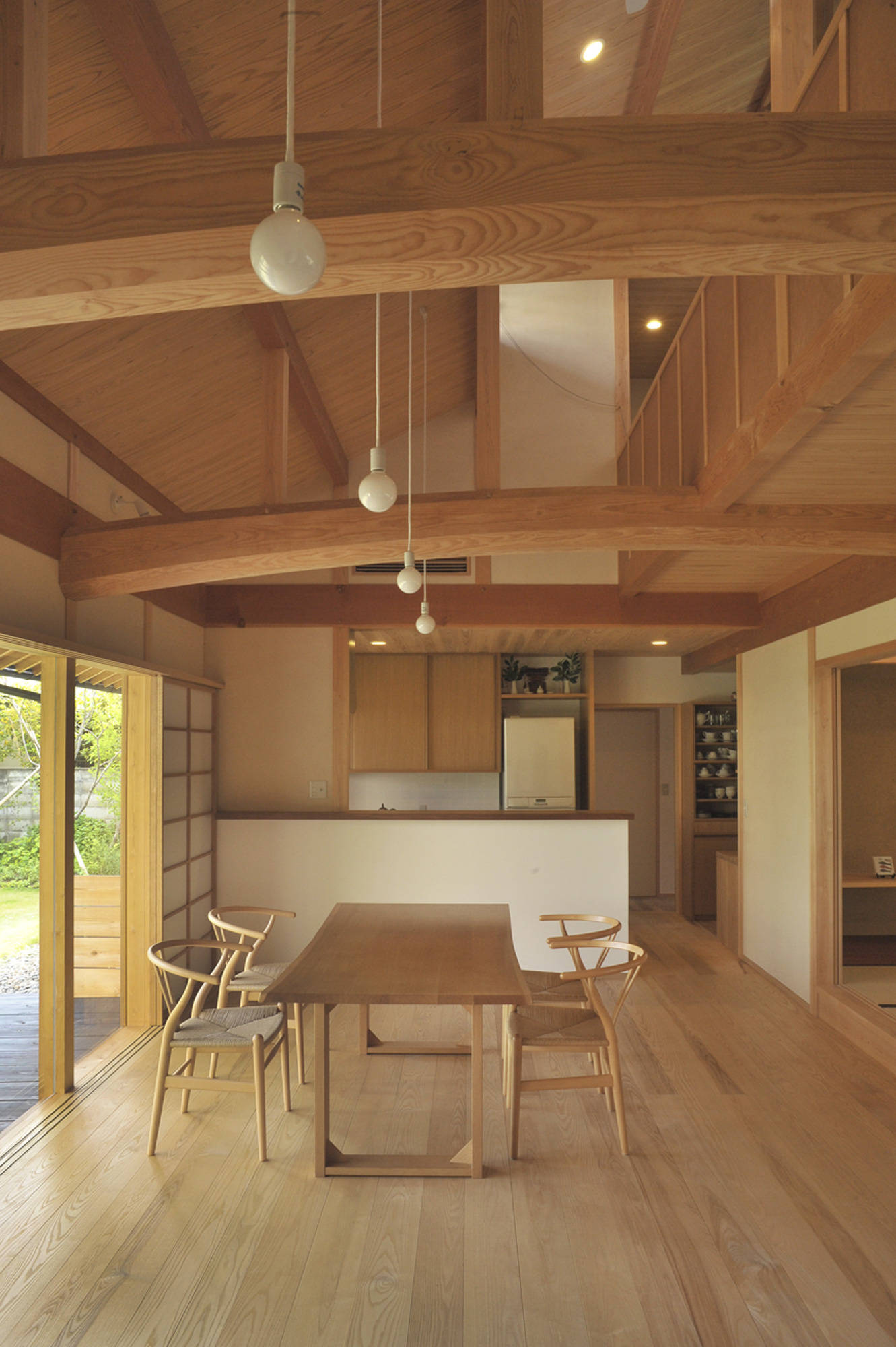 リビング、ダイニングの吹抜けには双子のような地松のタイコ落としをした梁が掛かり、南と北に庭を設け、瀬戸内の光と風が通り抜ける。