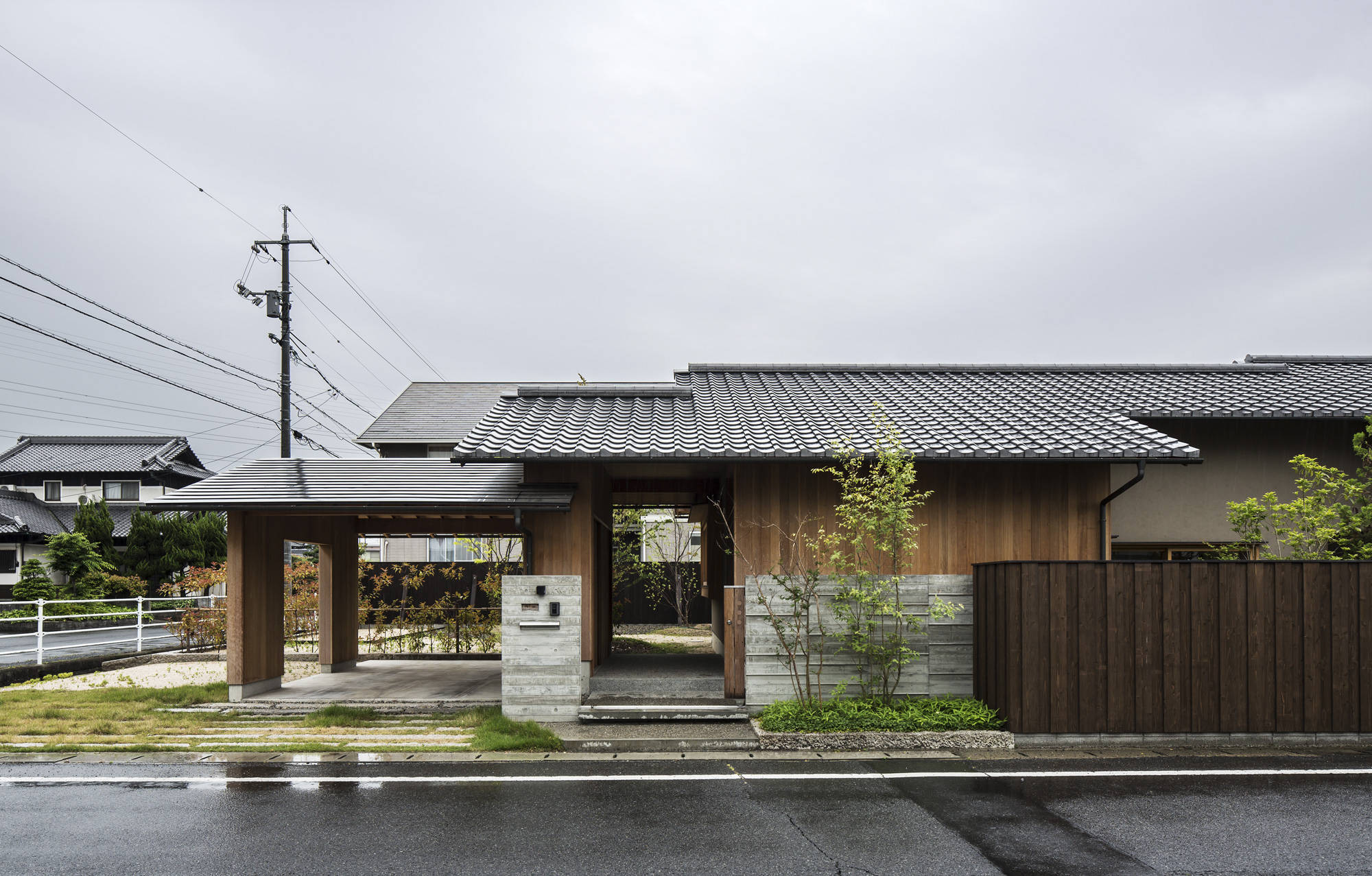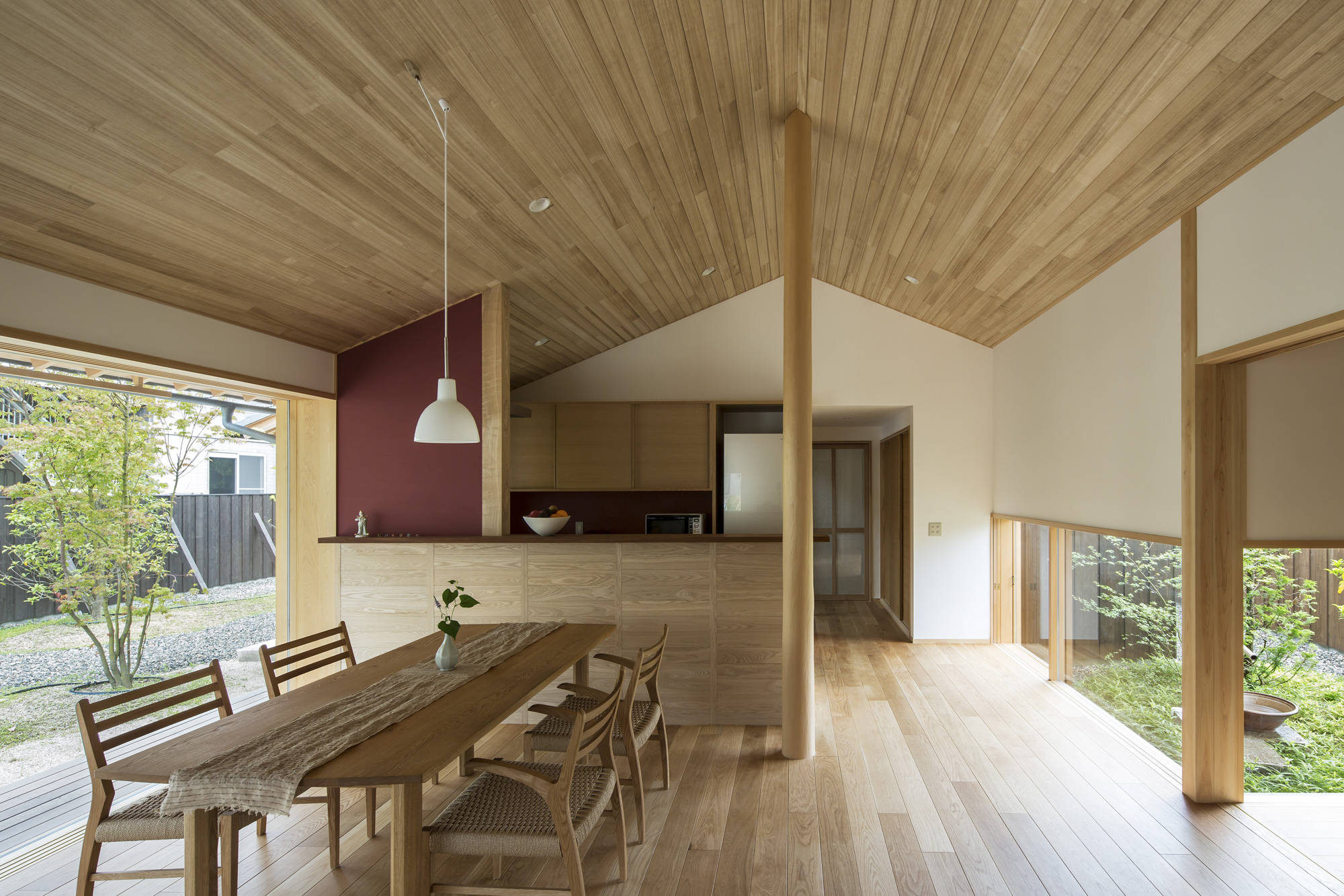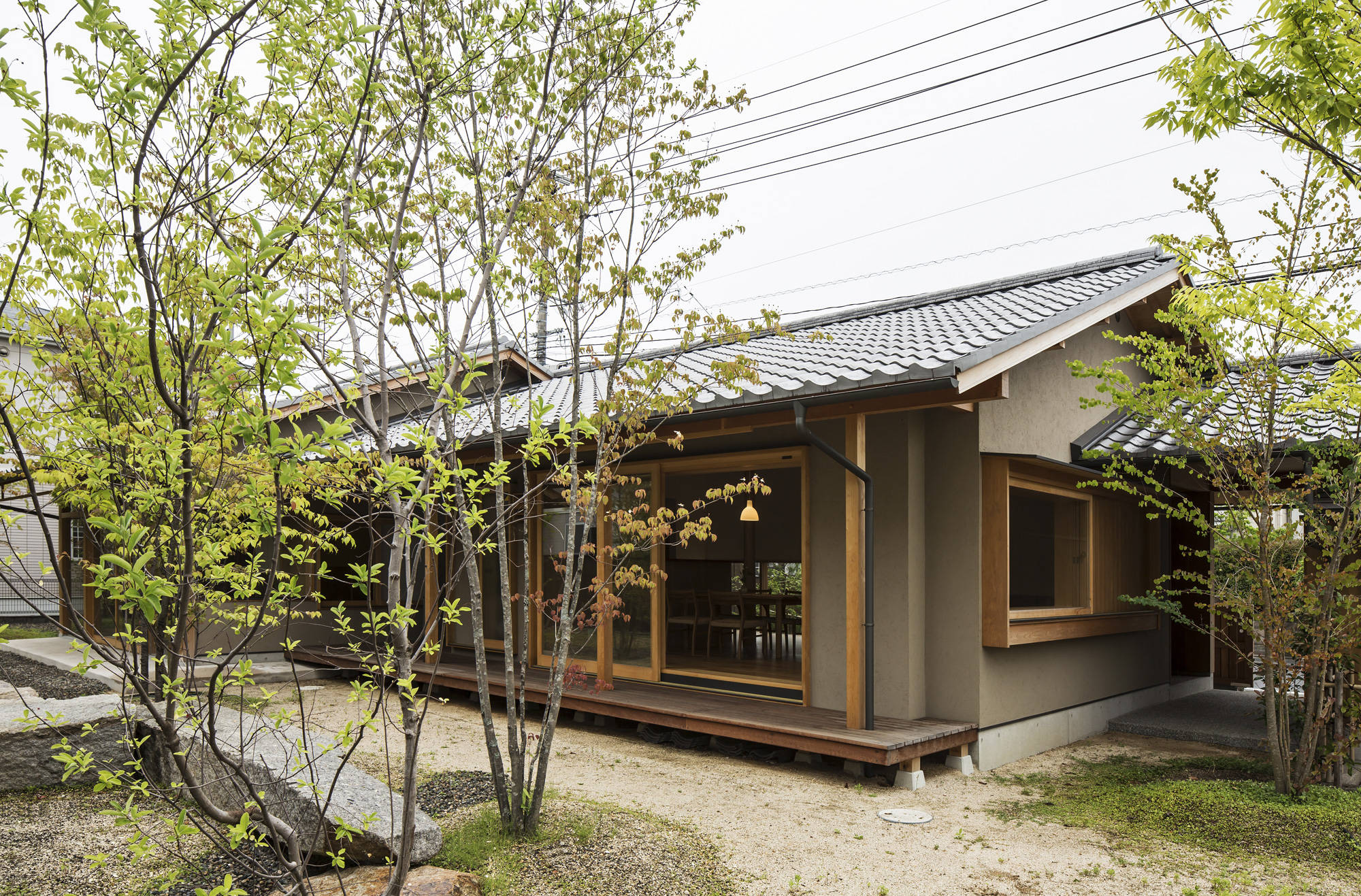 雁行型の平面。5棟の瓦屋根がリズミカルに重なる構成。リビングには日本建築の特徴のひとつである中間領域となるデッキ、和室には土縁を設けている。リビングの天井のキリ板の貼り方に特徴がある。