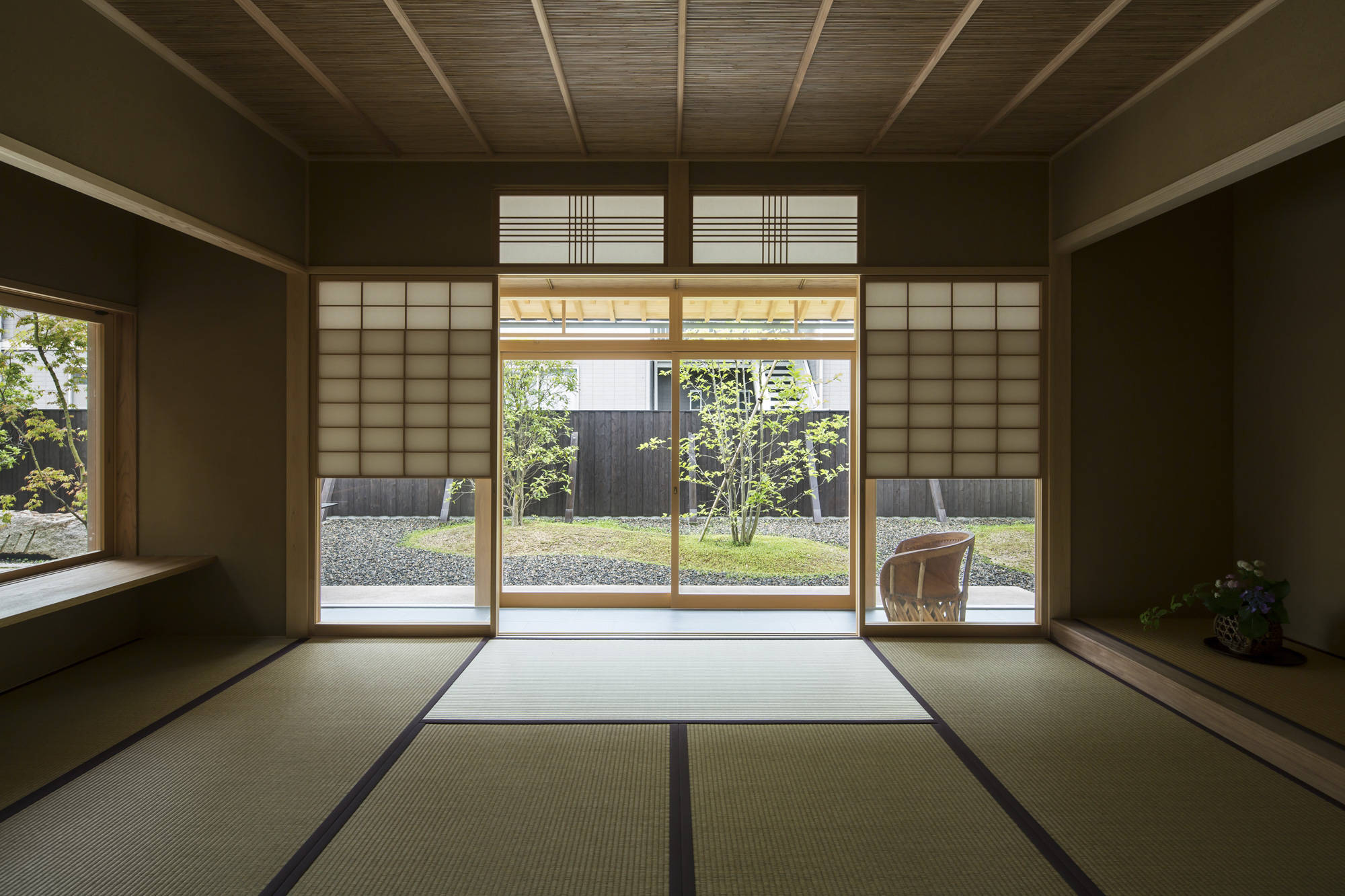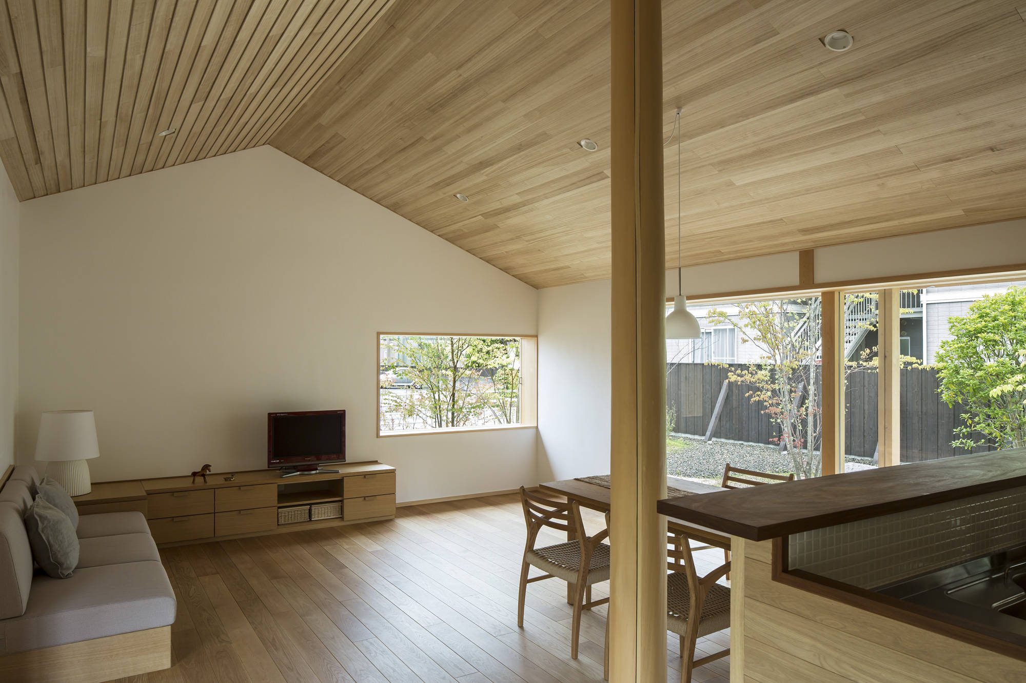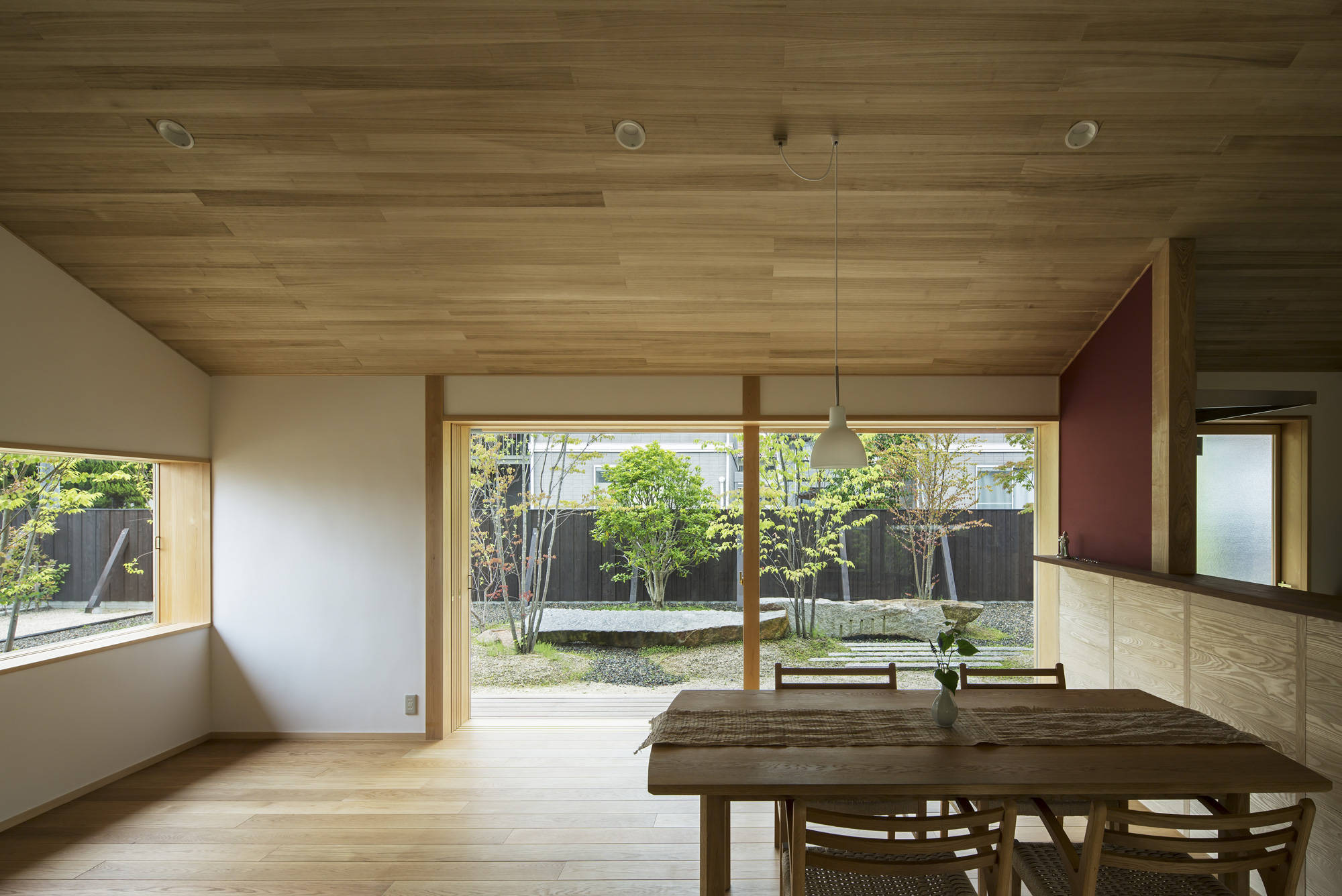 雁行型の平面。5棟の瓦屋根がリズミカルに重なる構成。リビングには日本建築の特徴のひとつである中間領域となるデッキ、和室には土縁を設けている。リビングの天井のキリ板の貼り方に特徴がある。