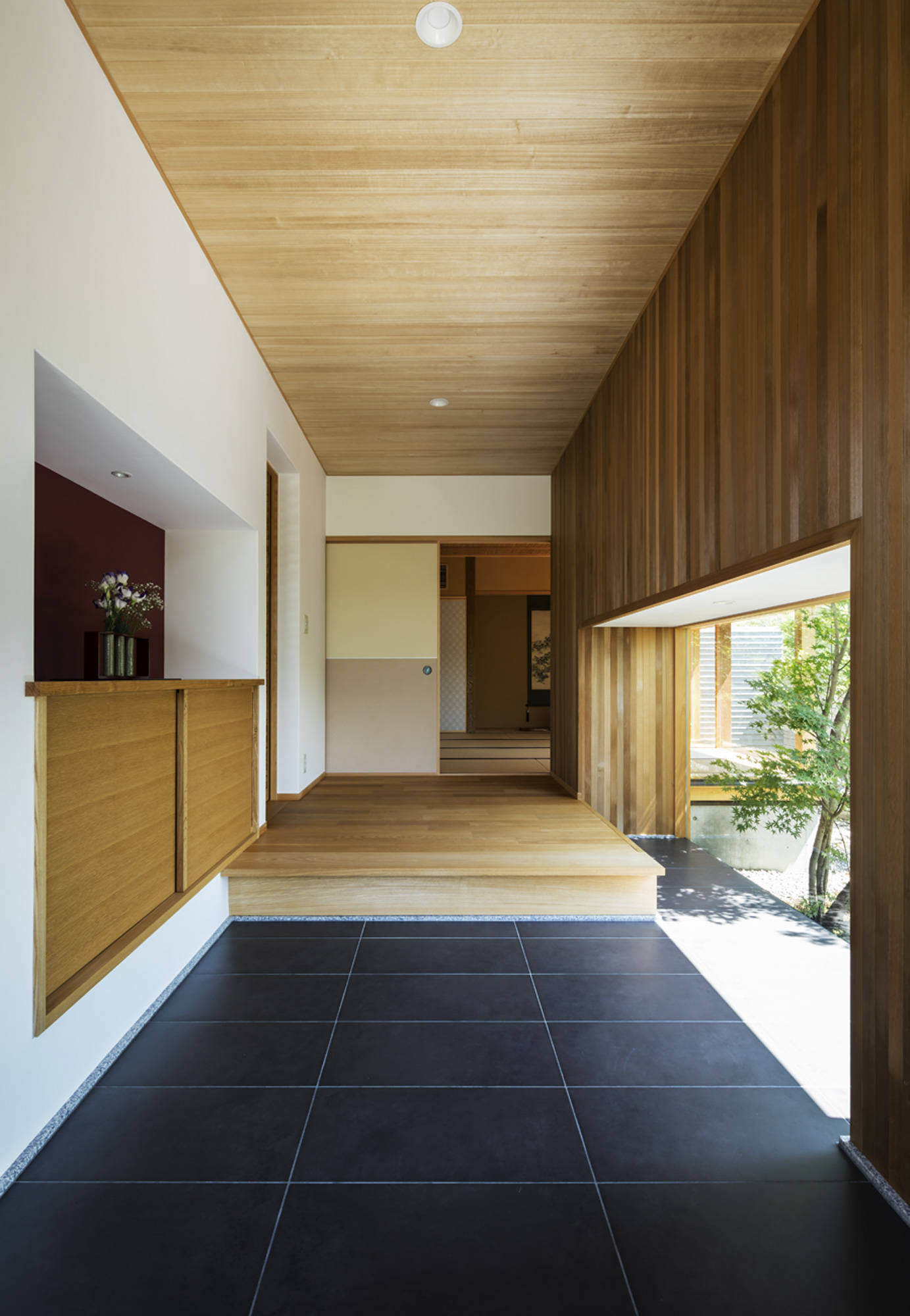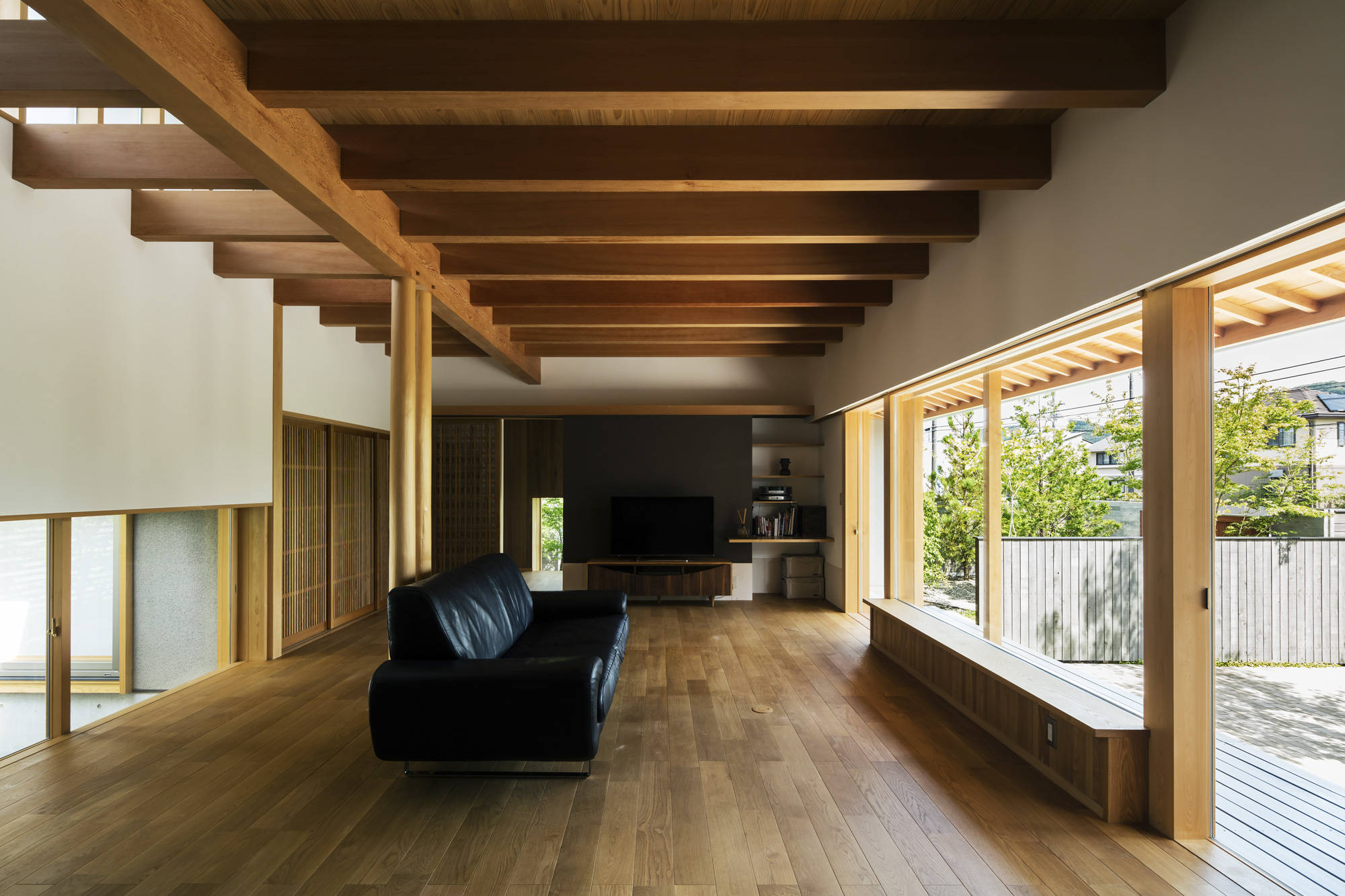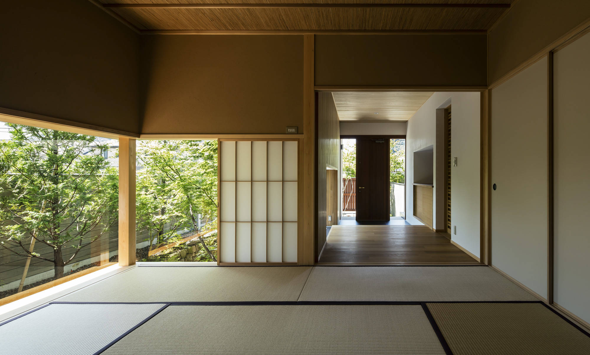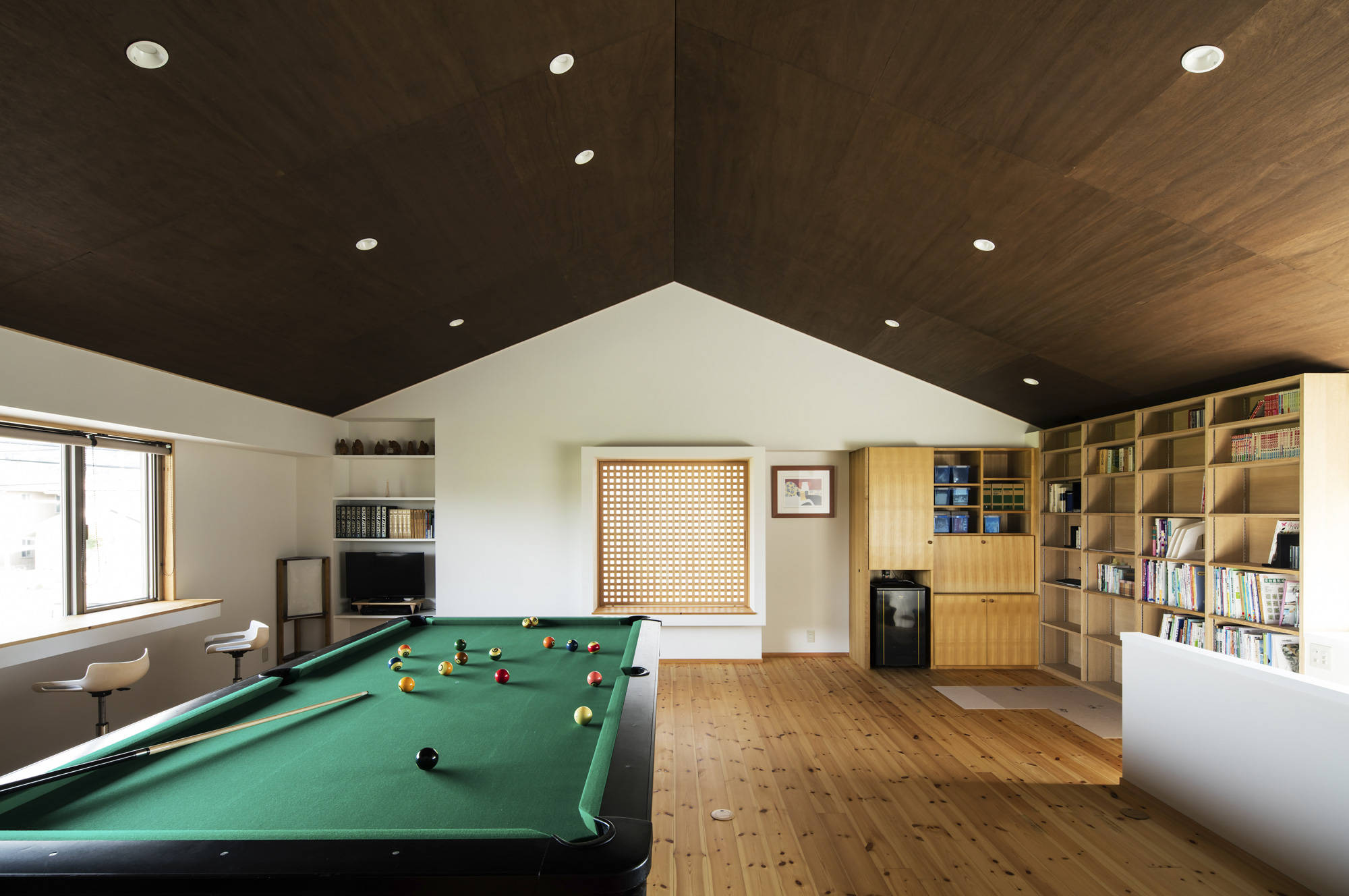 現代ではめずらしい二間続きの和室がある住まい。部屋のふるまいに合わせて窓の位置や大きさを決め、南庭、本庭、北庭を配している。プレイルームではビリヤードや卓球が楽しめる。