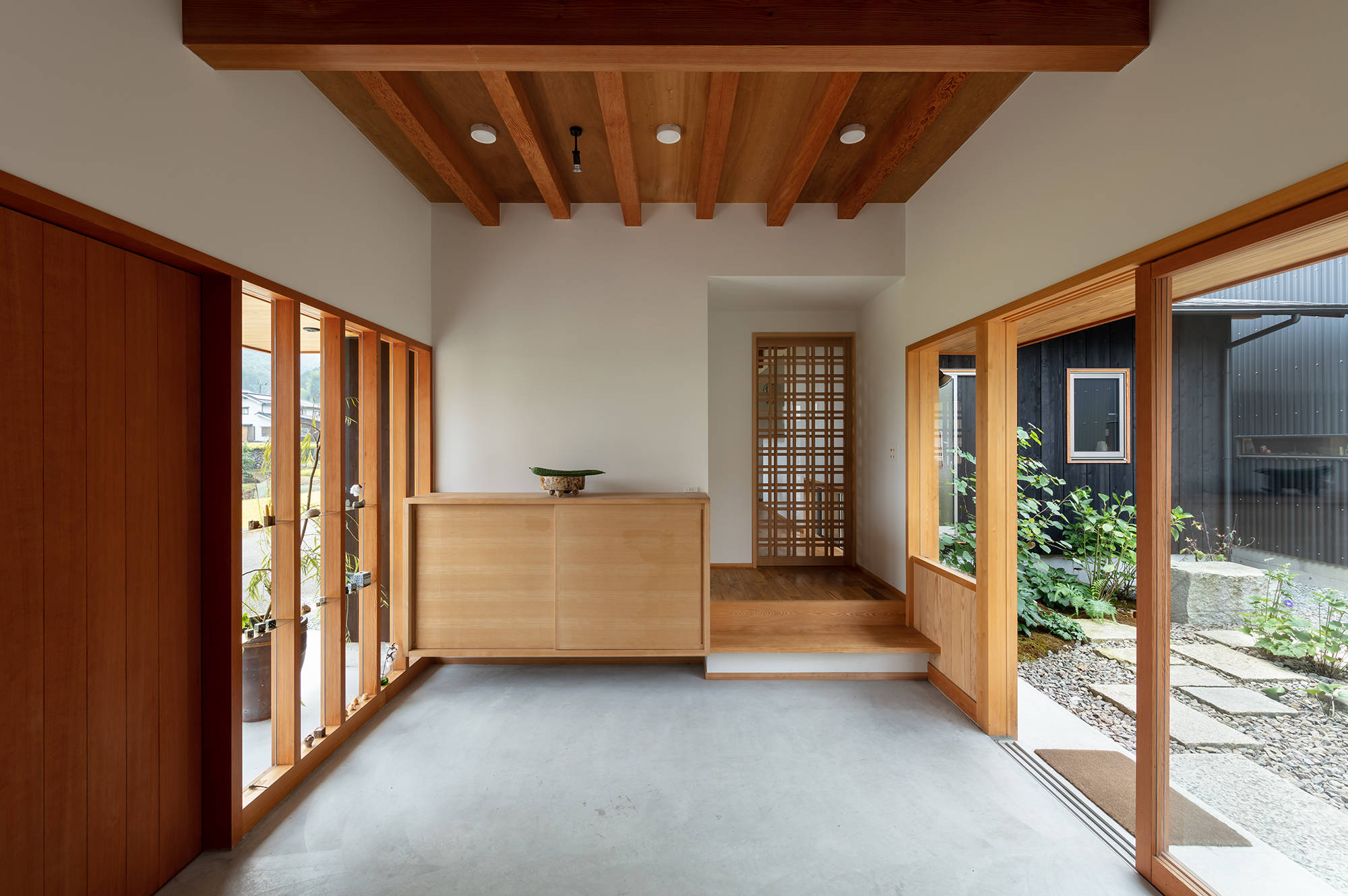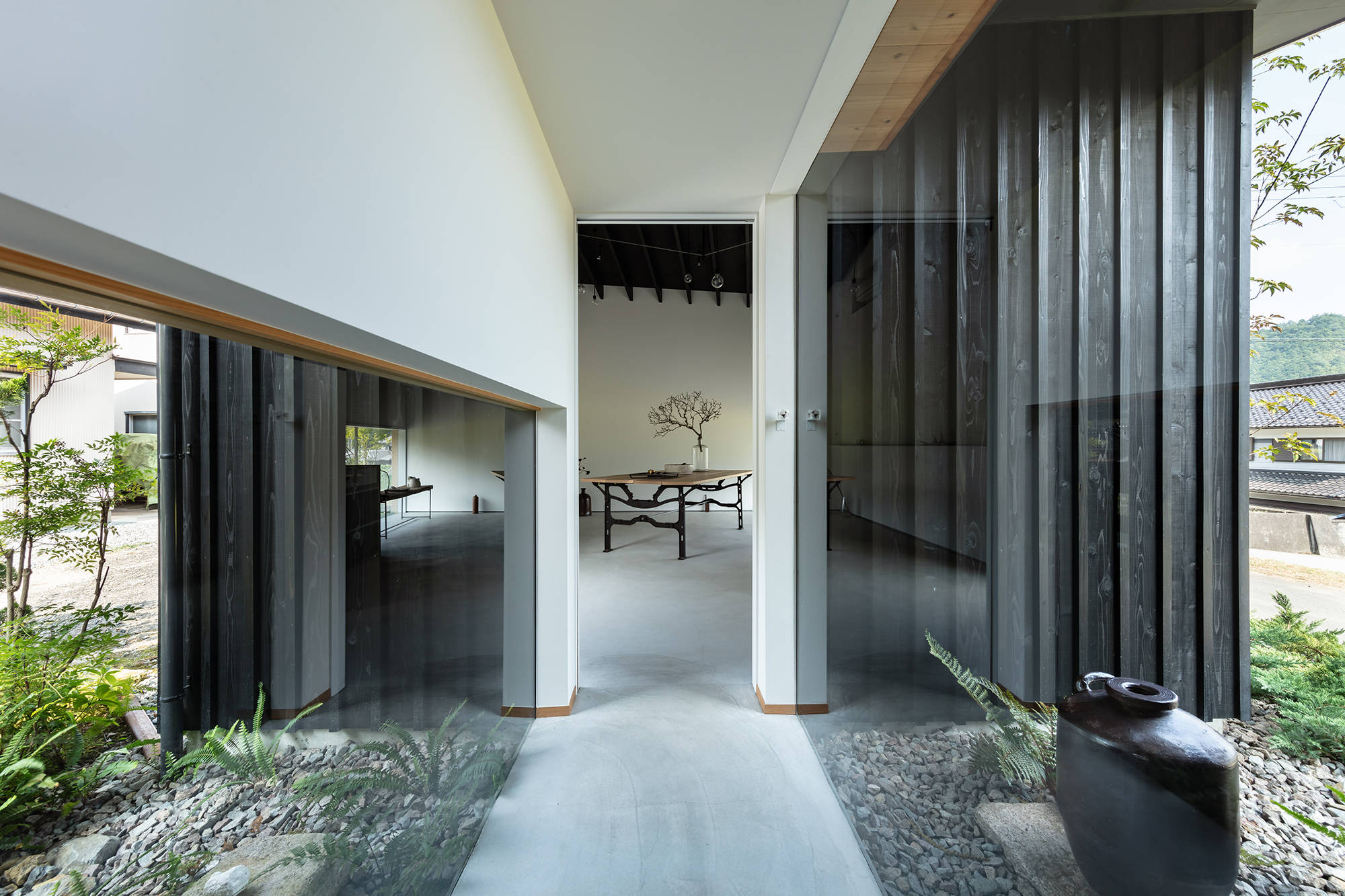 計画は、かつての農家の土間のような玄関土間を中心に住宅・ギャラリー・中庭・工房へとつながる構成。