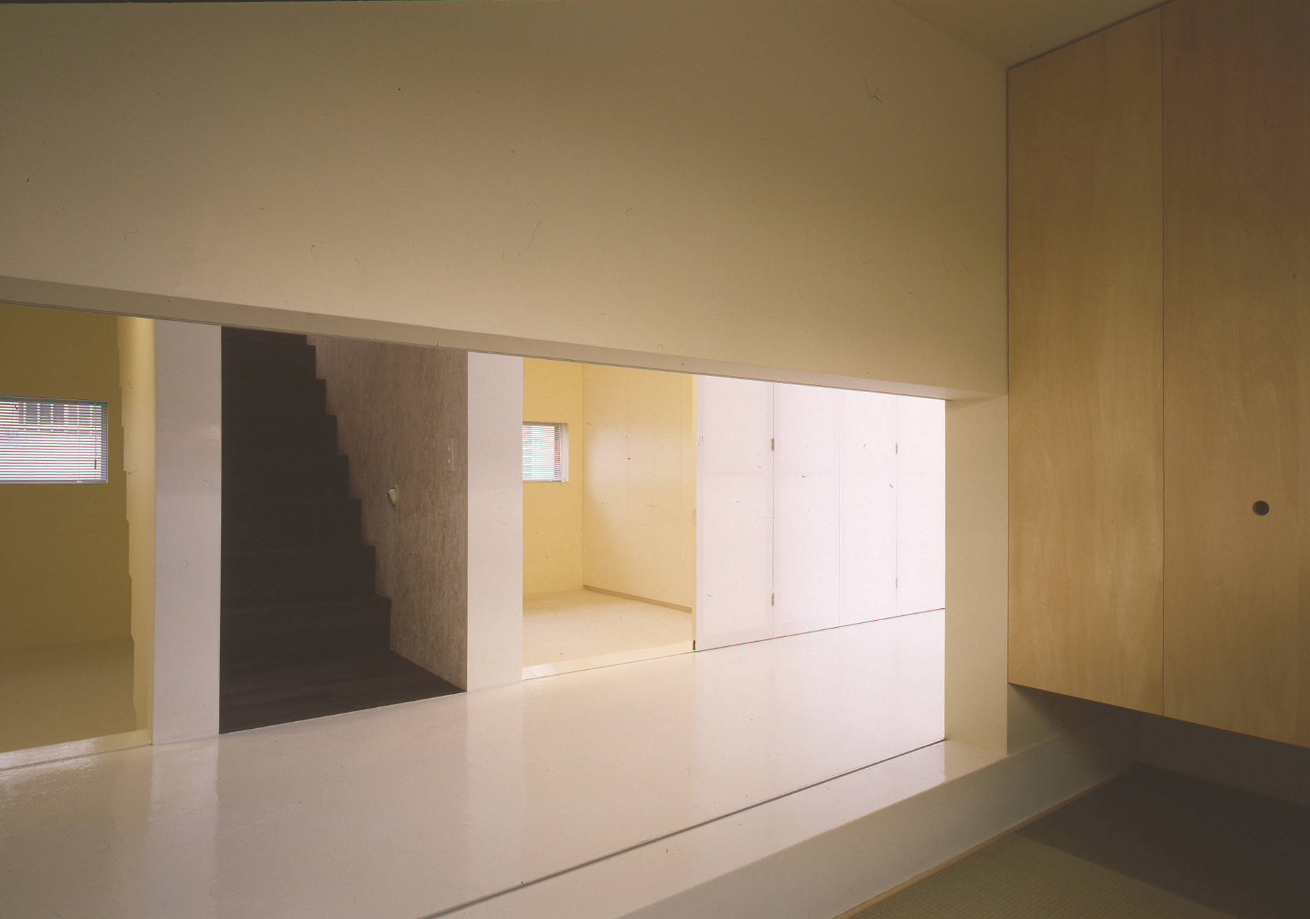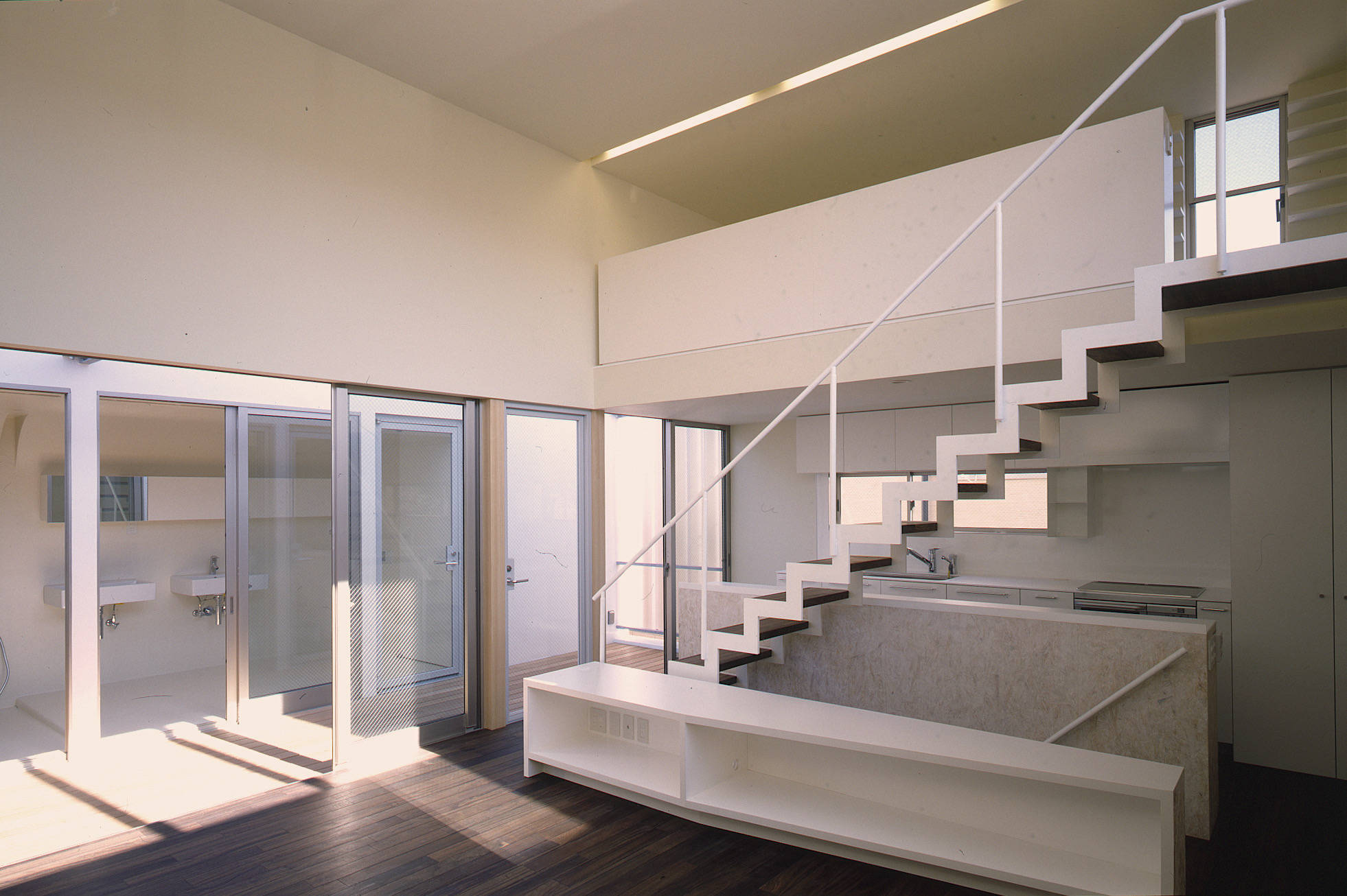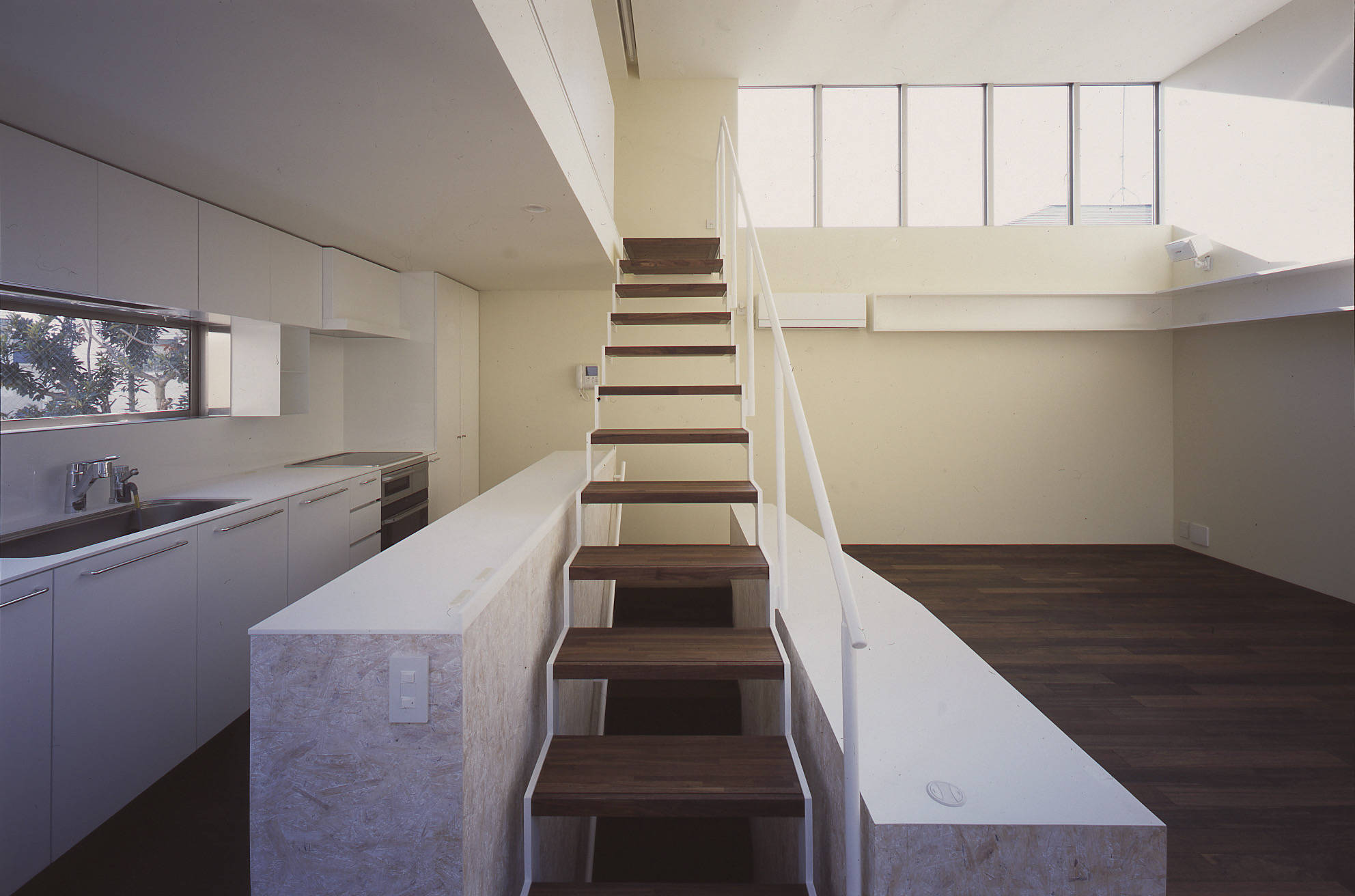 キッチンの上にはロフトを用意し、その重なった分が天井の高いリビングとなっています。天井の近くの南側の壁にハイサイドライトを設け、光がリビング全体を明るく開放的になるように計画しています。