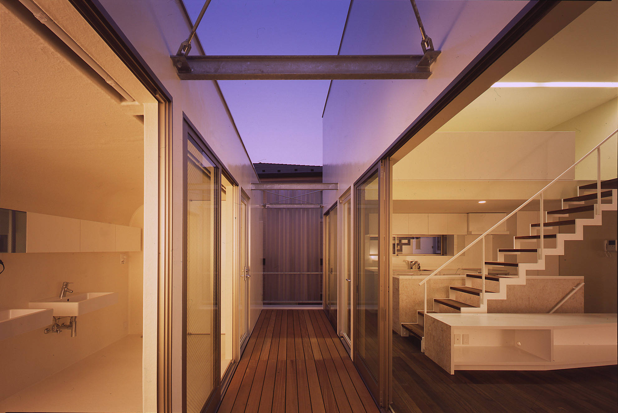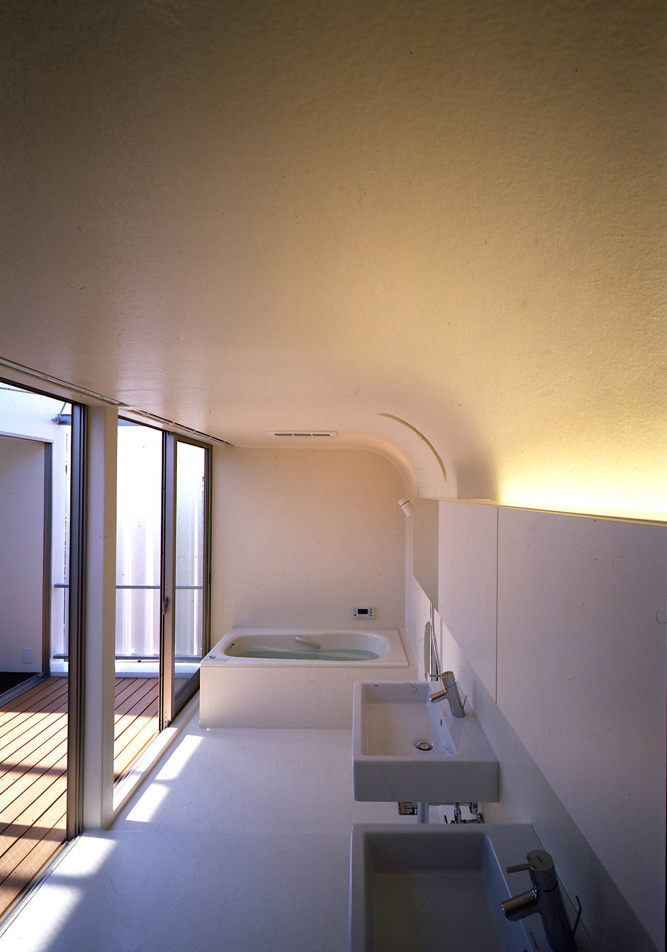 リビングの前には、デッキテラスを設けました。そして、デッキテラスを挟んで離れの開放的な水周りがあります。水周りは道路に背を向け、水周りとリビングのプライバシーを外から守ります。