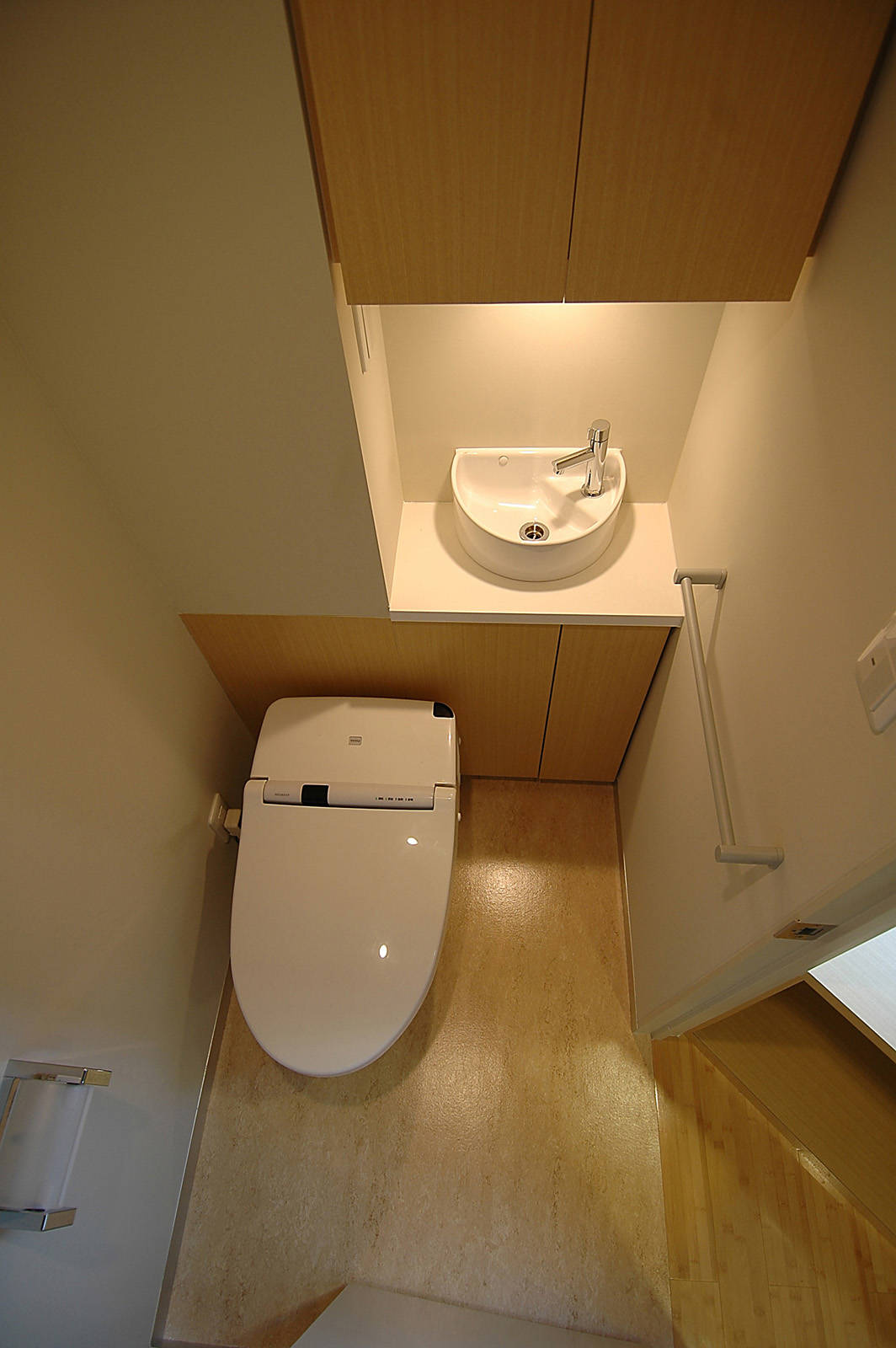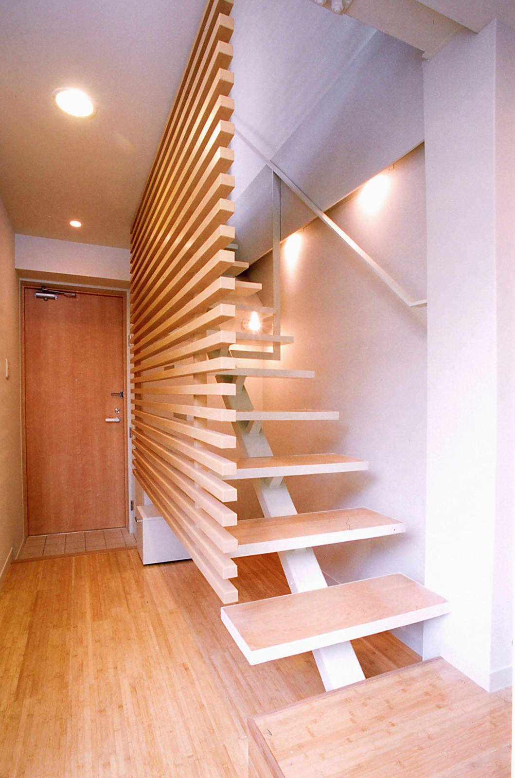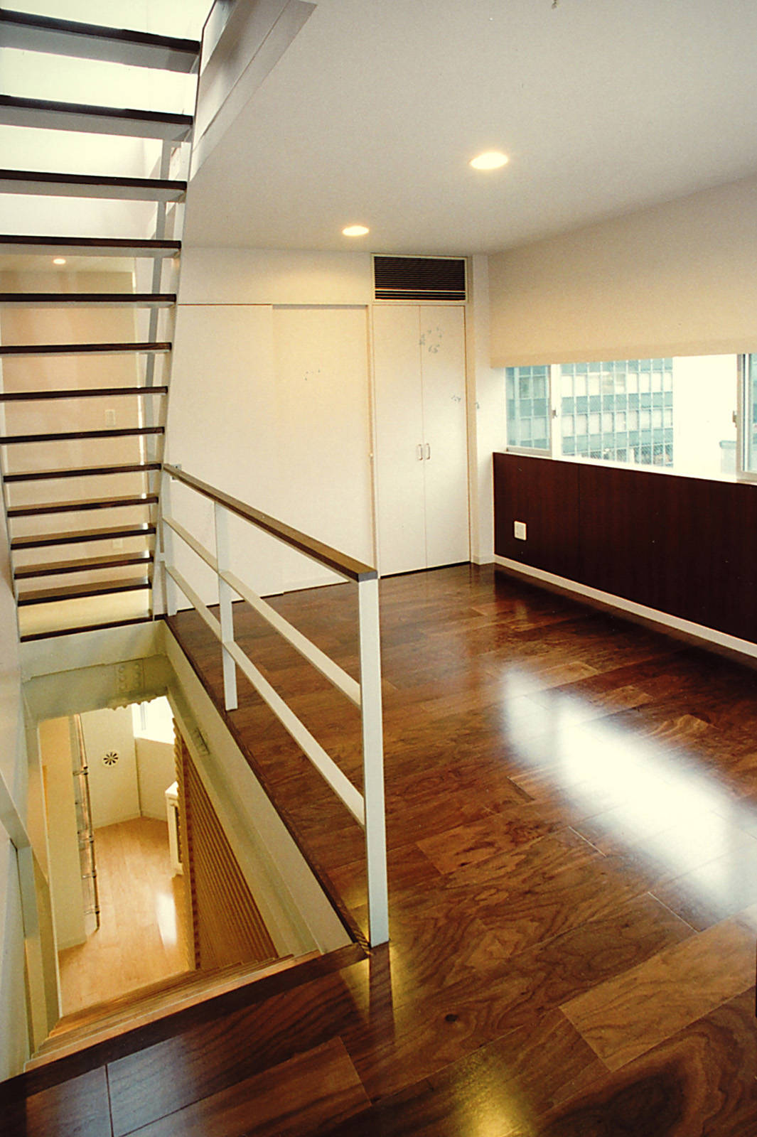 タテに8歩ヨコ4歩。限られた敷地を活かして住宅を建てたい、 というお話を受けて6 階建ての4 階から屋上までの3 層を住居(下は賃貸)とした。豊かな暮らしには採光や通風の確保だけではなく「楽しさや期待感が膨らむ空間」とすることが重要。木のルーバースクリーンが眺めを適度に遮断し、上階への期待感を高めている。一部を閉ざすことで逆に広さを感じる効果により、狭小ハンディを感じさせない快適な空間を実現した。