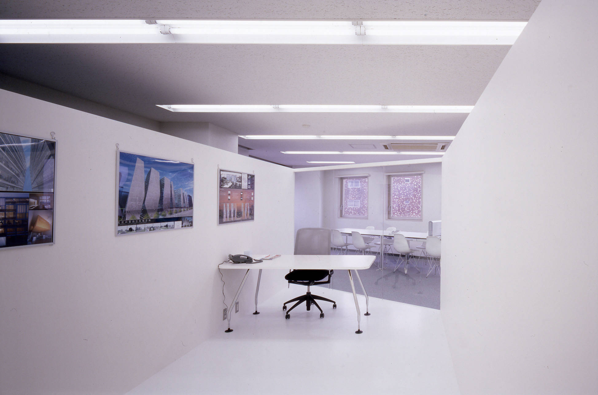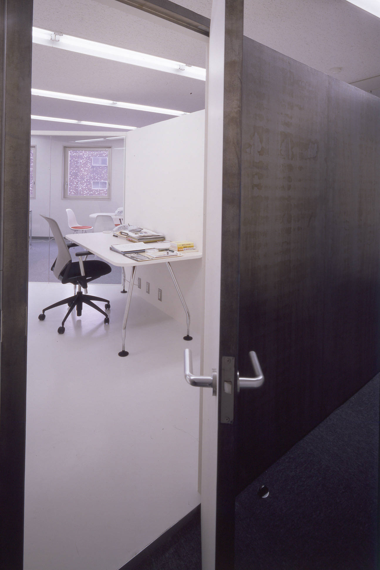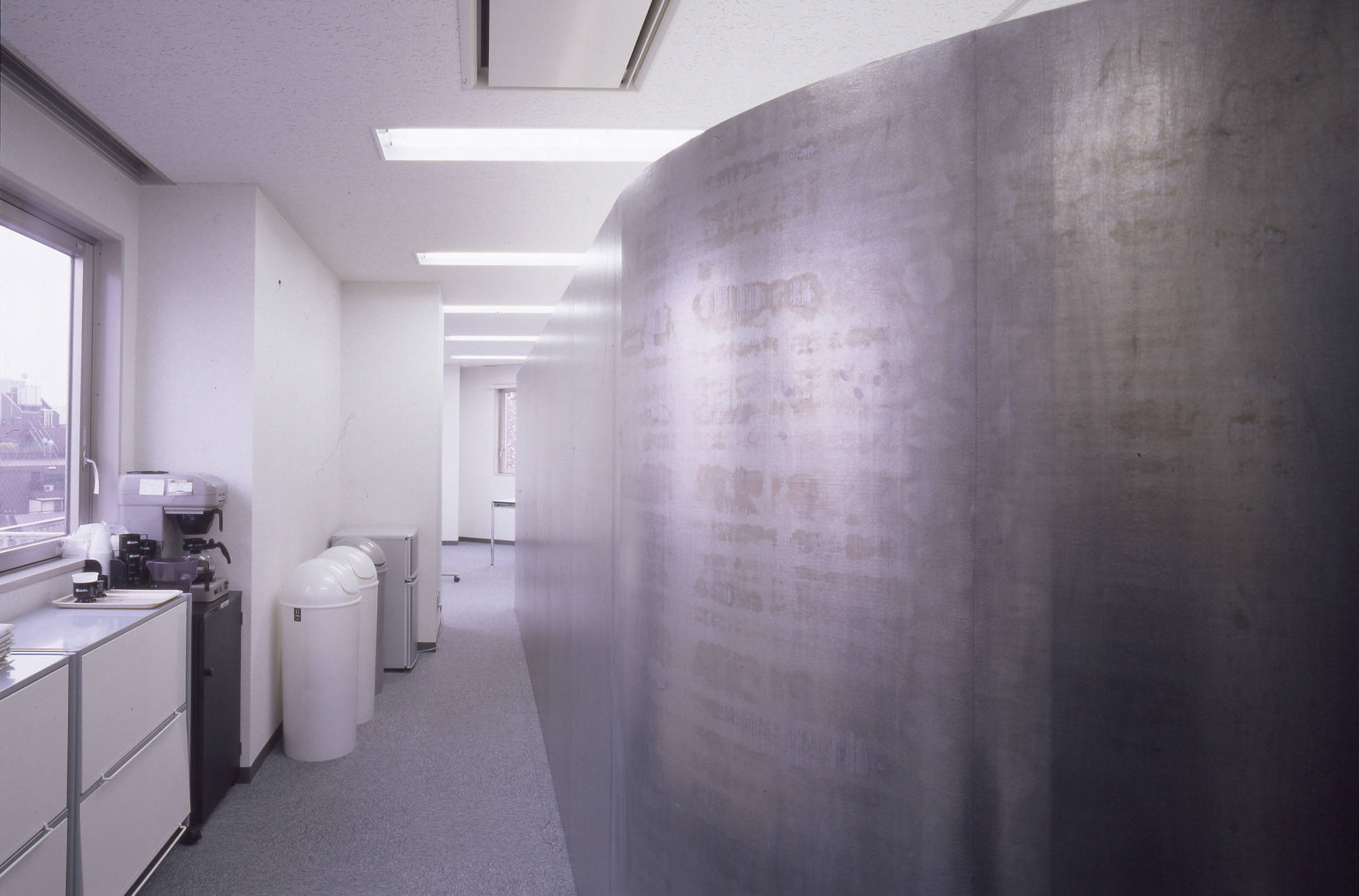 白い箱の中で、鉛の鈍い金属の塊がオープンスペースと裏動線を連続的に分け、その質感はオフィス空間に適度な刺激と存在感(シンボリズム)を与えます。それがこの会社の社会的立場と考えました。