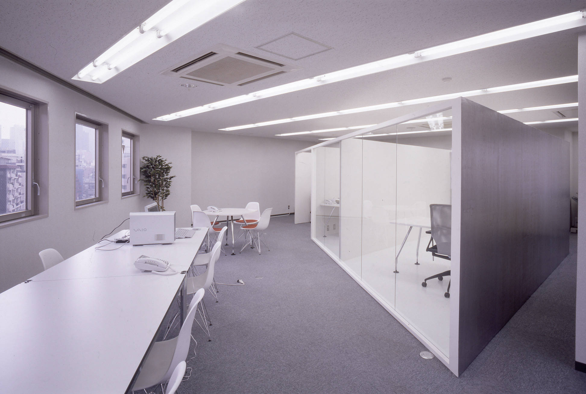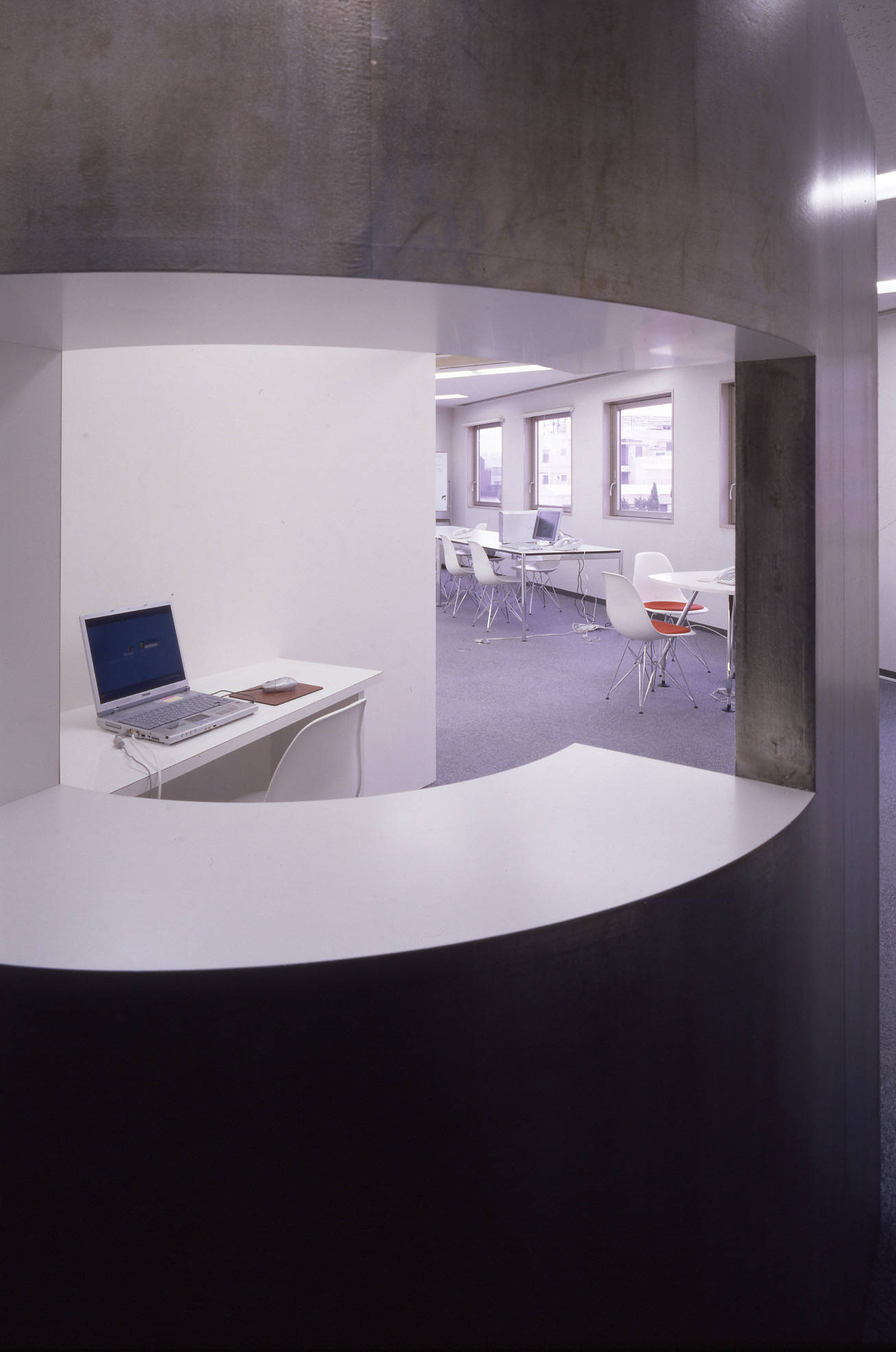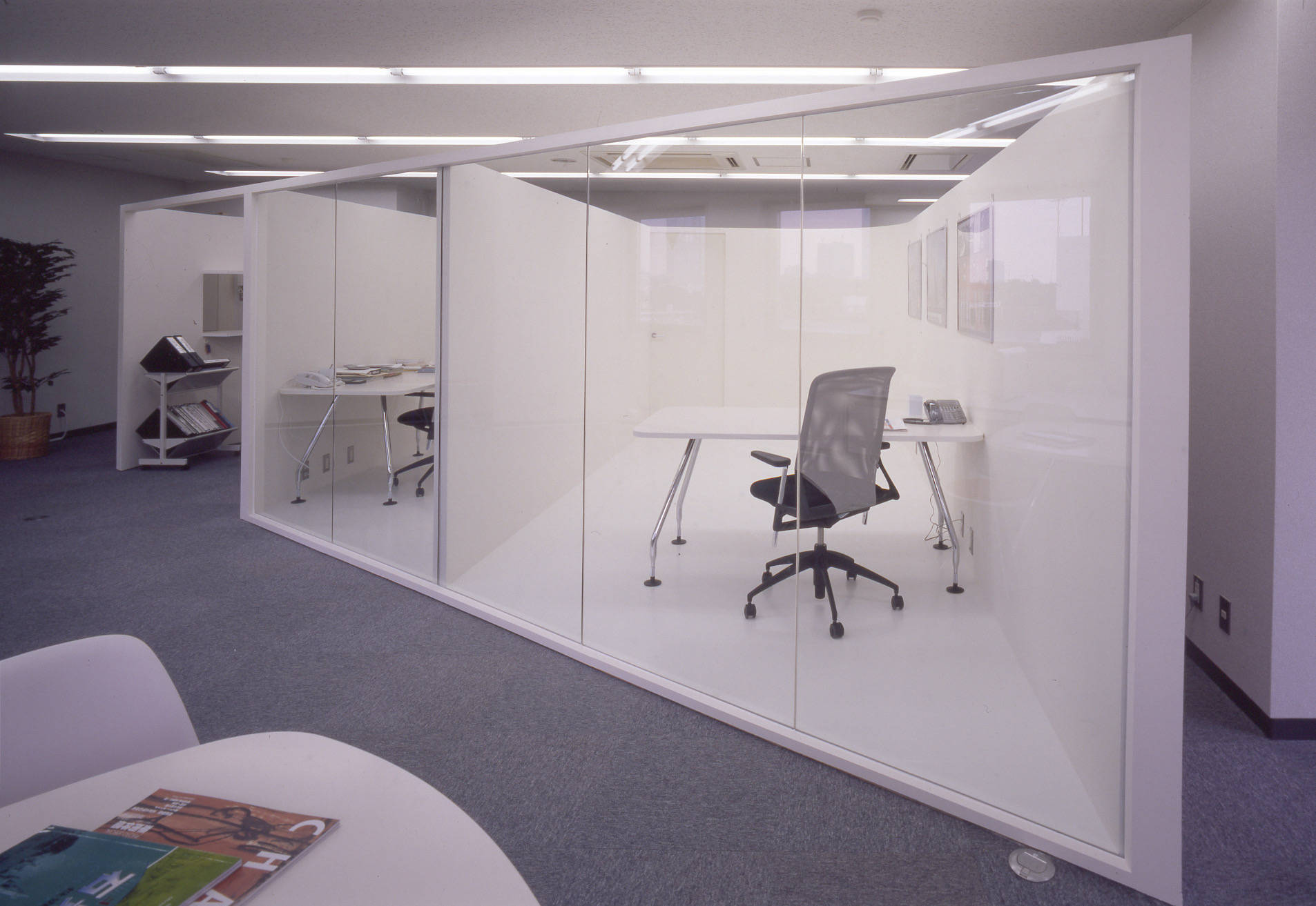 白い箱の中で、鉛の鈍い金属の塊がオープンスペースと裏動線を連続的に分け、その質感はオフィス空間に適度な刺激と存在感(シンボリズム)を与えます。それがこの会社の社会的立場と考えました。