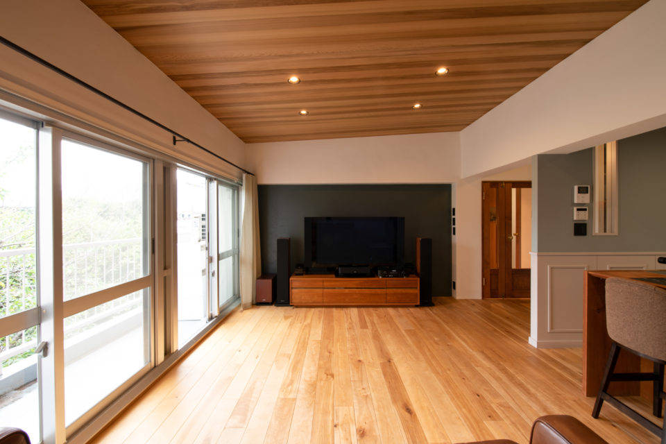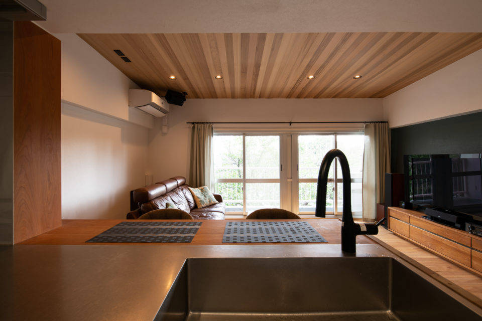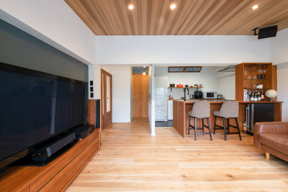 お仕事でお忙しいクライアントご夫妻のコミュニケーションの場として中央にオープンキッチンを設置しました。食事はゆったりめのカウンターでとるのでリビングにゆとりが生まれ、大画面で映画などを楽しむことができます。春になると、南の窓一面に桜の花が広がることでしょう。