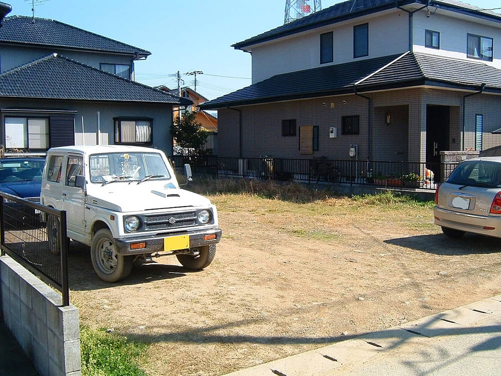 右側2階建ての家の方向は南側で左側2階建ての家の方向は東側です。この土地のみ10年以上更地の状態でした。