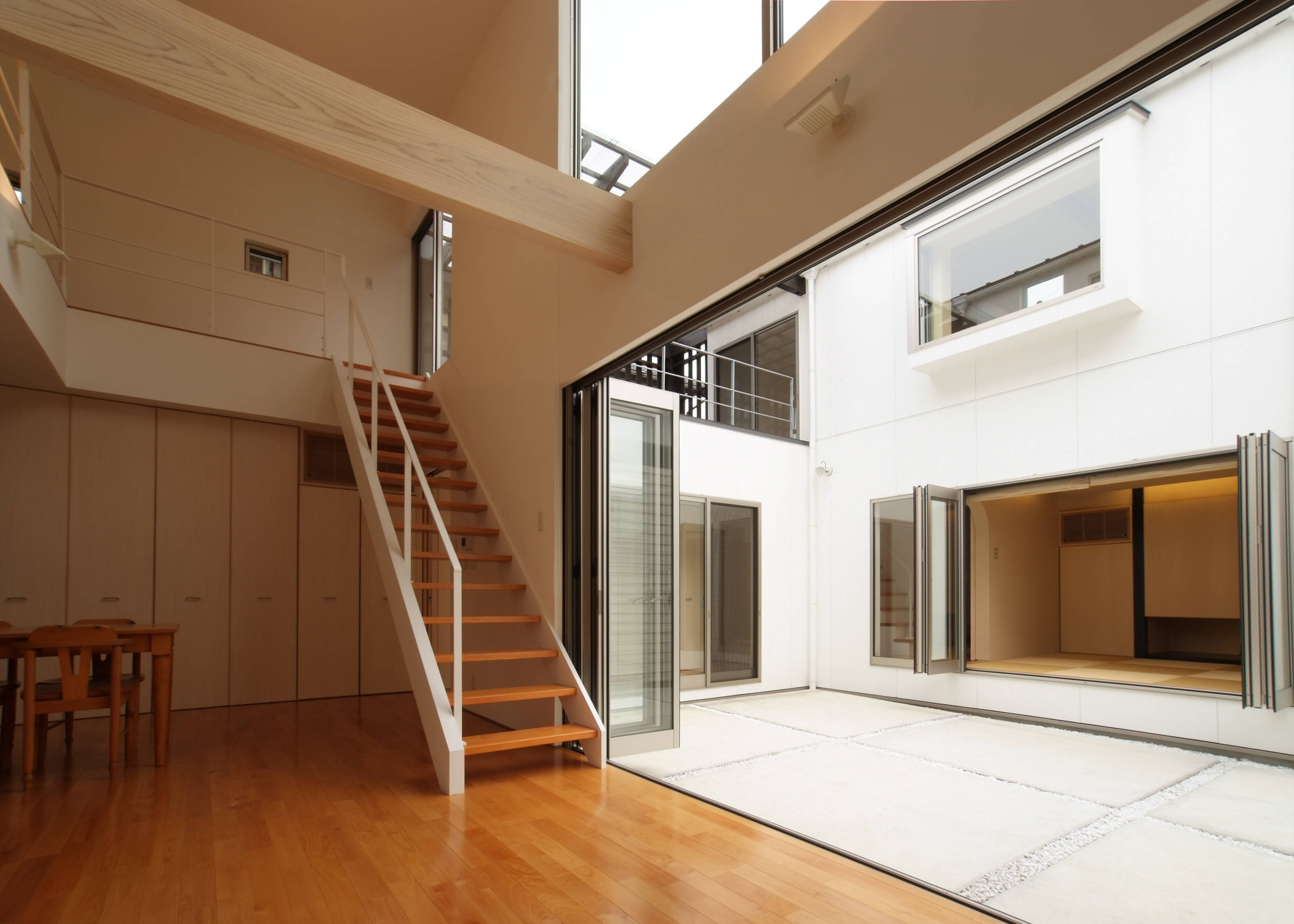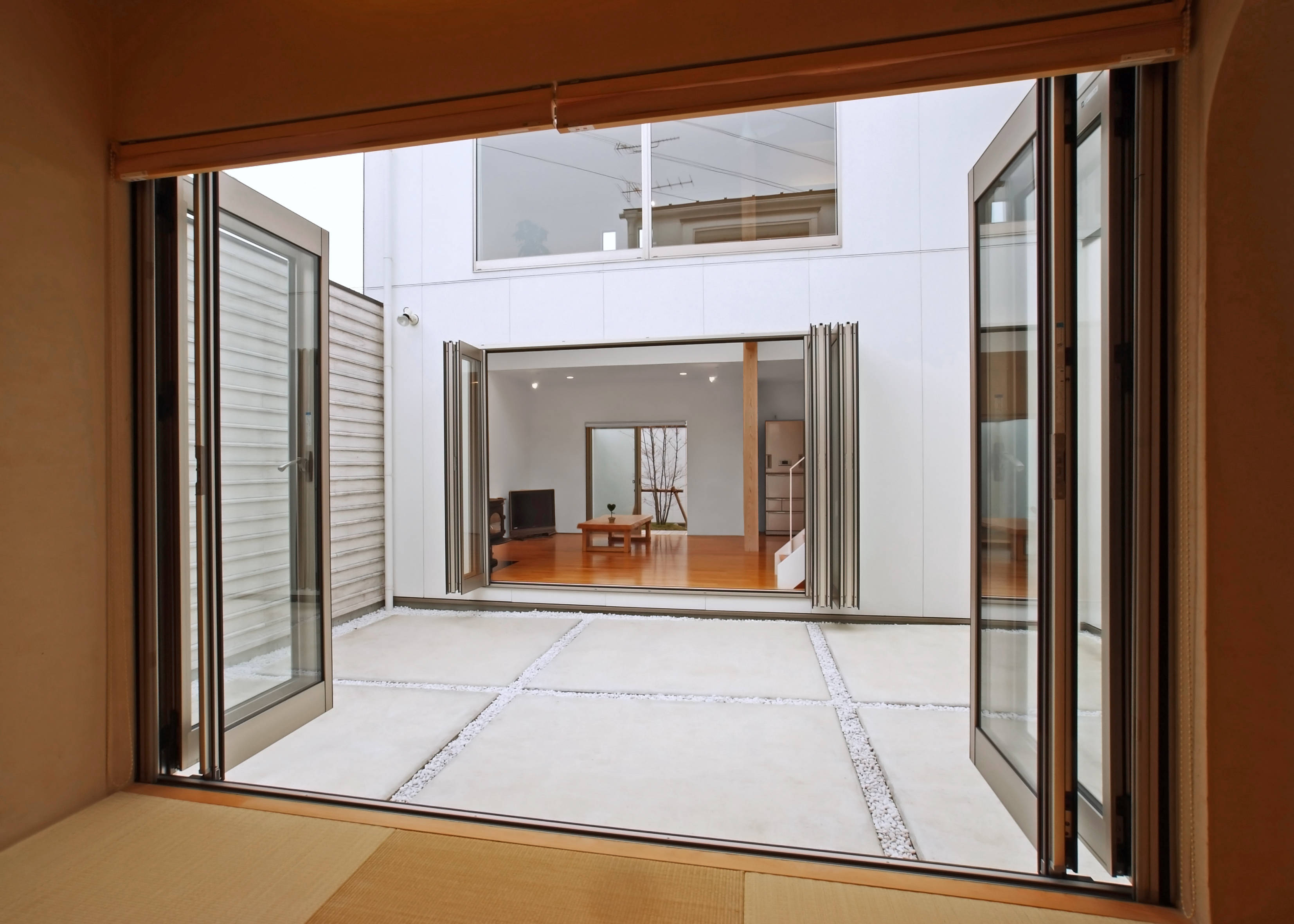 和室からプライベートコート、リビング、オープンコートを望む。この建物全体の奥行を認識できる場所です。奥行の深さを自然に感じるため、植栽等で視線を誘導しています。