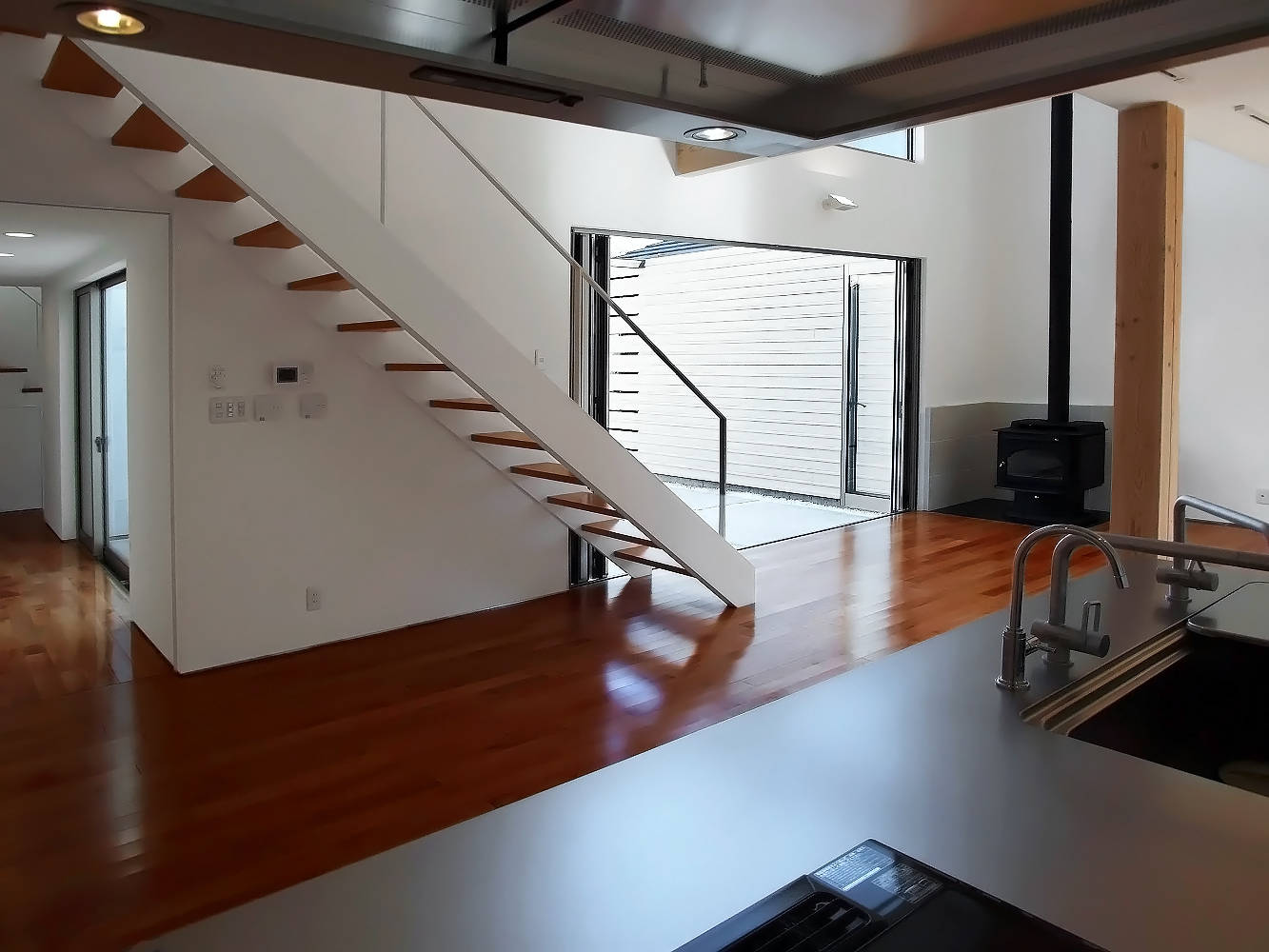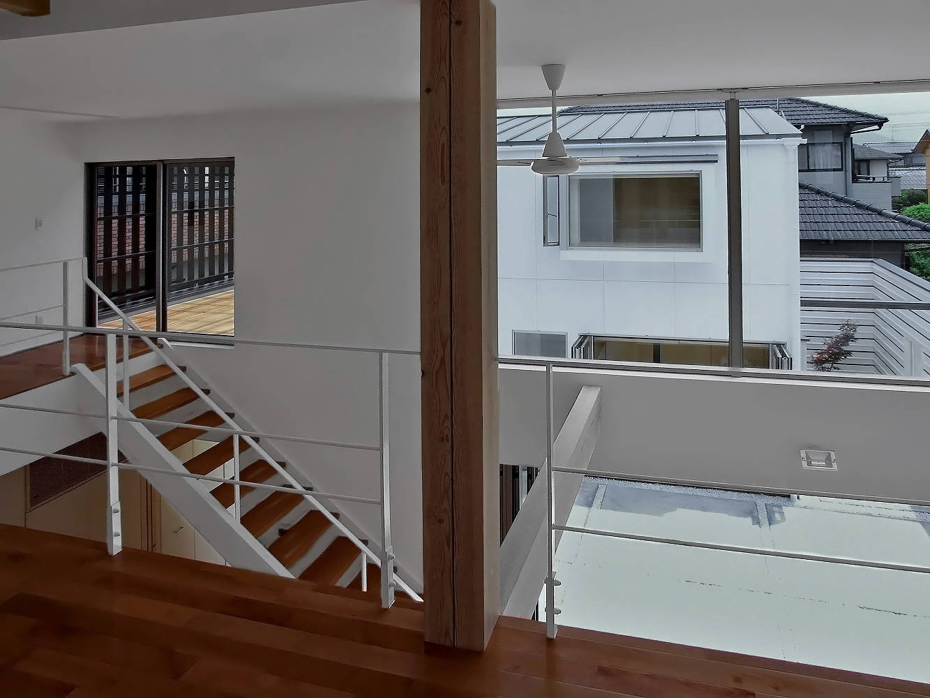 2階フリールームから内外一体の住空間を望む。大開口は隣家のどうしの狭間に合わせて設置しています。その先には田園風景、桜並木、山並みが眺望できます。