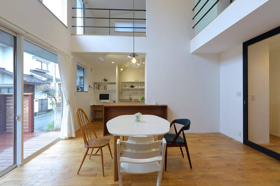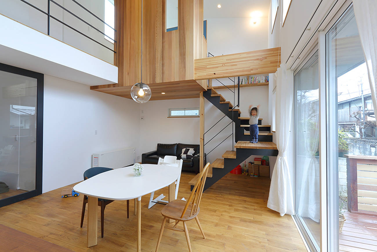 間取りはシンプルで、大きな吹き抜けを介して家族がつながります。水回りをぐるっと回れる家事動線もコンパクトで無駄がありません。