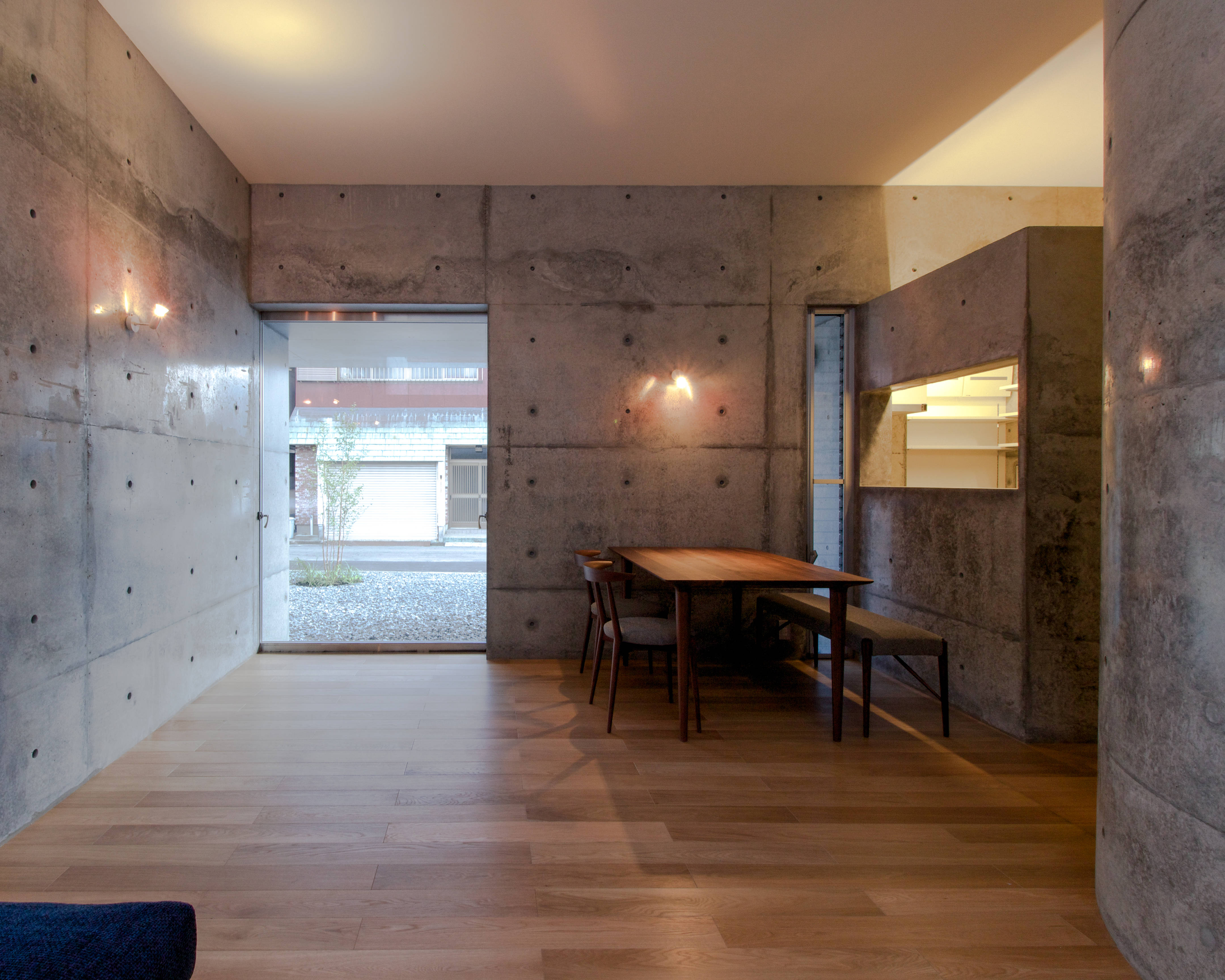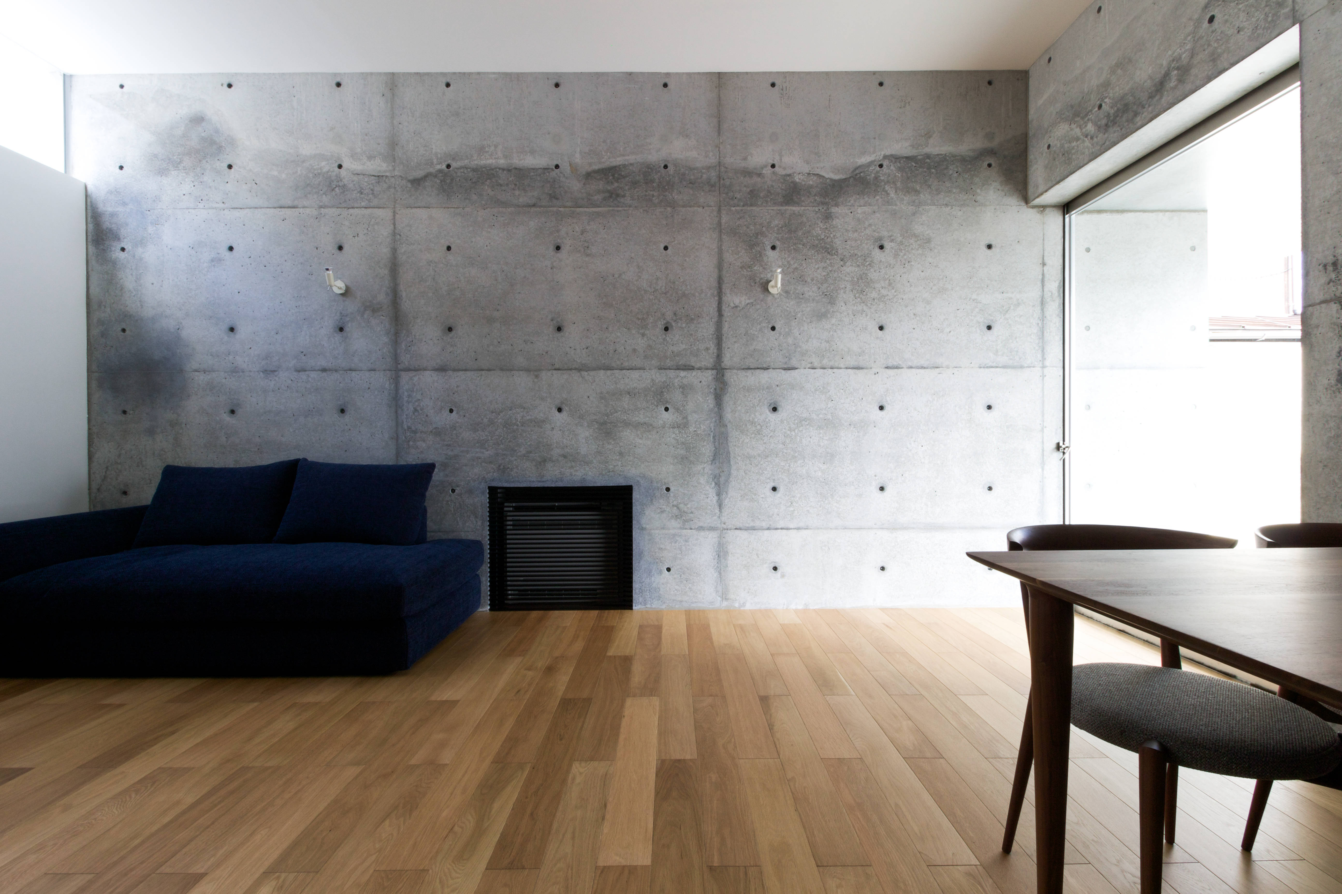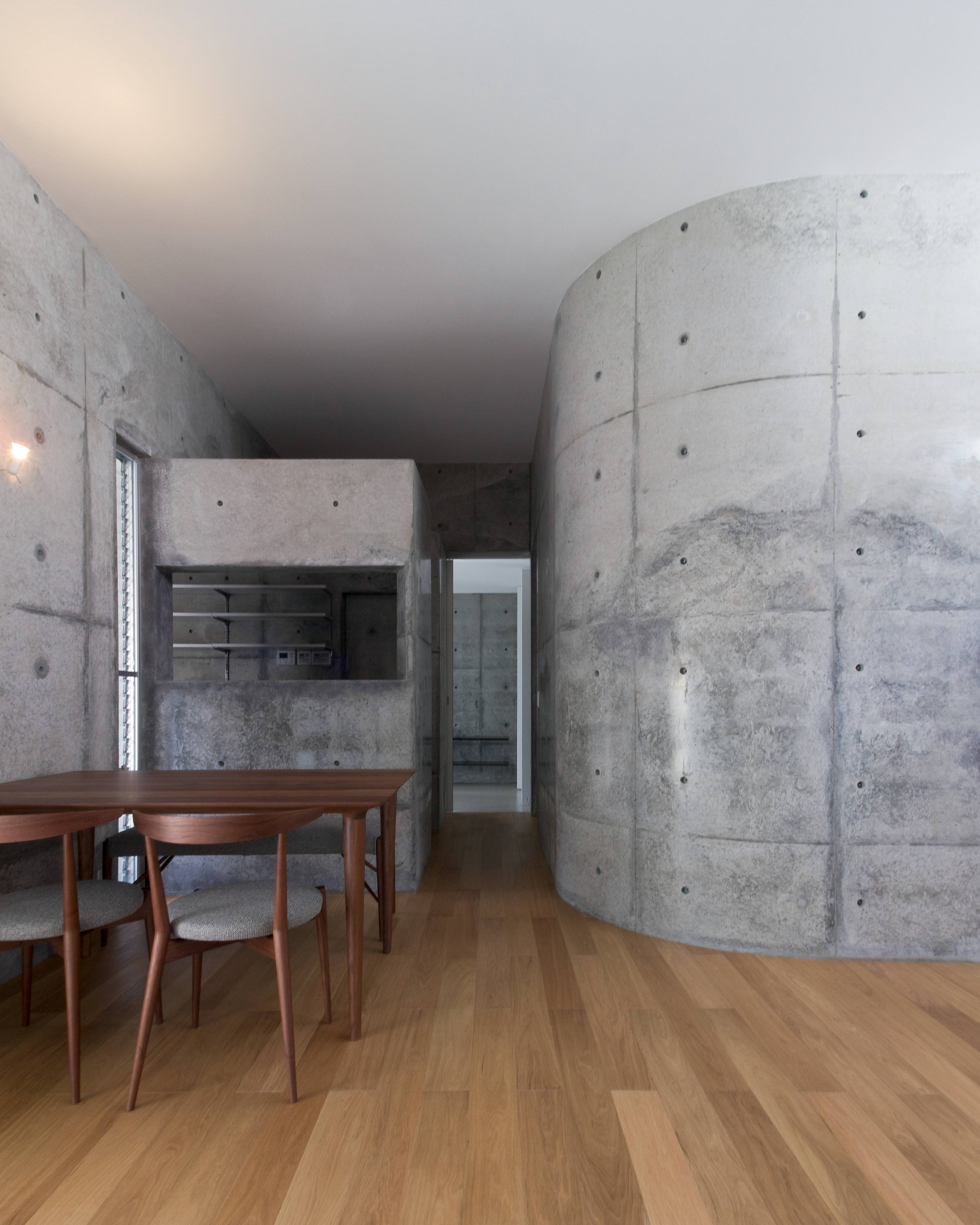 オーディオルーム(以下AR)を持つコンクリート打ち放しの住宅です。 ARに求められた気積から、基準となる天井高さを3mと設定し、ARを中心に回遊できるプランとすることで行き止まりのない開放的な住空間となりました。