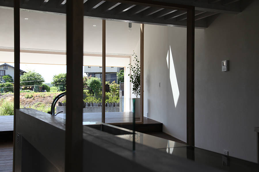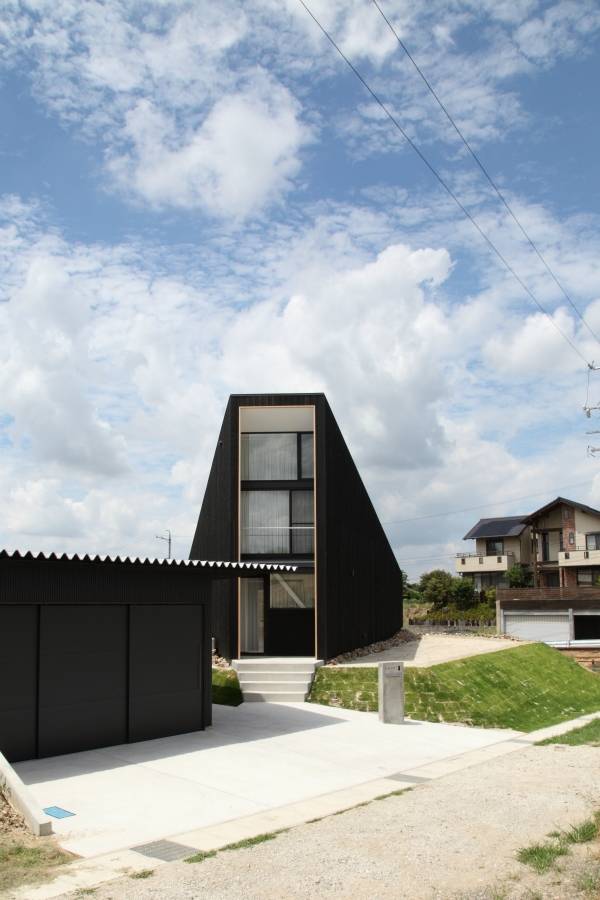 建主は東側への眺望が良いため、この敷地を選ばれた。隣接する線路は廃線となっており人通りもなく、良好な景観が得られる高台である。また西側は一部視界が抜けるが、南北には住宅が立ち並び、方位によって環境が大きく異なるといった特徴のある場所である。