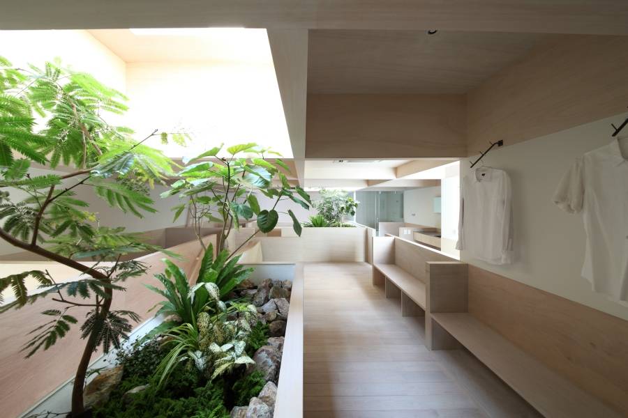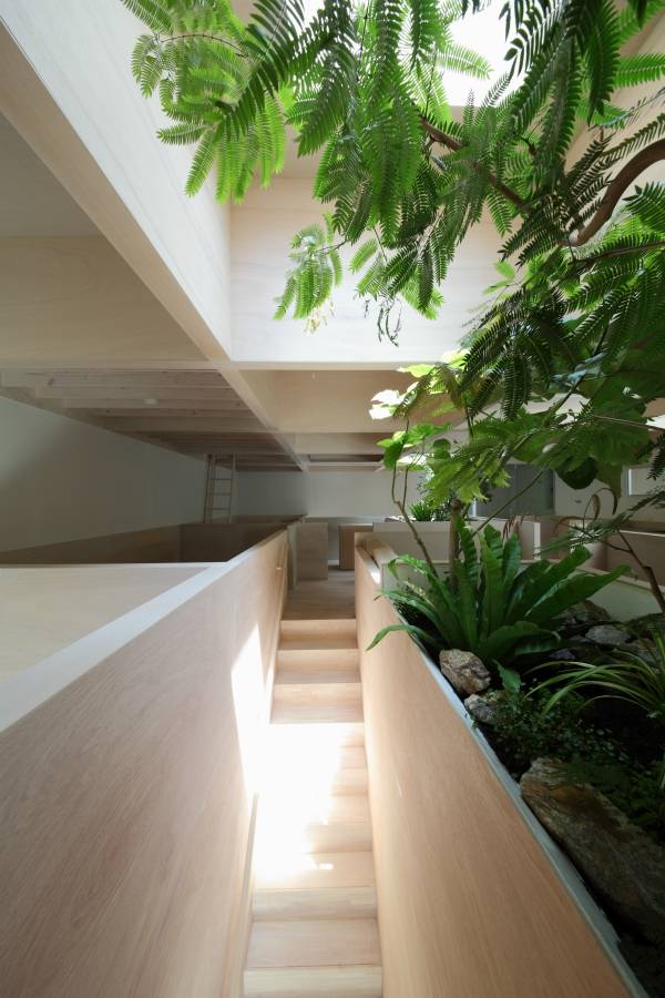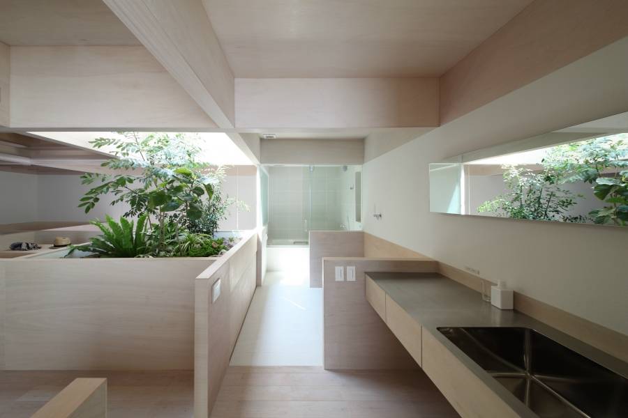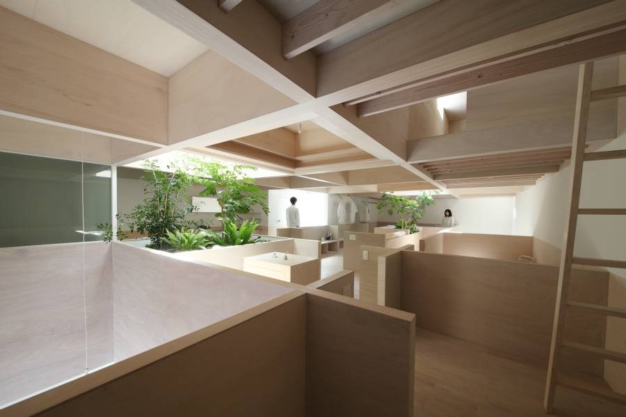 2階は子世帯の居住スペースである。13の要望諸室を満たしながら互いに閉じることなく共存するためにまず2階全体を一坪グリットに分割し、境界としての半壁を設置しそこに諸室を配置した。さらに一坪グリッドの垂壁を用いた構造計画により視界を遮らない無柱空間となっている。腰壁は緩やかな境界として機能し立位時には全体が見渡せるパブリック空間となり、臥位や座位時は腰壁に隠れてプライベート空間になるといった、体位によって同一空間がパブリックとプライベートを併せ持つ構成となっている。グリットにあわせた居室配置は水周りを除き子供の成長に合わせて用途を変えられるようになっており、また2つのインナーガーデンが採光と通風を担うことで室内は風に揺らめく植栽と自然光によって心地良い外部環境とつながっている。