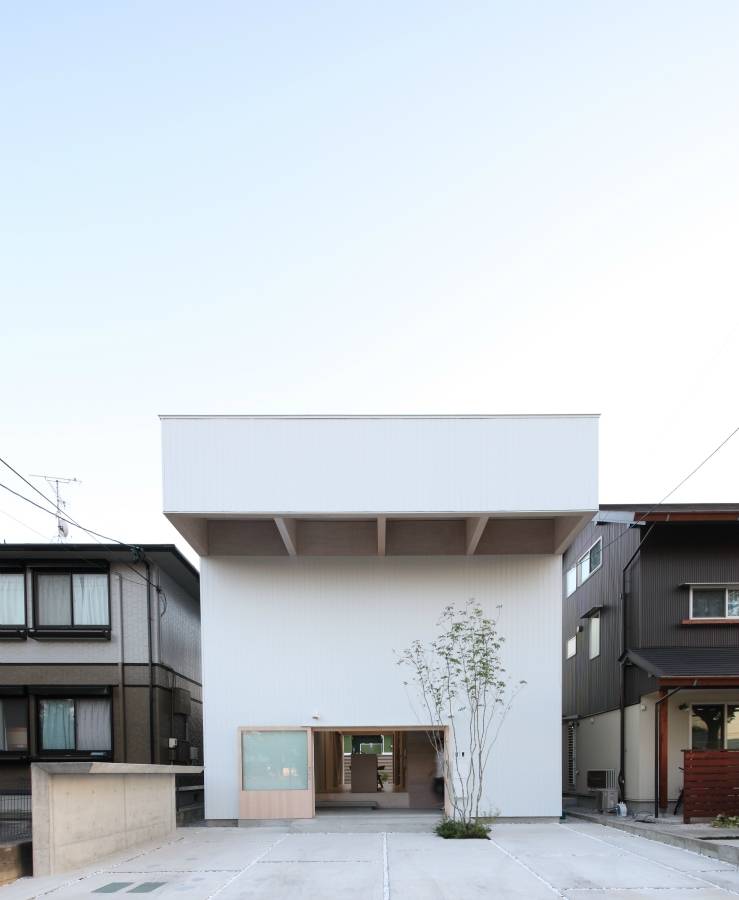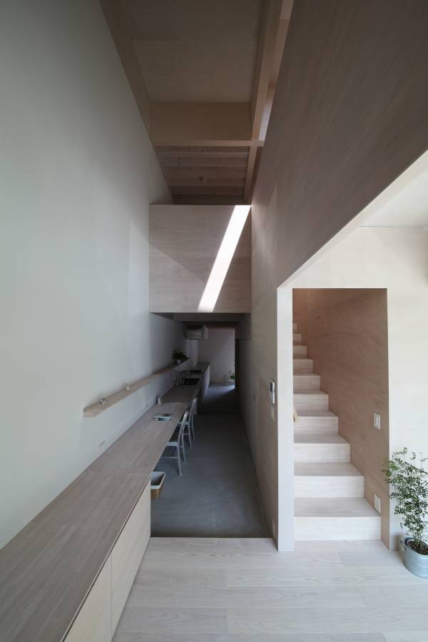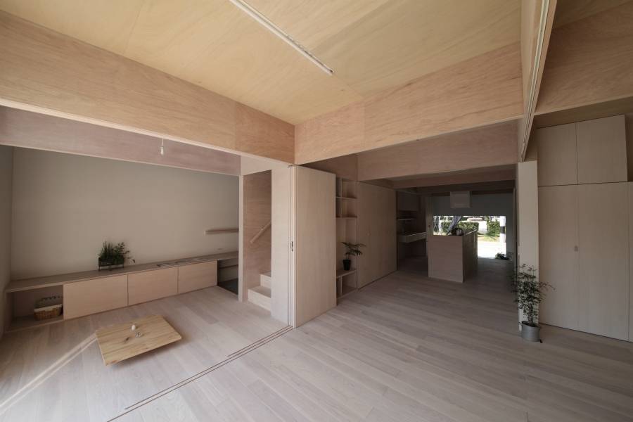 のどかな住宅地に建つ二世帯住宅の計画である。敷地北側に公園が隣接していたため、子供の日常的な遊び場や借景として公園とのつながりが要望された。そこで建物北面に引込みの開口を設け動線と視界の繋がりを確保し、広めのエントランスと段差を設け春には室内から花見が楽しめるようにした。北側に土間エントランス、南側にプライベートガーデンを緩衝スペースとして設けることで外部環境を内部空間に緩やかにつないでいる。二世帯間は階段室と収納を収めたヴォリュームを境に東西に隔てられ、南側の世帯間に設置した引戸によってフレキシブルに区画されている。実際日中は戸が開いていることが多く、世帯間を越えて子供たちが走り回りフロア全体が回遊性のある遊び場となっている。