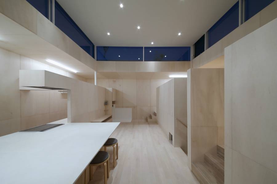 住宅地に建てられた住宅である。敷地内には1.5m程の高低差があった。周囲の住宅は擁壁の上に建てられており街並みとしては3階建てと同規模の住宅が並んでいた。この計画では敷地の低い場所に水回りと寝室を積み、高い場所にリビング等家族があつまるスペースを配置した。全体的な高さとしては1.5層程となっており周囲の住宅にも自然光や空への視界が確保されている。