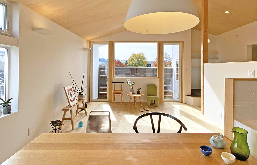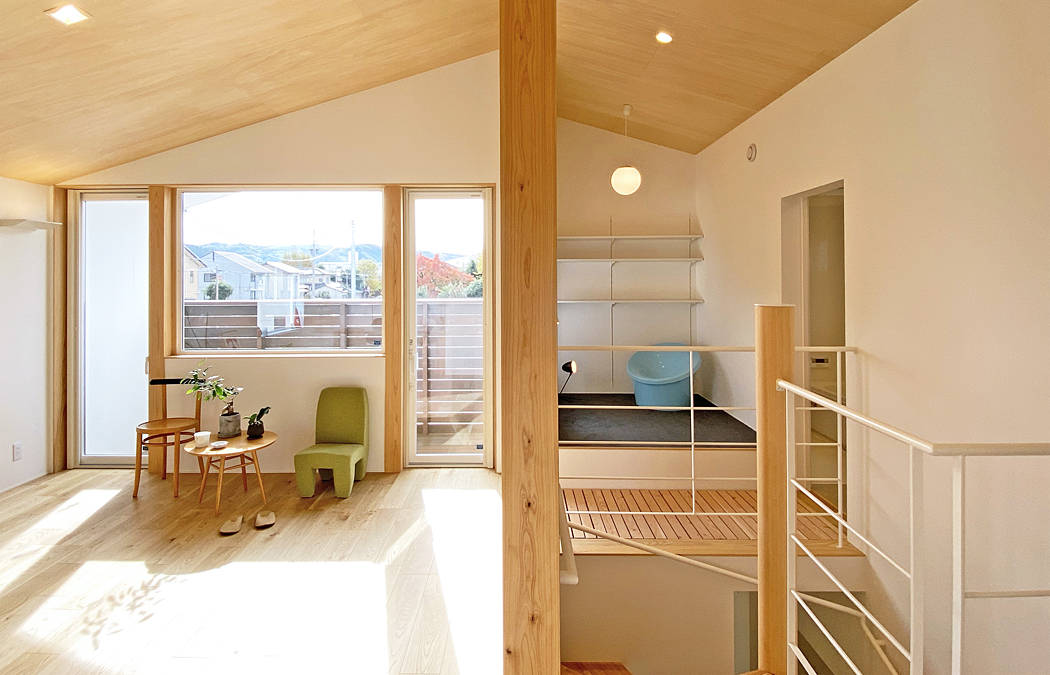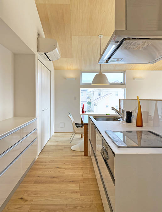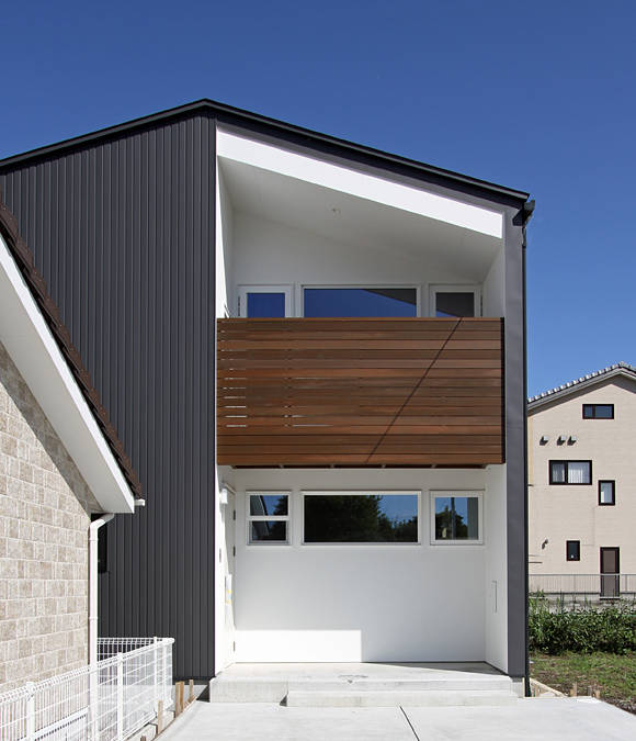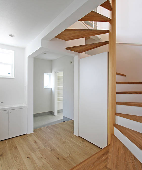 住宅街の旗竿地に建つ建売住宅の計画です。敷地は南の前面道路を挟んで墓地があり、その奥に大木のある公園があります。 目の前の墓地が一見マイナス要素にもとれる環境ですが、将来的に建物が建つ可能性が低く、うまく室内からの視線をコントロールすることで 大きな空と遠くの緑を取り込んだ開放的な2階リビングができました。プランは螺旋階段を中心に1、2階とも各室が行き止まりなくつながる構成で、 コンパクトながら広がりを意識した計画としました。