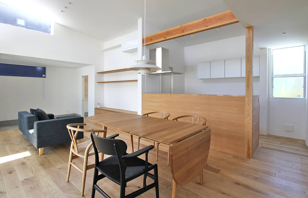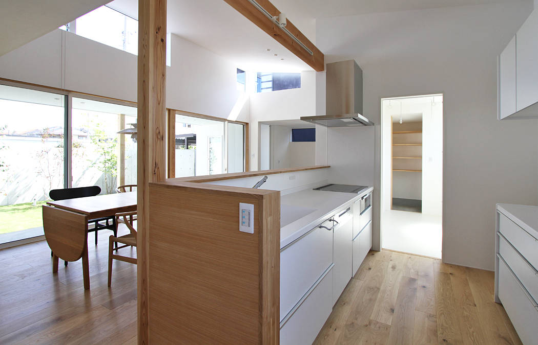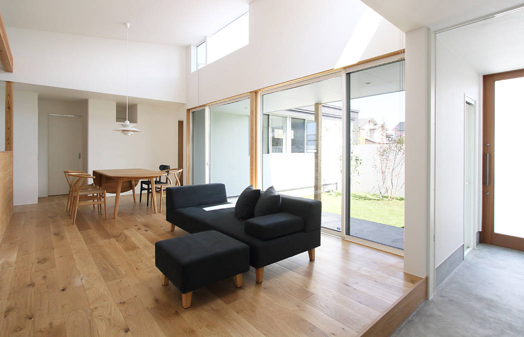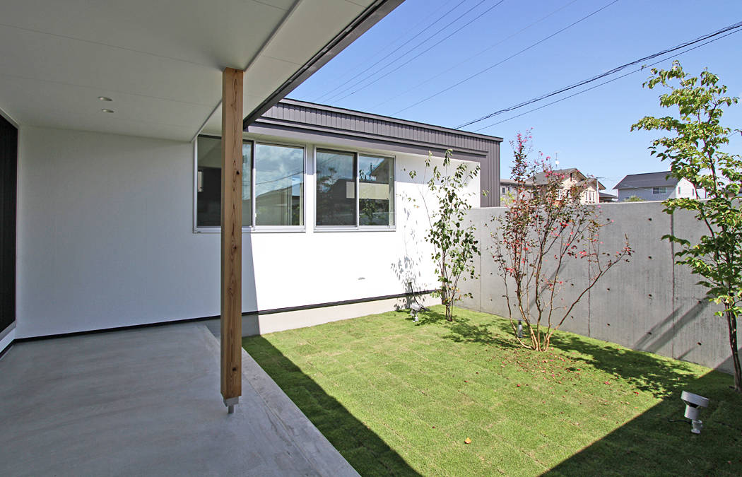 庭とつながるリビングとテラスのある住まい。深いひさしのテラスは天候を気にせず外を楽しめる半屋外の場所となっており、 くつろぎの時間、友人とのバーベキュー、子供たちのプール遊びなど多様な使い方が考えられる暮らしの中心となる場所です。 また、リビングの一部となる土間空間は、玄関から土足のまま連続しています。今はロードバイクや植物を置いていますが、将来はドッグスペースとなる予定です。