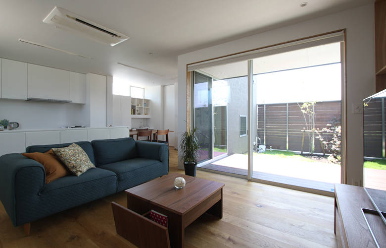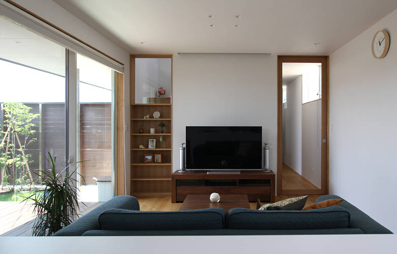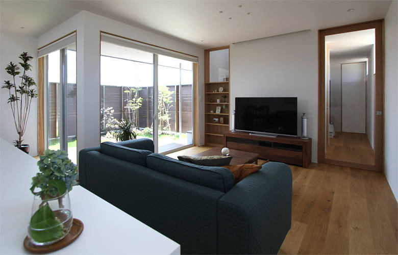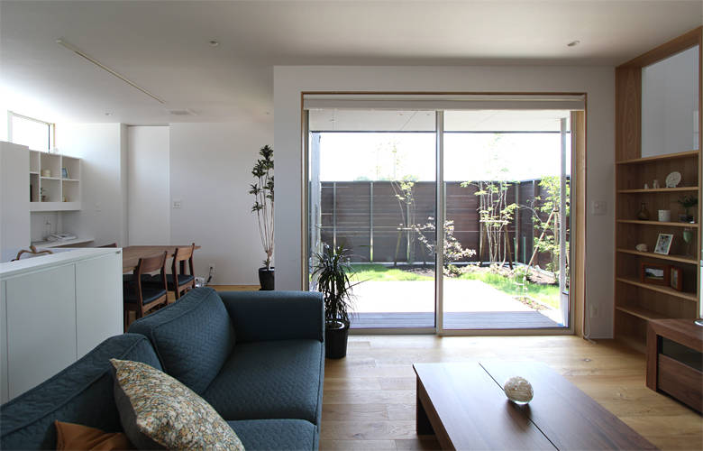 準工業地域内の新しい区画整理地において、道路向かいに大きな建物が建つことを想定し、外壁と一体的な板塀で囲われた中庭のある住まいを提案しました。 落ち着きある仏間は独立させ、LDKと水廻りが庭に面するシンプルなプランで、緑を身近に感じられる機能的なかたちとなっています。