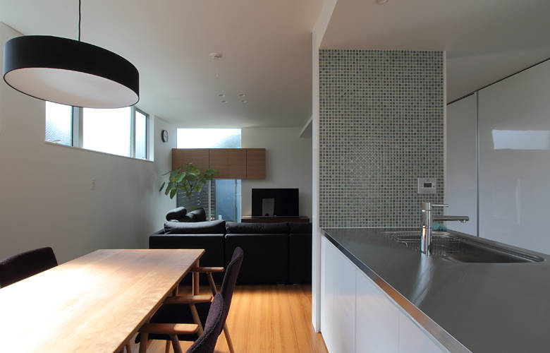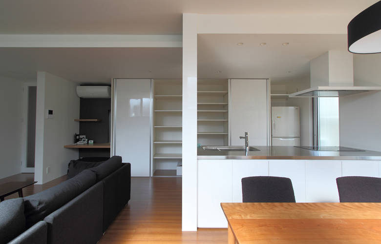 歴史あるお寺につながる住職の住宅(庫裏)の改修工事です。風格ある本堂とは対象的に、住居部分はシンプルでモダンな空間としました。 構造上必要な壁は残しつつ、開口部の大きさ、高さを見直すことで、明るく開放感のある室内空間となりました。