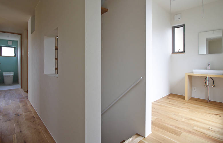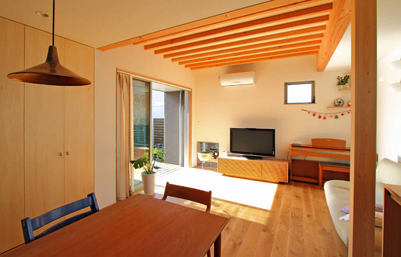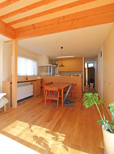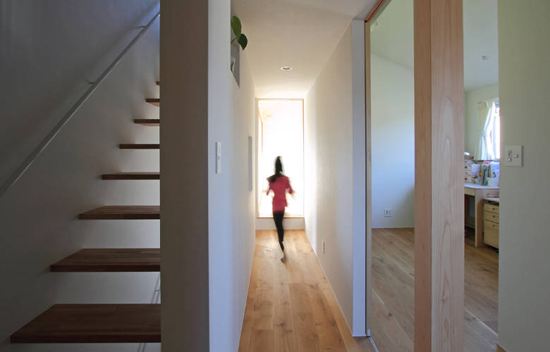 北西の角地に建つ住宅の建て替えです。東と南には大きな住宅が建つ状況で、明るさと開放感を確保するため、リビングスペースと子供室をあえて道路に面した 北に配置しています。その上で、南の空地に庭を配し、大きな開口部を設けました。シンプルなふたつの切妻屋根のひとつは、1階にリビング、2階にはタタミのセカンドリビングがあり、 どちらも眺めの良い南庭に開いています。