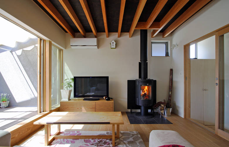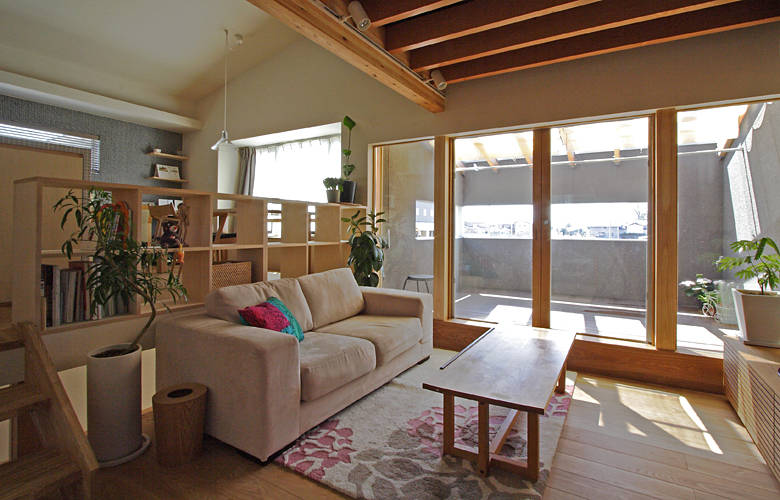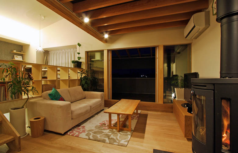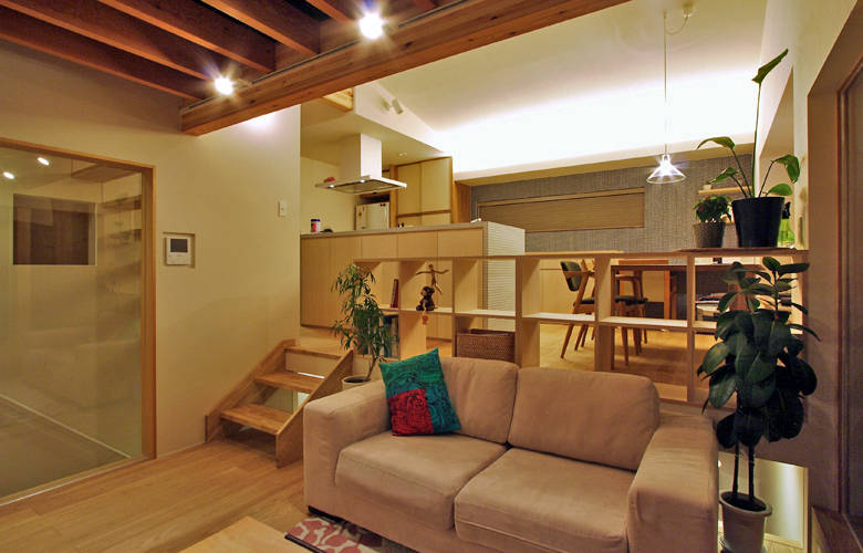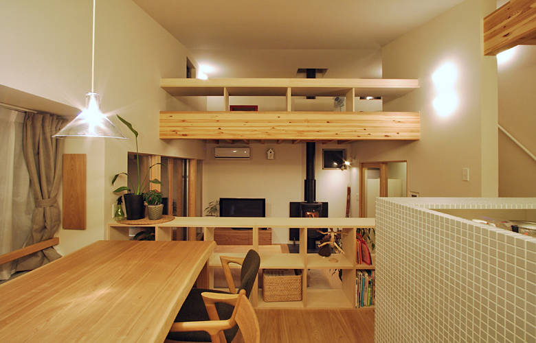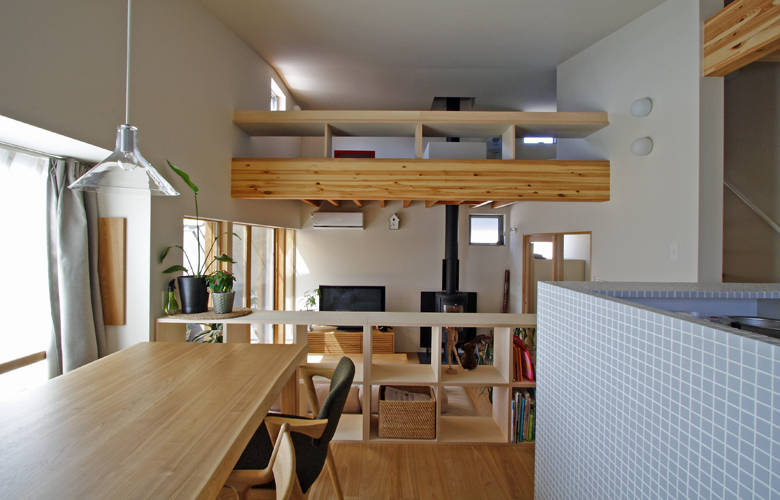南北に細長い計画地において、ビルトインガレージを設けつつ、南面に間口が広く日当たりのよい空間を確保するため、スキップフロアの中2階リビングとしました。 家全体を大きな箱として立体的に空間をつなげ、段差によってそれぞれの場を作っています。 何となく気配が伝わる適度な距離感で、それぞれの居場所がある住まいです。