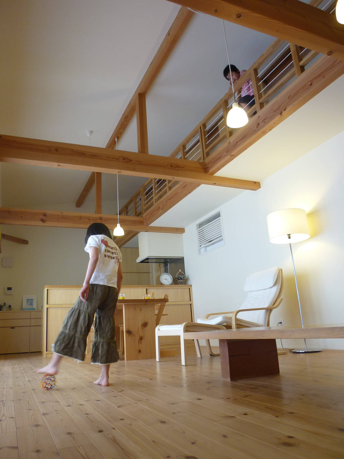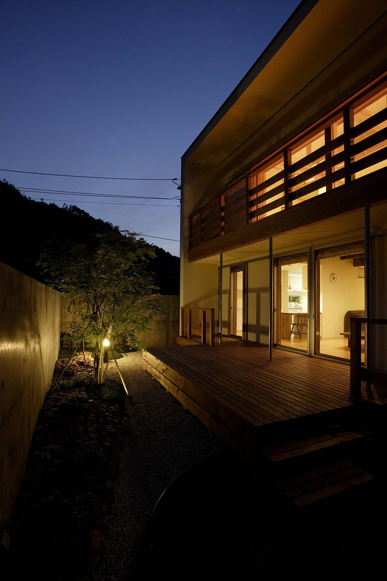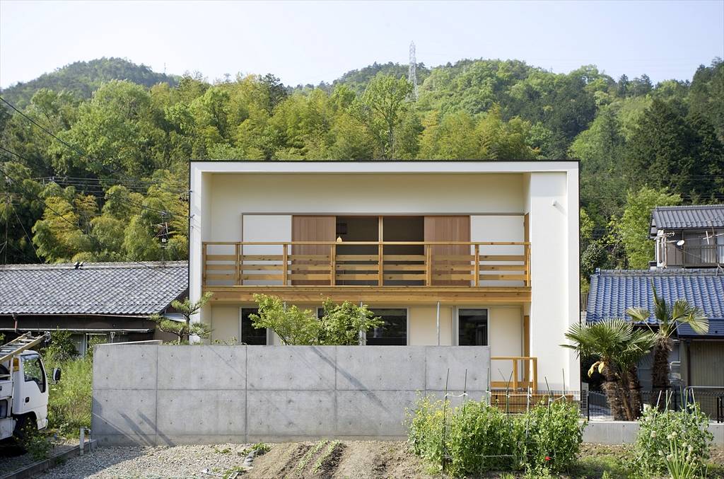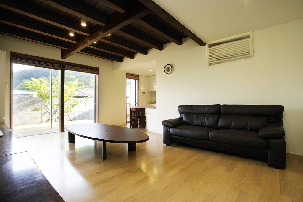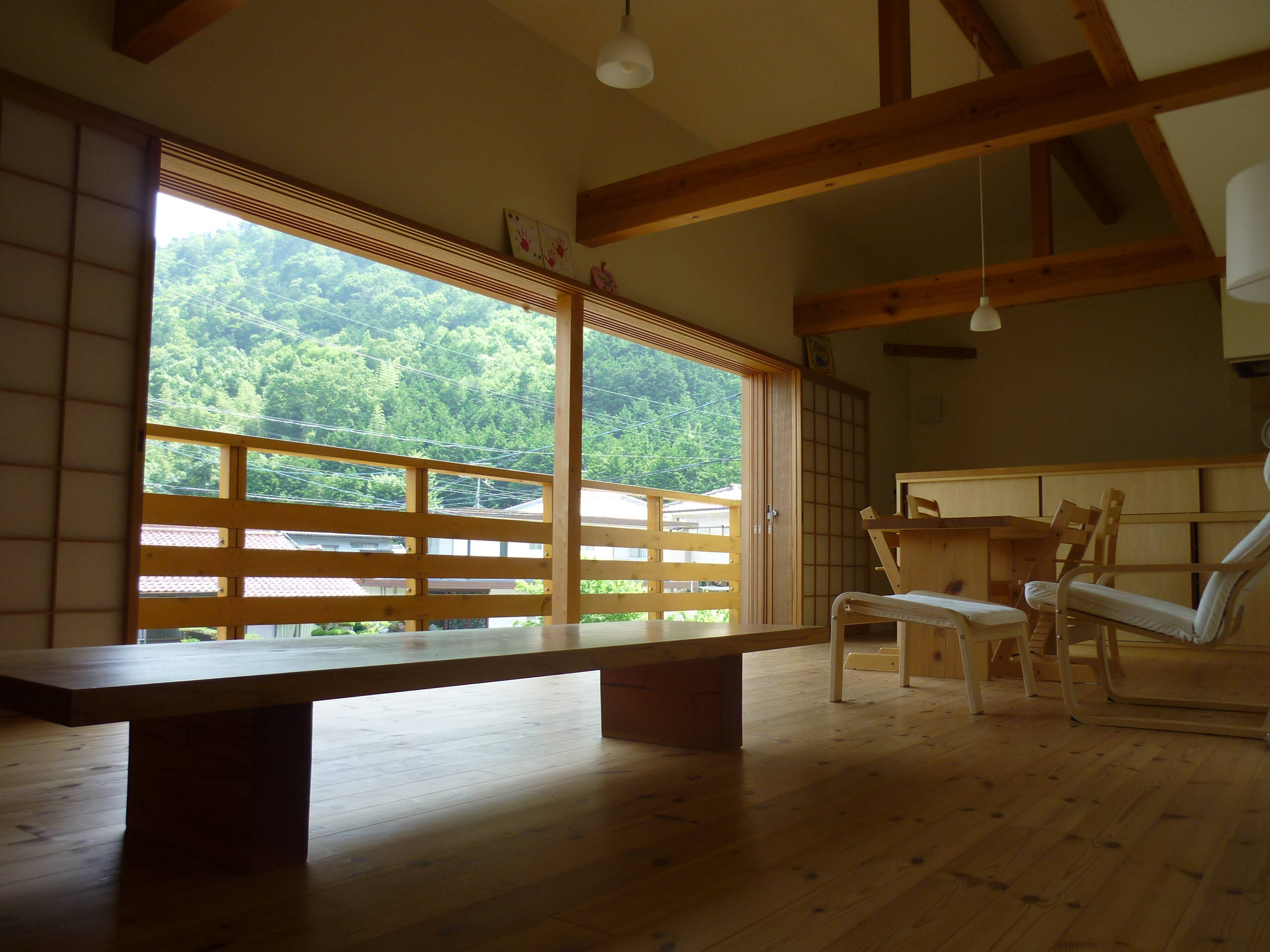 岐阜市北部の山に囲まれた地域にあります。 くの字状に折れた敷地形状に合せて、建物も玄関部分と居住部分とを折り曲げた形で配置してあります。南側には遠く金華山を望むことができ、住宅内部からもその景色を取込むことができるよう配慮してあります。