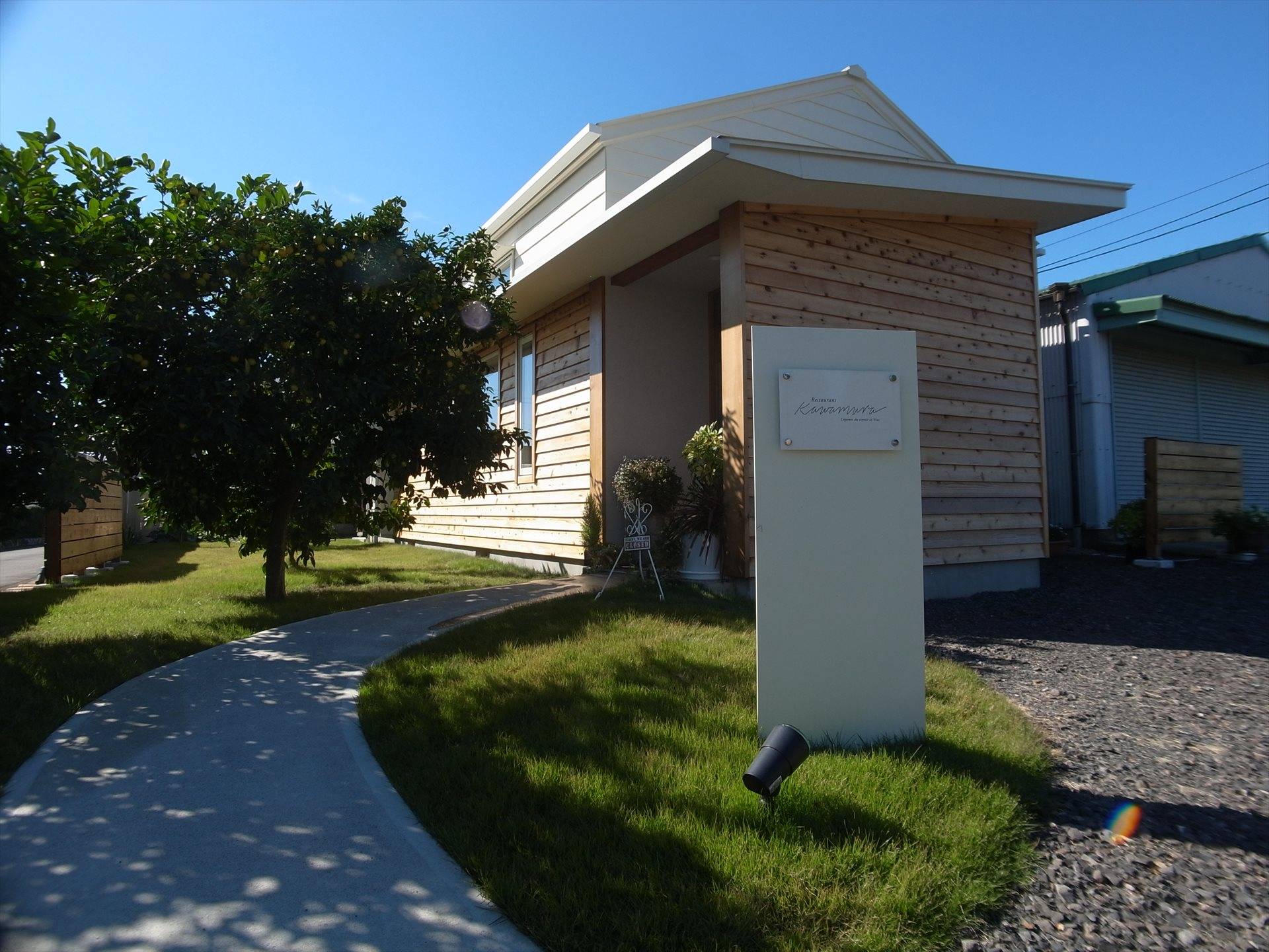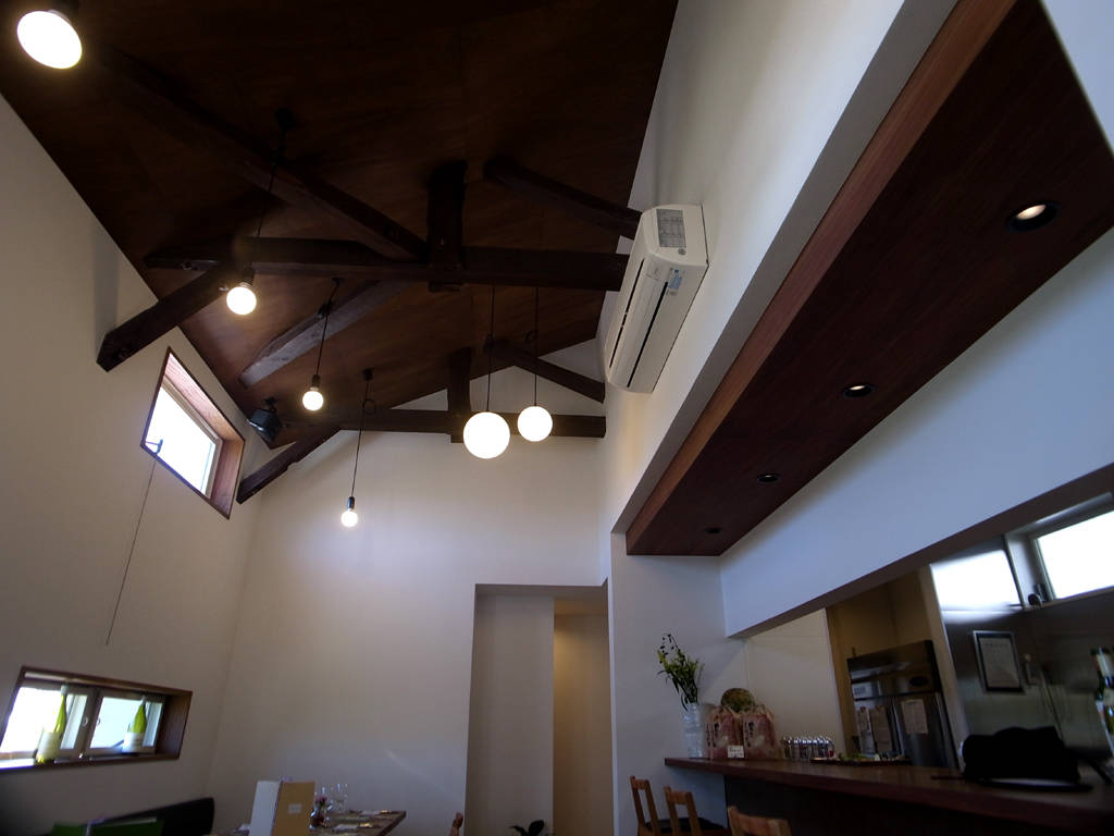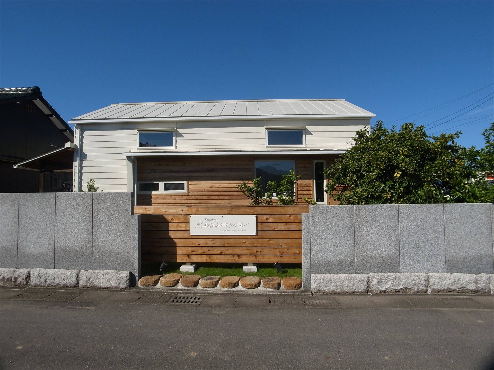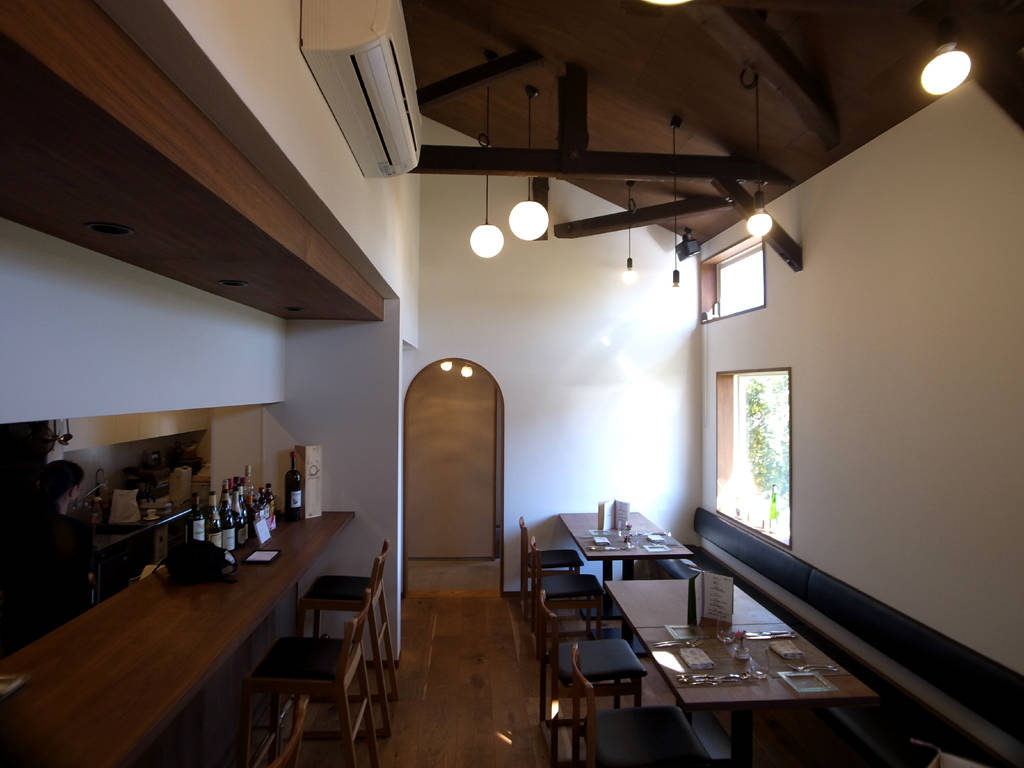 田畑に囲まれた住宅地にたたずむ隠れ家的なレストランです。建物は元は地元の学校給食室として使われ、その後、移築され馬小屋、近年は農機具庫として使われてきました。そんな建物を長く愛されるお店になることを願って下記の内容をテーマに計画しました。 1.周辺環境になじむ外観意匠 2.既存のトラス構造の梁を活かし、開放的なホールと作業効率のよい厨房 3.既存石塀と既存樹木を生かした外構計画 4.耐震補強