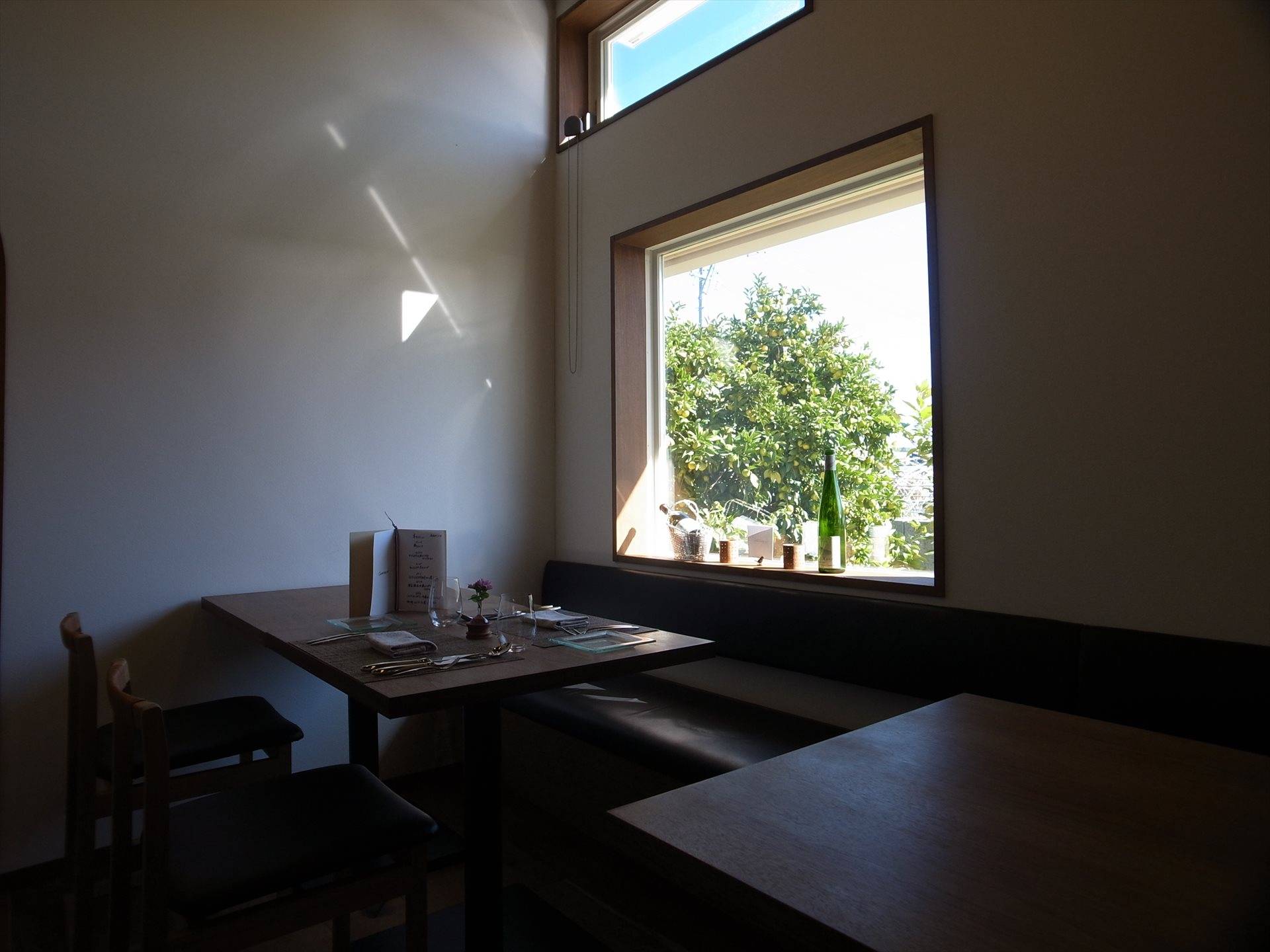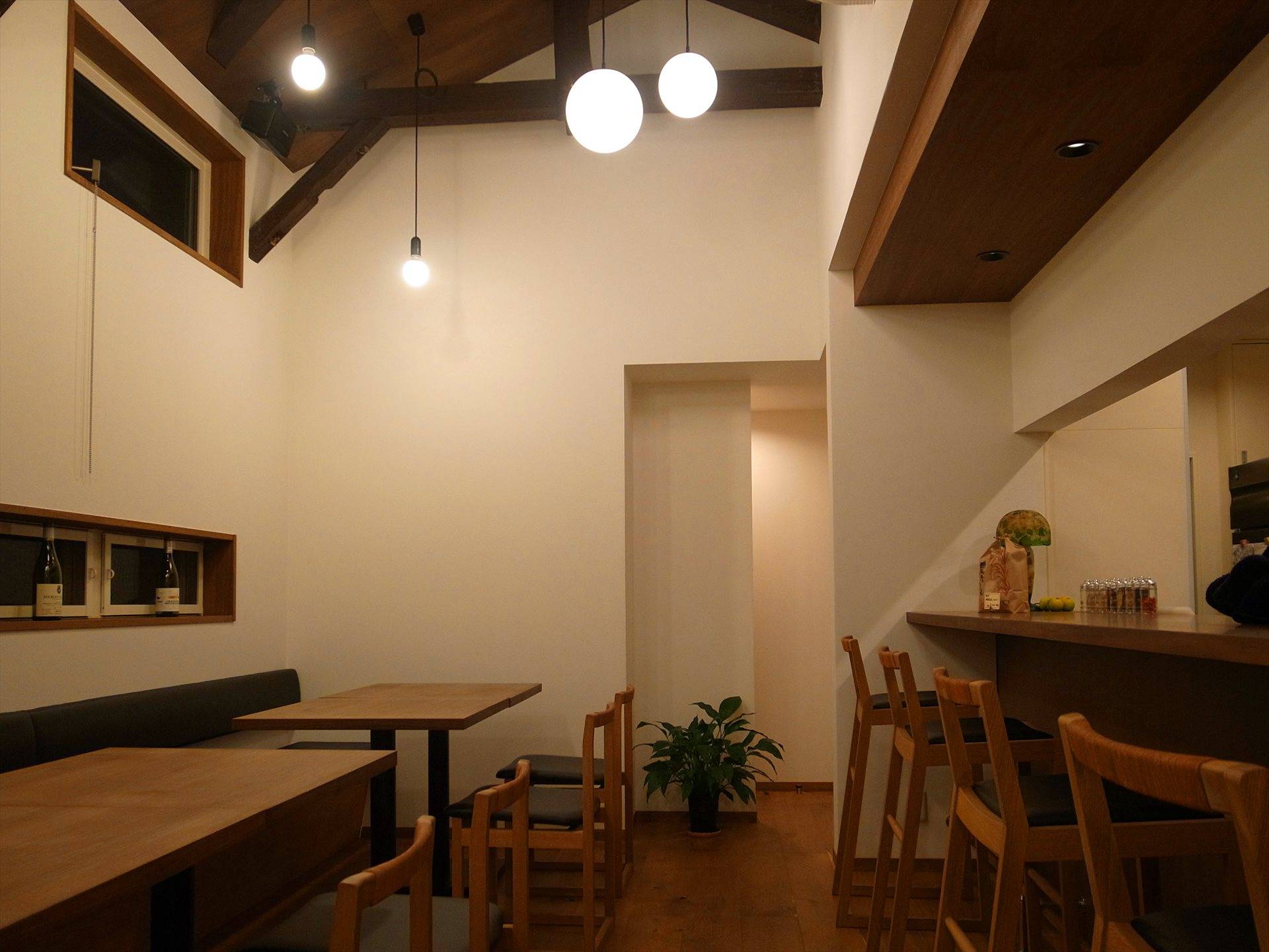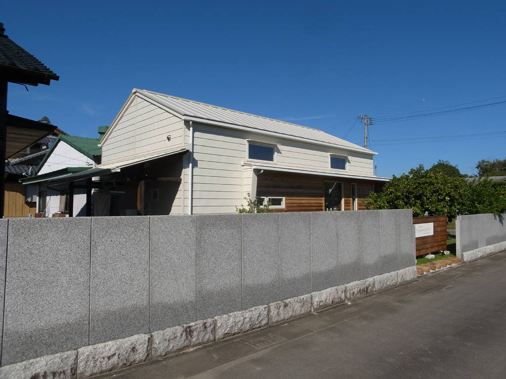 田畑に囲まれた住宅地にたたずむ隠れ家的なレストランです。建物は元は地元の学校給食室として使われ、その後、移築され馬小屋、近年は農機具庫として使われてきました。そんな建物を長く愛されるお店になることを願って下記の内容をテーマに計画しました。 1.周辺環境になじむ外観意匠 2.既存のトラス構造の梁を活かし、開放的なホールと作業効率のよい厨房 3.既存石塀と既存樹木を生かした外構計画 4.耐震補強