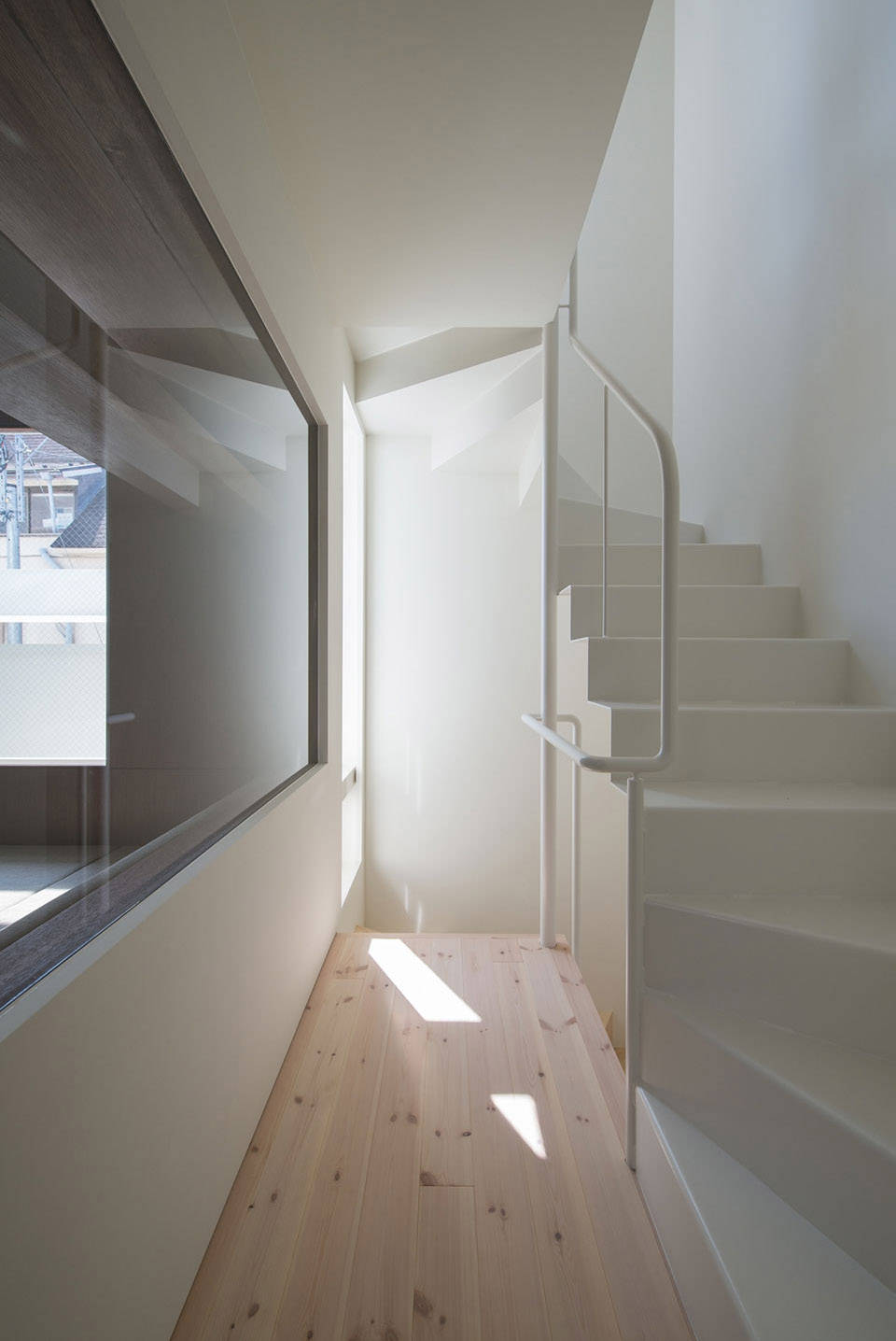 2階のリビングの窓の外に、太陽の高度を計算した角度で白い横板を並べ、室内に送り込む光をコントロール。