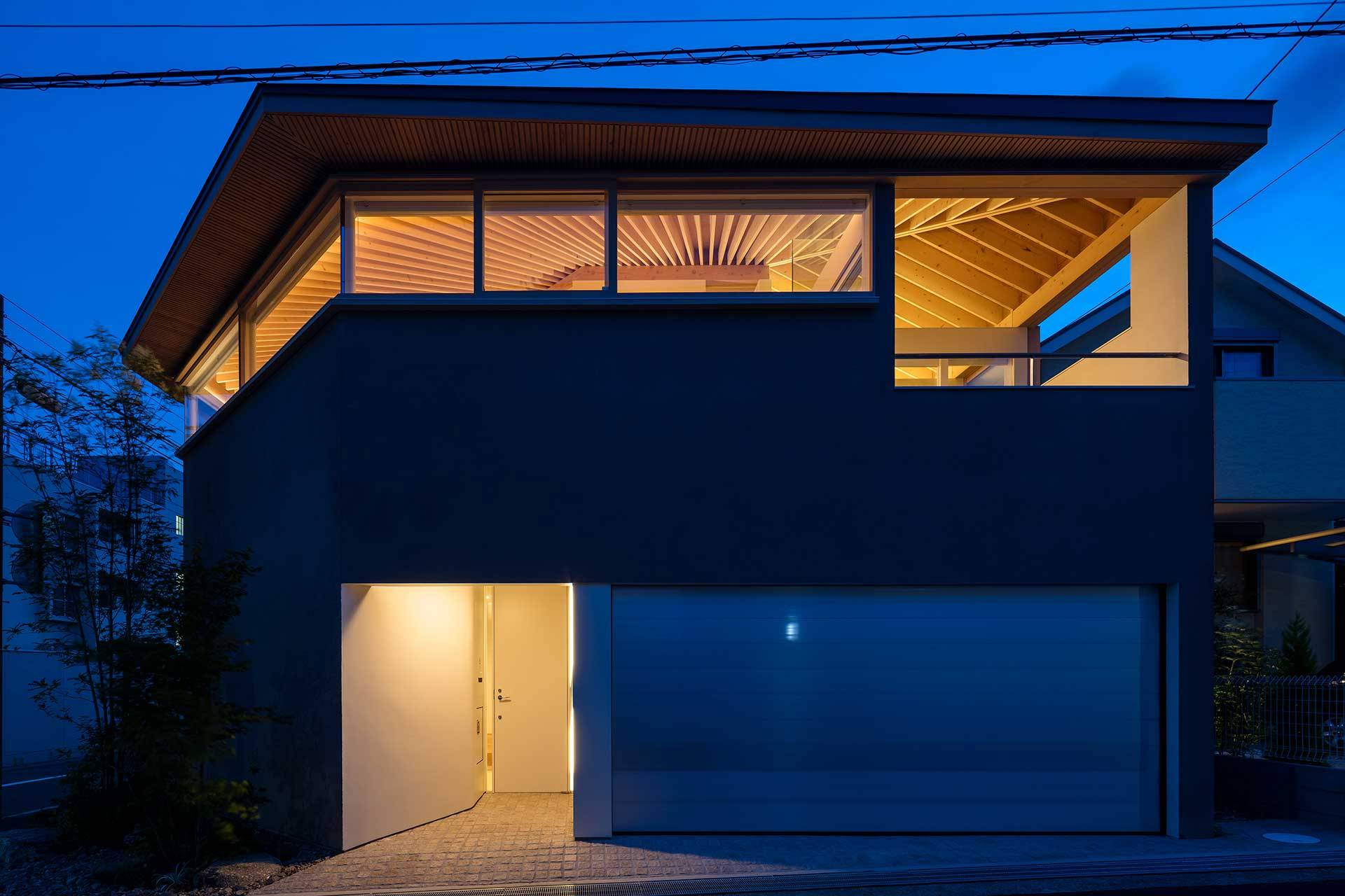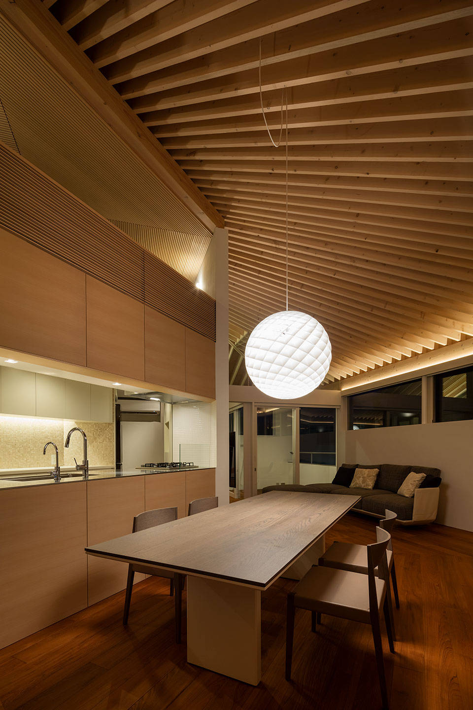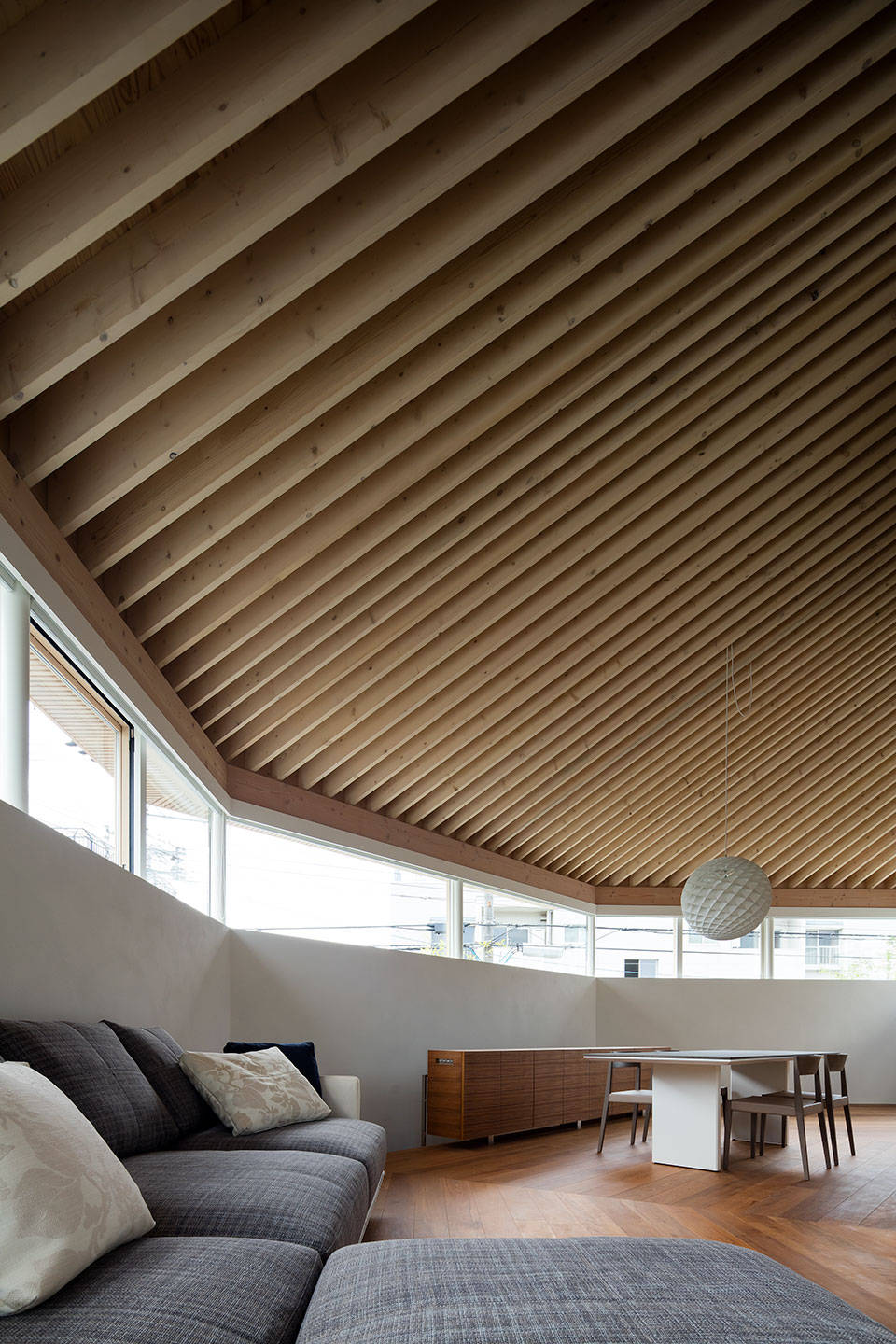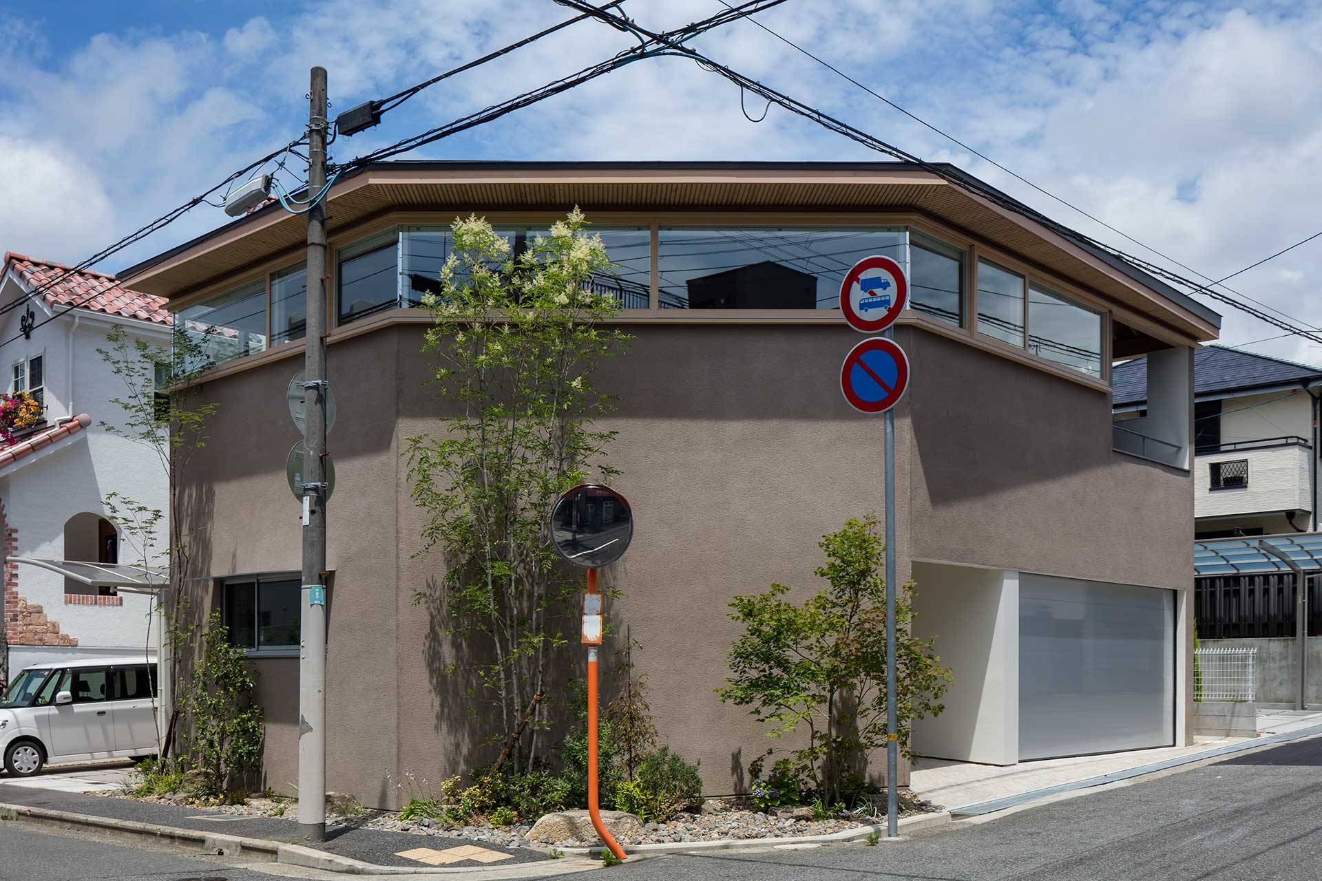 開放感があり広がりのある空間を求める建主の要望、南東に接道する角敷地の形状、雑多な街並みと空に広がる景色をどう活かすかを考慮して設計しました。