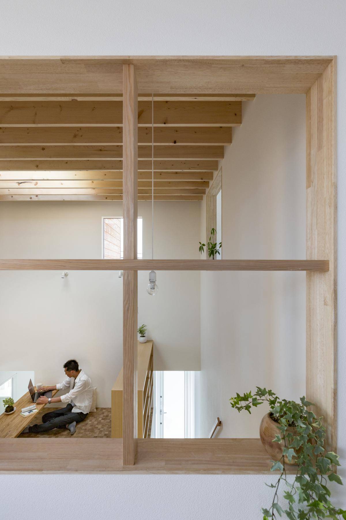 光溢れる中二階は階段の踊り場としての動線を兼ねながら、時には子供達の遊び場や勉強コーナーとなり、時にはご主人の書斎コーナーと変わったりと多様な空間として活用出来ます。