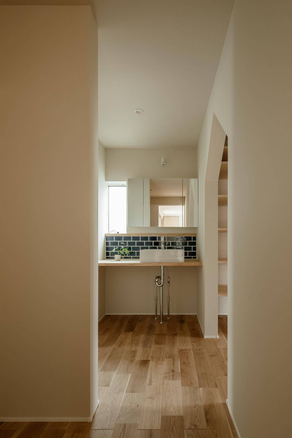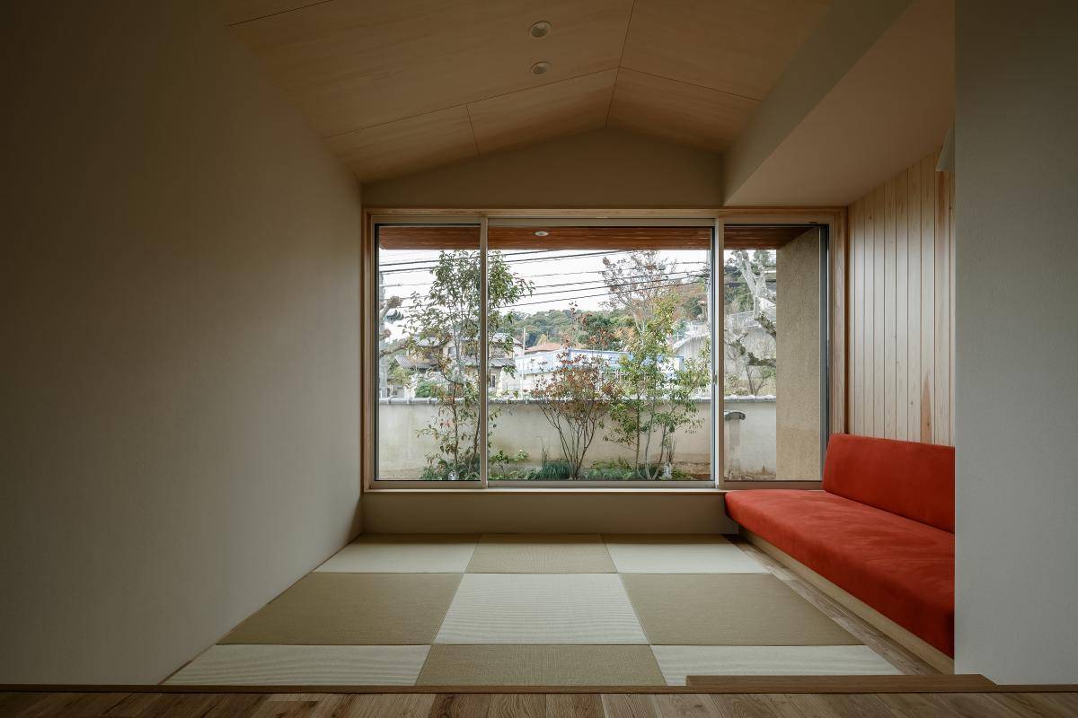 また大きな開口部を間取りの両端に配置し、外部との間にバッファーゾーンとなる縁側やバルコニー空間を設けることで緩やかに外部空間との繋がりを創り出し、ファザードでは軒の深い2つの寄棟屋根を組み合わせることで、凛と佇みながらも古い町並みにも溶け込む和モダンな空間を創り出しました。
