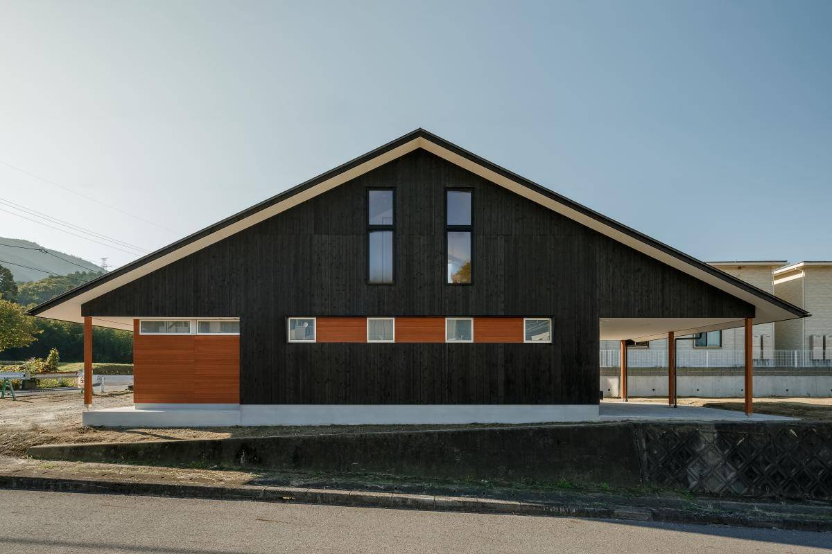 本計画地は道路との間に高低差があり、敷地内に農業用水路が渡り、南側には3階建て相当のアパートが建っているという悪条件の敷地でした。そこで本計画では崖地条例と用水路にあたらない位置に建物を配置し、横幅の広い半平屋でどっしりとした切妻屋根の住まいを計画しました。