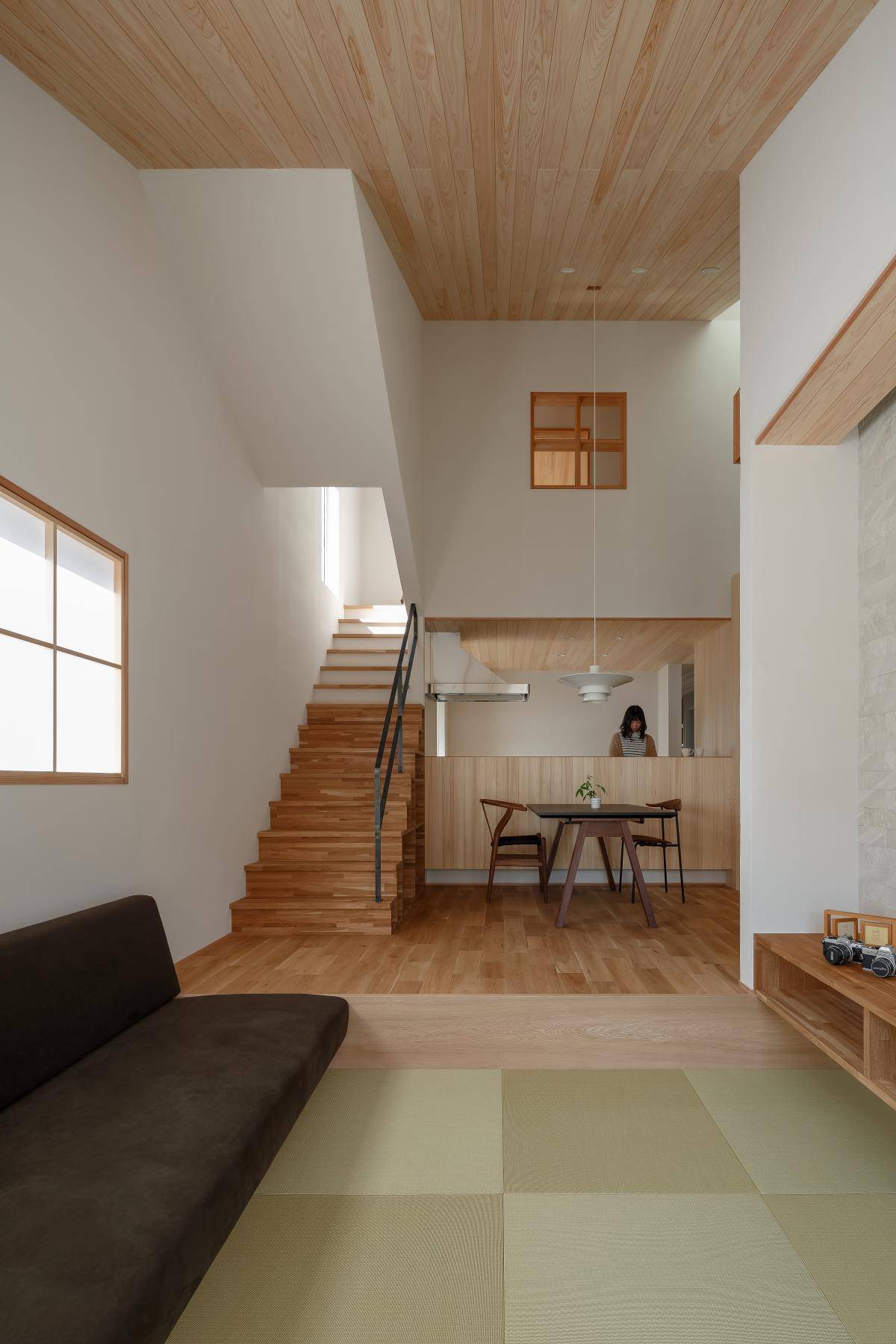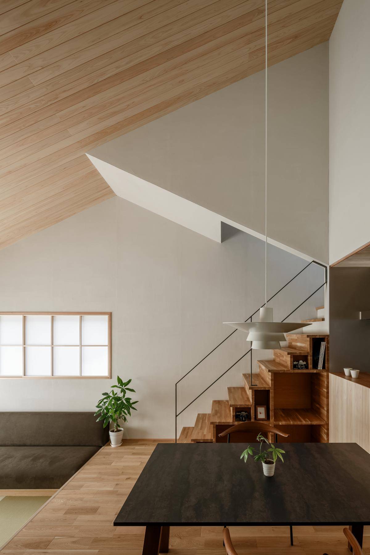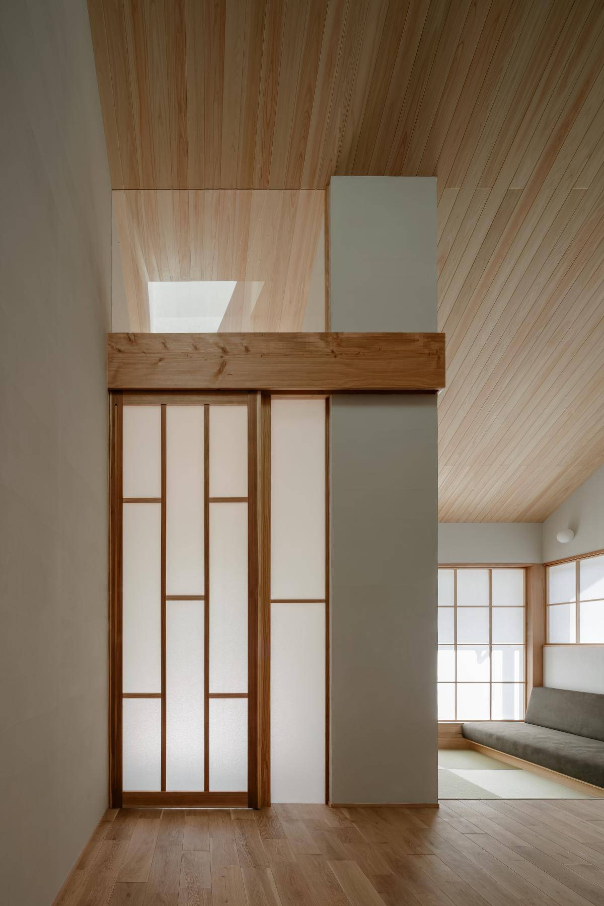 敷地条件から敷地の東側に建物を寄せ、あえて西側にあたる奥に駐車スペースを設けることで、広いプライベートな広場を確保しました。日中、光が入りづらい敷地条件を考慮し平屋部分を生かした天窓を設け、内部の色調は白色を基調とした左官や羽目板に限定し、窓辺には光を反射させる障子を設けることで、少量の光でも空間が明るくなる工夫を行いました。